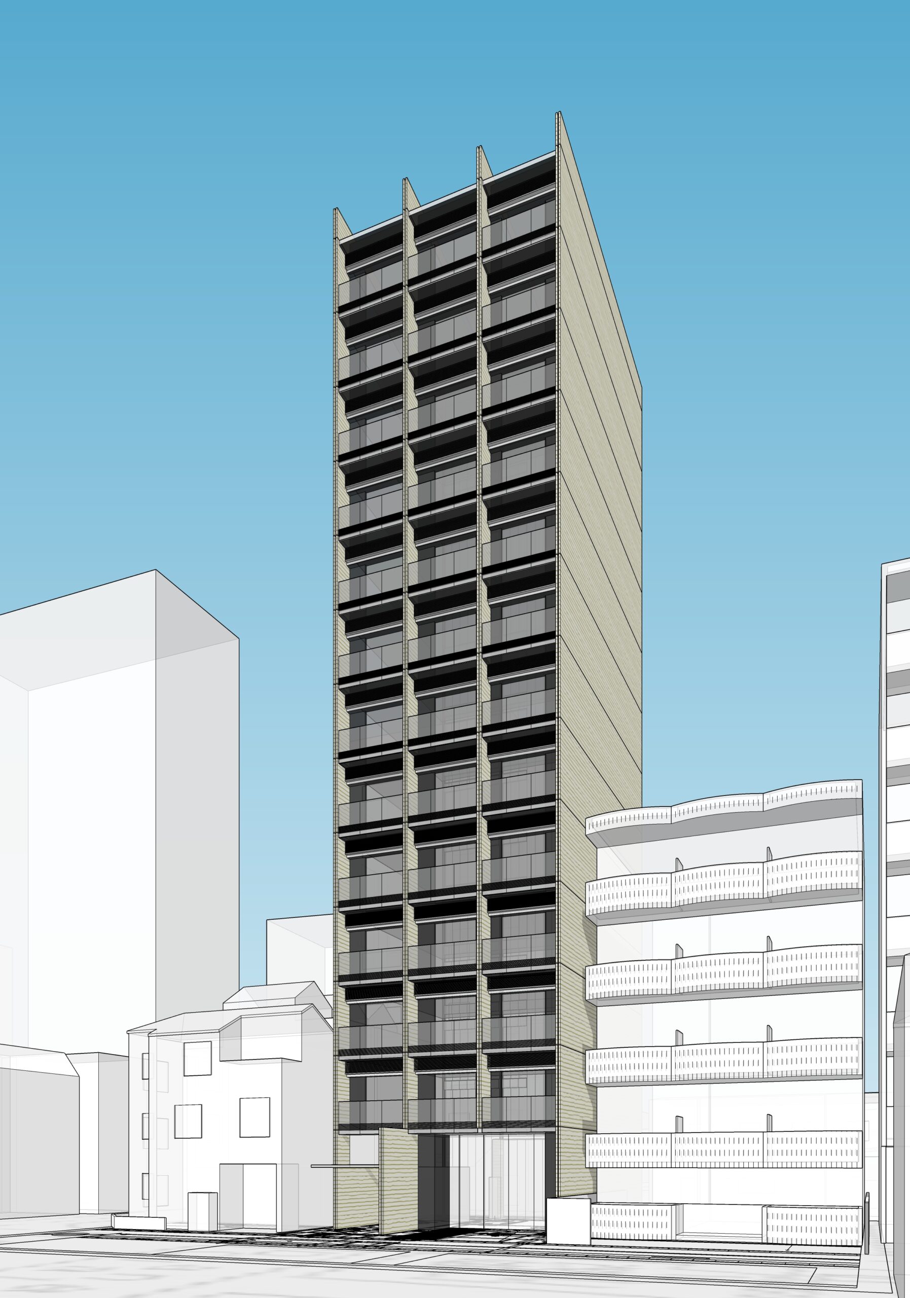 本計画では、敷地条件により細長く立ち上がる建築ボリュームを前提に、外観を平面的なファサードとしてではなく、立体的な構成として捉えている。正面は階の積層による水平性を基調としつつ、側面には屋外階段を内包した厚みのあるボリュームを与えることで、建築全体に明確な奥行きをもたらした。妻側に配置された階段は、機能的要請から生まれた要素でありながら、外観を分節する立体的な輪郭として作用している。正面・側面・裏側のいずれか一面に依存することなく、それぞれの面が異なる役割を担いながら全体として成立する構成を目指した。都市の中で多方向から視認される建築として、ボリュームの重なりや陰影によって、距離や視点に応じた多層的な表情を生み出している。