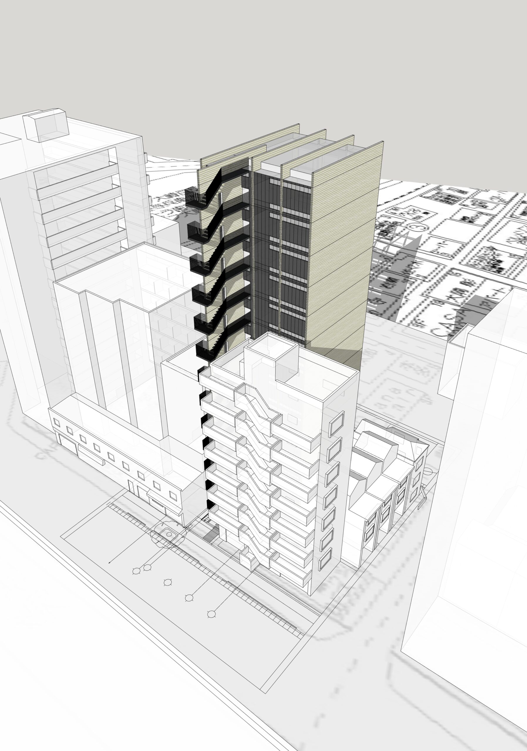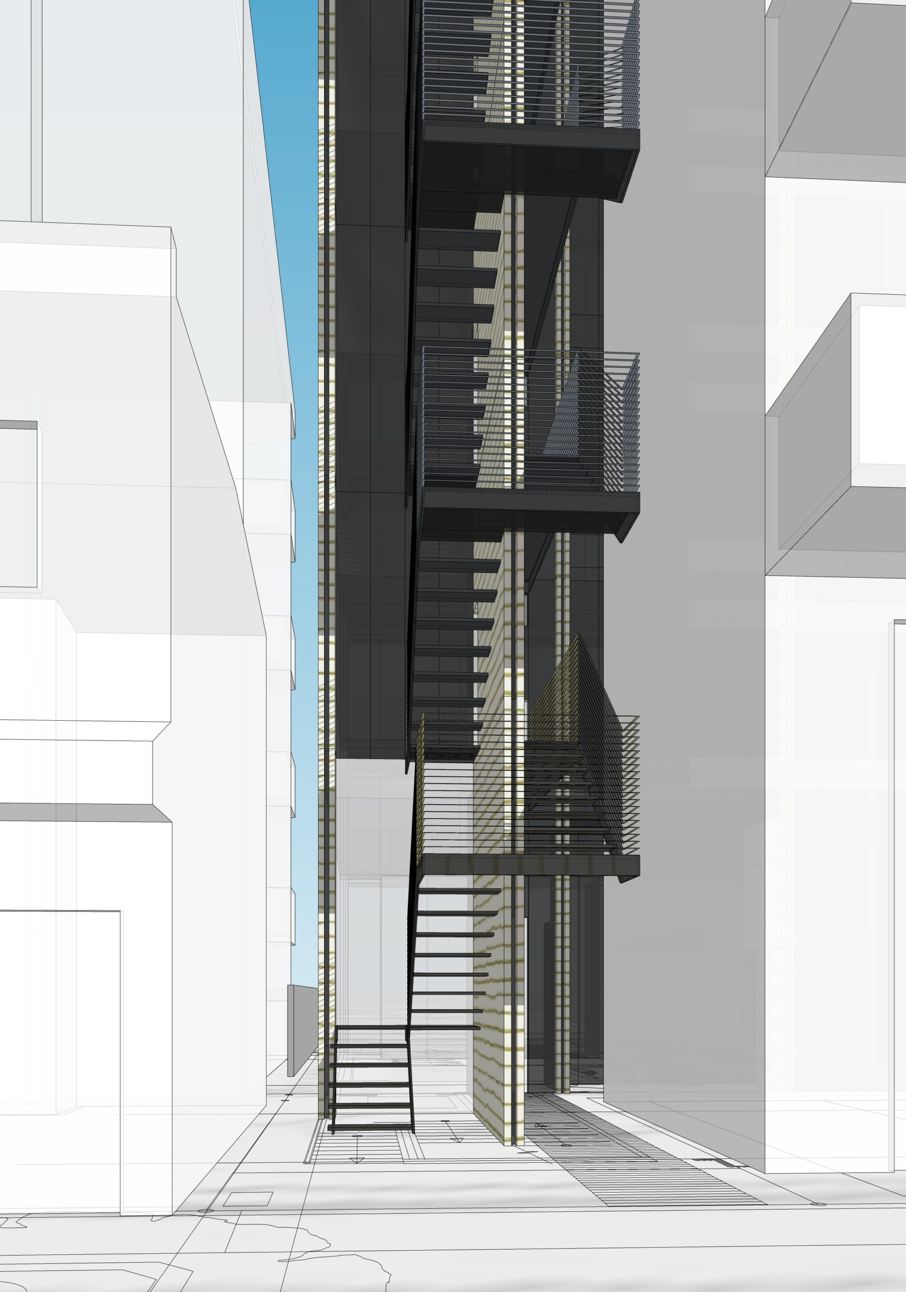 本図は、屋外階段を建築ボリュームの一部として組み込んだ構成を示している。階段を単に付加するのではなく、建物の妻側に沿って立体的に積層させることで、ボリューム全体の分節と外形の輪郭を明確にしている。階段の配置によって生まれる凹凸は、周囲の建物との関係性を調整すると同時に、建築に奥行きのある立体感を与える役割を担う。正面の構成をそのまま裏側へ展開するのではなく、必要な要素のみを抽出して組み込むことで、正面性に依存しない全体構成を成立させている。機能的必然から生まれる要素を、建築の形態そのものに統合することで、裏側においても意図の読み取れる建築ボリュームを目指した。
