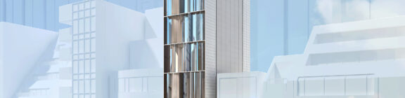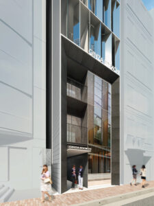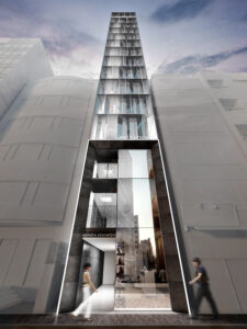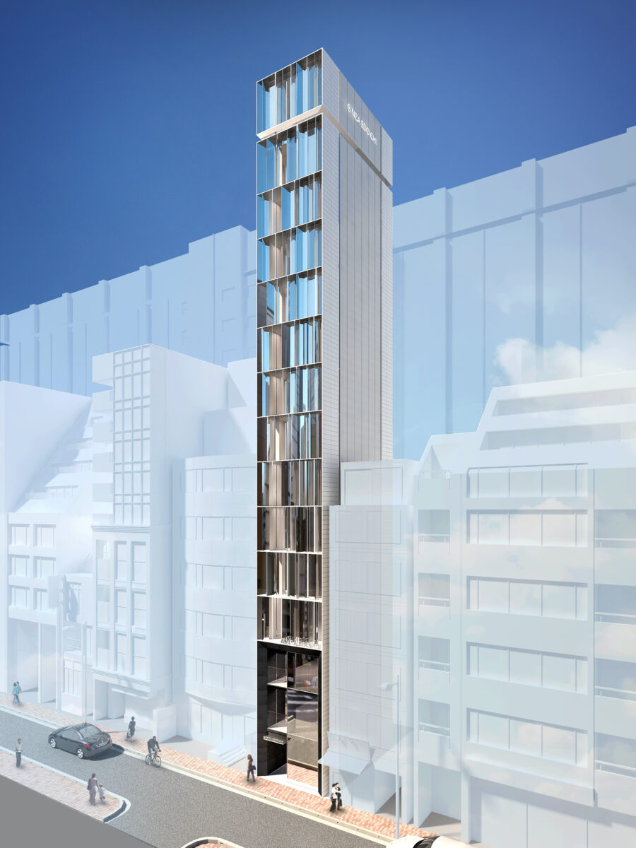 銀座の交差点に、空へひらかれたゲート状の鉄骨フレームが立ち上がる。塔状比の高いボリュームは、時刻歴応答解析で風と地震を読み解きながら、街のきらめきを受け止める器となる。ファサード全面に配した繊細な縦フィンは、熱反射ガラスと一体で日射を制御しつつ、歩行者の視線を上空へ導く光のストリングスとして機能する。昼は縦方向の陰影が路地のリズムを刻み、夜はフィン先端に仕込まれた照明が、銀座の夜景に新たな層を重ねる。構造体と環境装置が重なり合うことで、建築そのものが都市のスケールで呼吸するファサードとなることを目指している。人の流れと光の流れが交差するその瞬間、ゲートをくぐる行為自体が銀座の新しい体験となる。