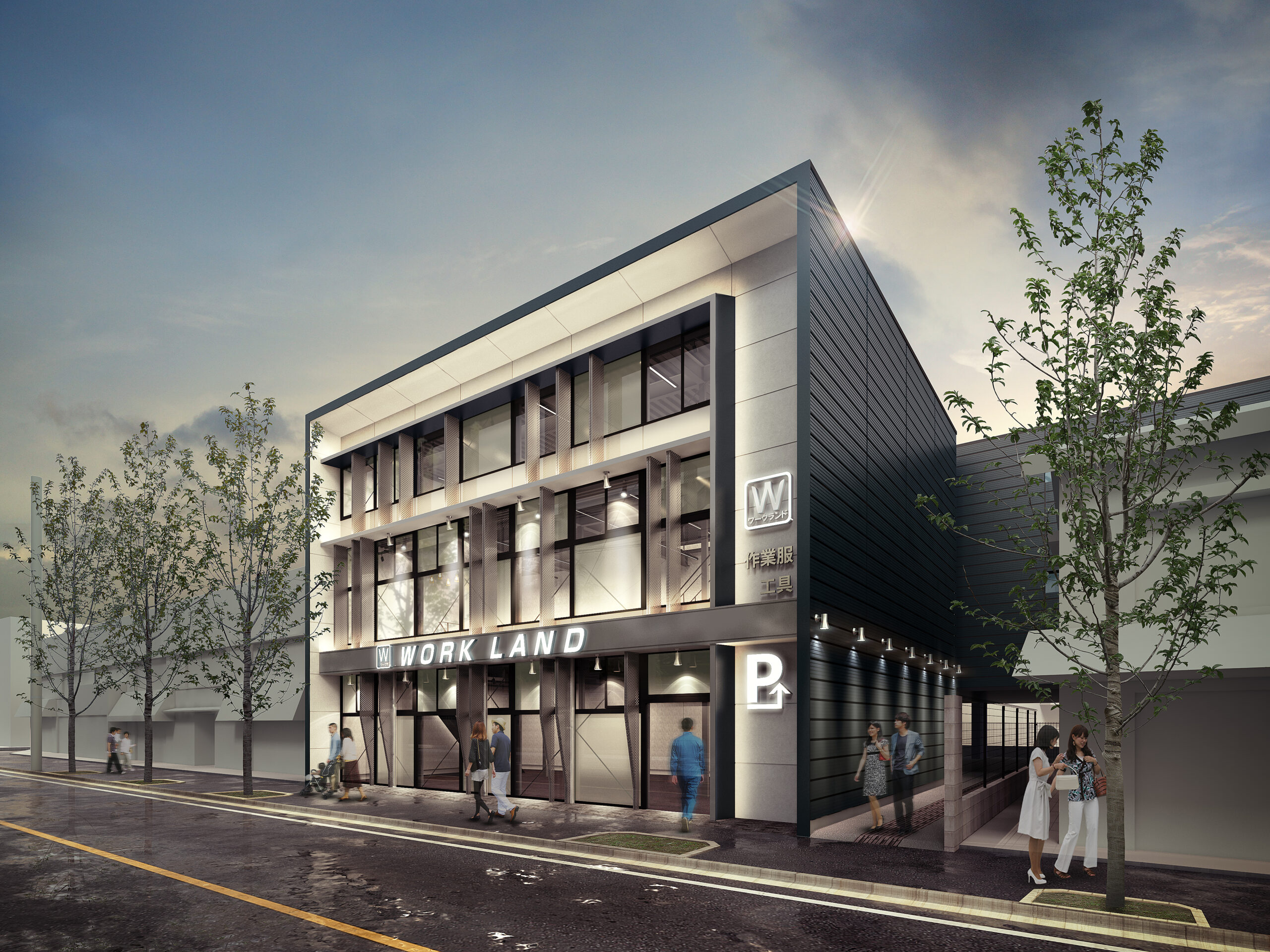 ロードサイドに対して全面ガラスと水平の庇サインを突き出し、走行中の視線を捉える構成としている。黒いフレームで3層を一体に束ね、上階のストックまで含めて商品の量感と活気がそのまま街並みに現れるよう計画した。内部のライン照明は棚と通路を強調し、夜間には建物全体を光るショーケースへと変化させる。周辺の低層店舗街のスケールを保ちながら、ブランド拠点としての存在感を際立たせている。大きく描いた店舗名と駐車場サインは車利用客に分かりやすく、通りからそのまま引き込むゲートとなる。開放的な1階は街路との視線を遮らず、日常の風景の中で働く人と来客の姿が重なり合う、開かれたワークウェアの専門店を目指している。