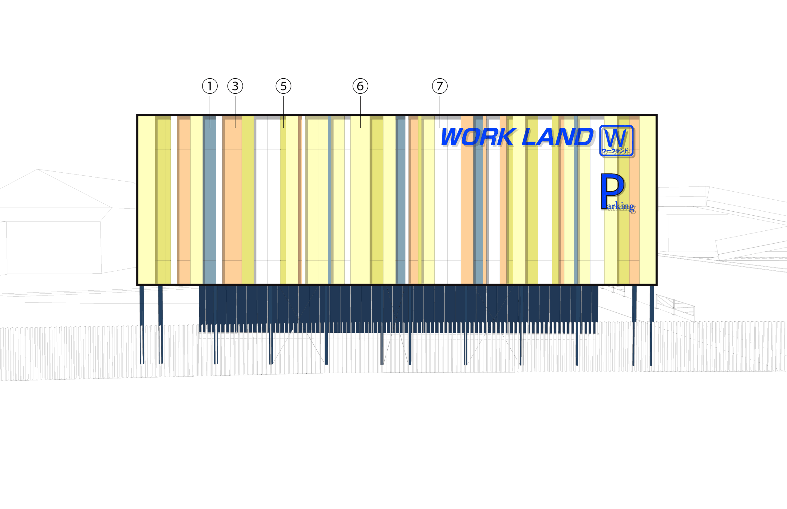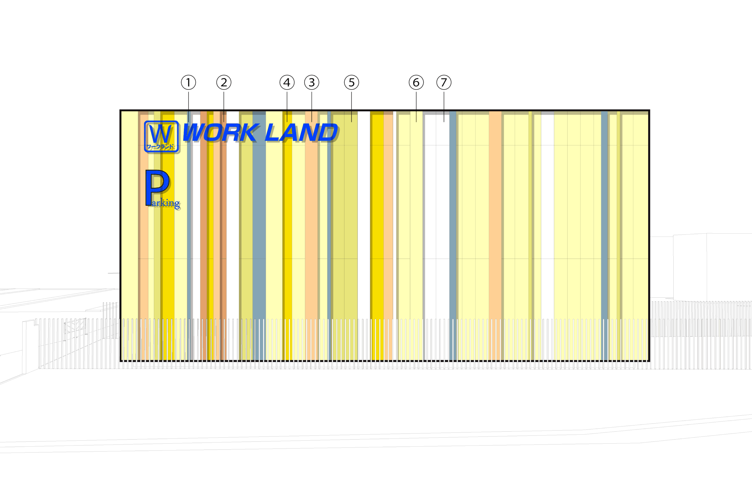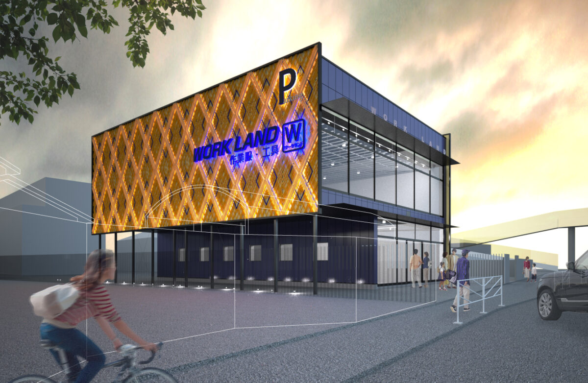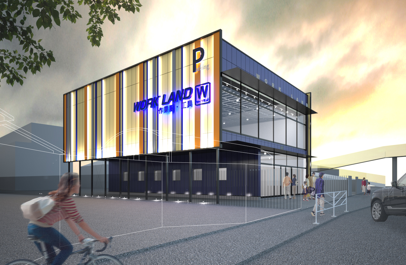 ワークランド横浜原宿店は、横浜市戸塚区の幹線道路沿いという交通量の多い立地条件を最大限に生かし、作業服から日常着、工具まで幅広い商品を扱うブランドの旗艦店として計画された。車両の往来が絶えない環境においては、歩行者よりもドライバーの視線が主要な情報取得源となるため、建物そのものを大きな看板として機能させる外観構成を採用。