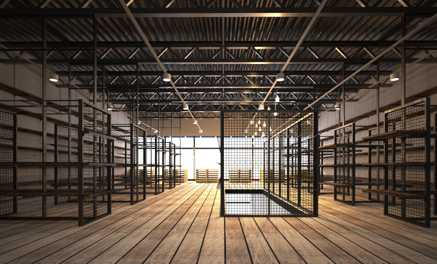 内装は、スケルトン仕上げが特徴で、天井の鉄骨と配線をあえて見せることで、ラフでインダストリアルな雰囲気を演出している。床は無垢材のような温かみある木質仕上げで、無機質な鉄材と対照的。これにより冷たくなり過ぎず、居心地のバランスを保っている。空間中央には金属フレームとメッシュで構成された区画が配置され、什器や棚と合わせて、商品や作品の展示・保管・撮影背景として多用途に使える構成になっている印象。視線が抜ける開放的なレイアウトでありながら、ゾーニングのしやすさと柔らかい分節が可能で、クリエイティブな作業にも向く。