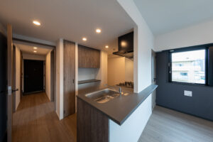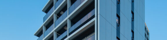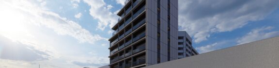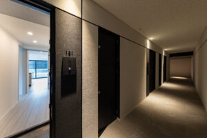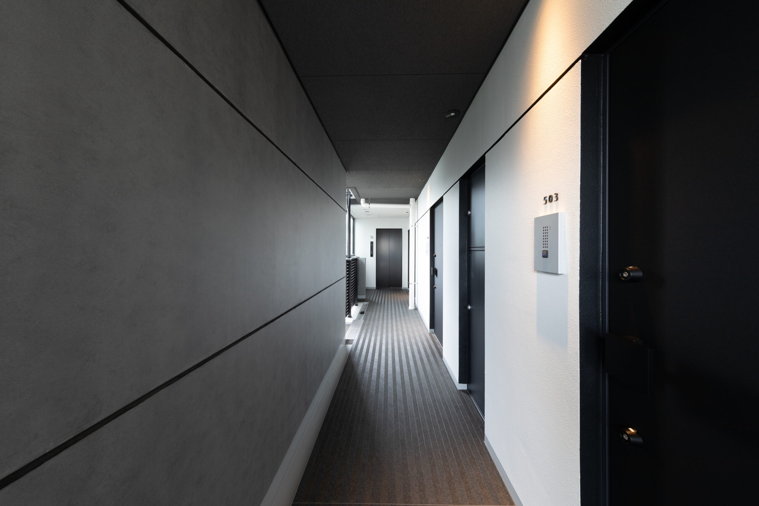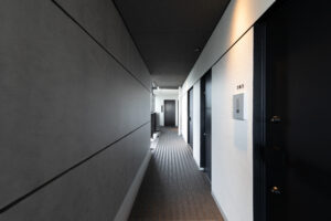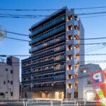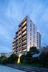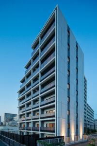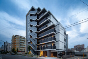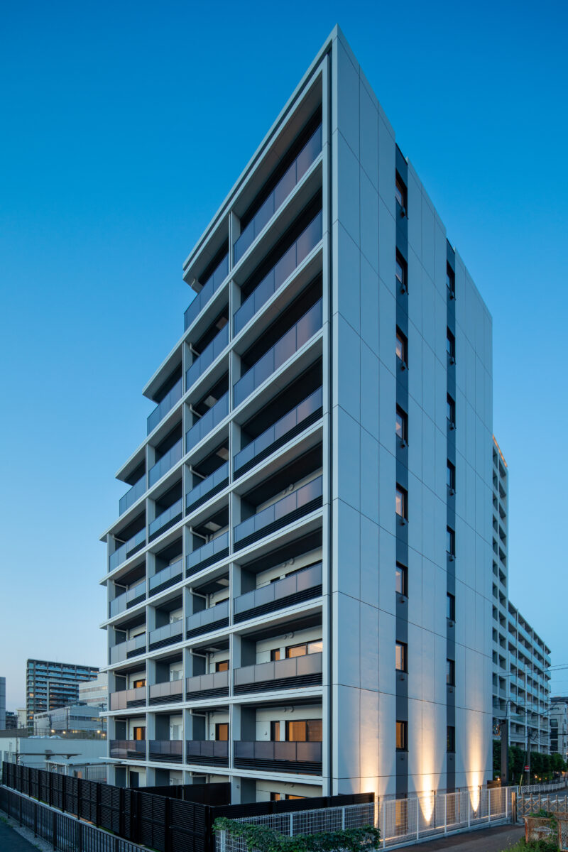限られた予算条件のもとで、いかに建築としての質を高められるか。本計画では、特定の素材や要素に依存するのではなく、素材・色彩・目地の取り方、そして光の与え方までを含めた全体の統合によって、高い意匠性を実現することを目指した。外壁やバルコニーの水平ラインは、色調を抑えた仕上げと細やかな目地計画によって整理され、建物全体に端正なリズムを与えている。夜間には控えめに仕込まれた照明が立体的な陰影を浮かび上がらせ、昼とは異なる表情を街に向けて描き出す。個々の要素は決して過剰ではないが、それらが重なり合うことで、コストを超えた奥行きと品格を備えた建築像を形づくっている。