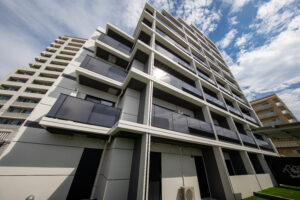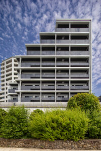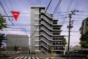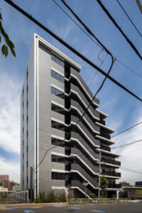法規制に沿って外形を丁寧に整えたうえで、バルコニーや屋外廊下、階段といった機能要素を的確に配置している。本計画では、それらを建物の外側に付着する単なる付加物として扱うのではなく、外観の表情をつくる重要な構成要素として積極的に位置づけた。