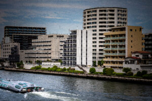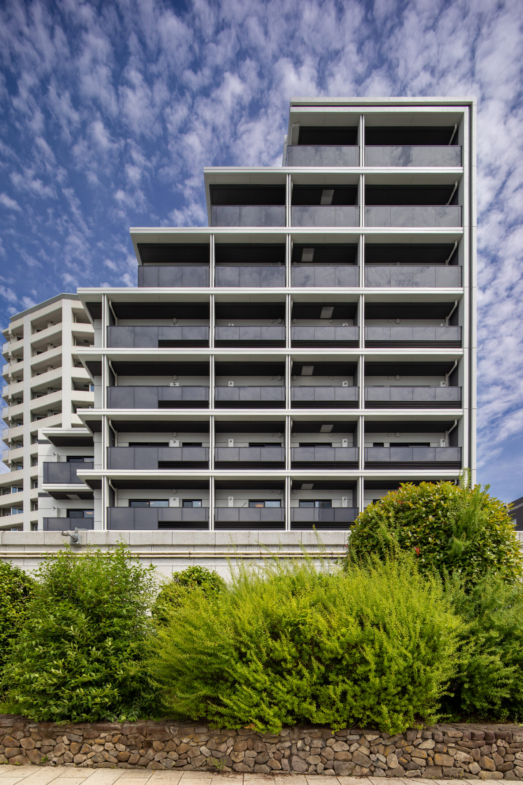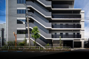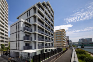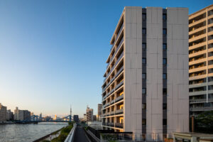 こうした周辺環境に応答するため、建築は隅田川に向けて大きく開いたバルコニーを計画し、水景と呼応する眺望の豊かさとプライバシーの確保を両立させた。また、街路樹と響き合う植栽計画や落ち着いた素材・色彩構成により、建物が都市のランドスケープと滑らかに絡み合う関係性を生み出している。