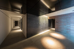 突き当たりの壁には、緑と補色関係をなす赤色タイルを配し、空間の奥に強い印象を与えるアクセントを形成。外部の静かな緑道から内部の迎えの空間へと、明確な物語性を持って人を導くエントランスを目指した。