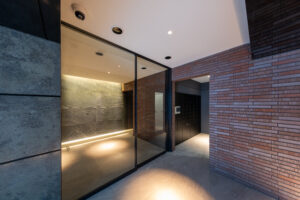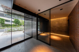 江東区では歩道沿いに緑道の整備が進み、街路樹が清澄エリアの落ち着いた街並みを豊かに彩っている。本計画ではその都市環境に積極的に呼応し、前面に植栽を計画することで、街全体のウォーカビリティを高める一端を担うエントランスとした。
