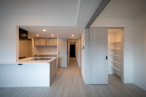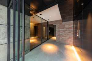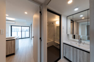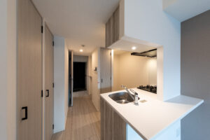 一方、住戸の玄関は都市側に計画し、街の動きに触れながら住まいへと帰るプロセスを大切にした。ドアを開け、廊下を抜け、室内に一歩踏み込むと、都市の喧騒から隅田川の穏やかさへと心がゆるやかに切り替わる。そのわずかな“間”が、忙しい都心生活にふっと余白を生み、水辺の静けさを受け止める準備を整えてくれる。都市と自然が交差するこの場所だからこそ生まれる、豊かな住まいの体験を目指した。
