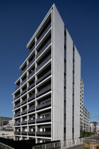 東側では、屋外廊下と階段によって生まれる水平ラインがファサードに軽やかなリズムを与え、清澄白河に広がる端正で落ち着いた街並みの風景と呼応する。一方、西側は隅田川に向かってバルコニーを開き、その持つ水平性をマリオンにより繊細に分節することで、外観に奥行きと陰影をもたらしている。これにより、機能要素が景観のノイズとなることなく、むしろ建築の品格と落ち着きを高めるデザインとして統合されている。