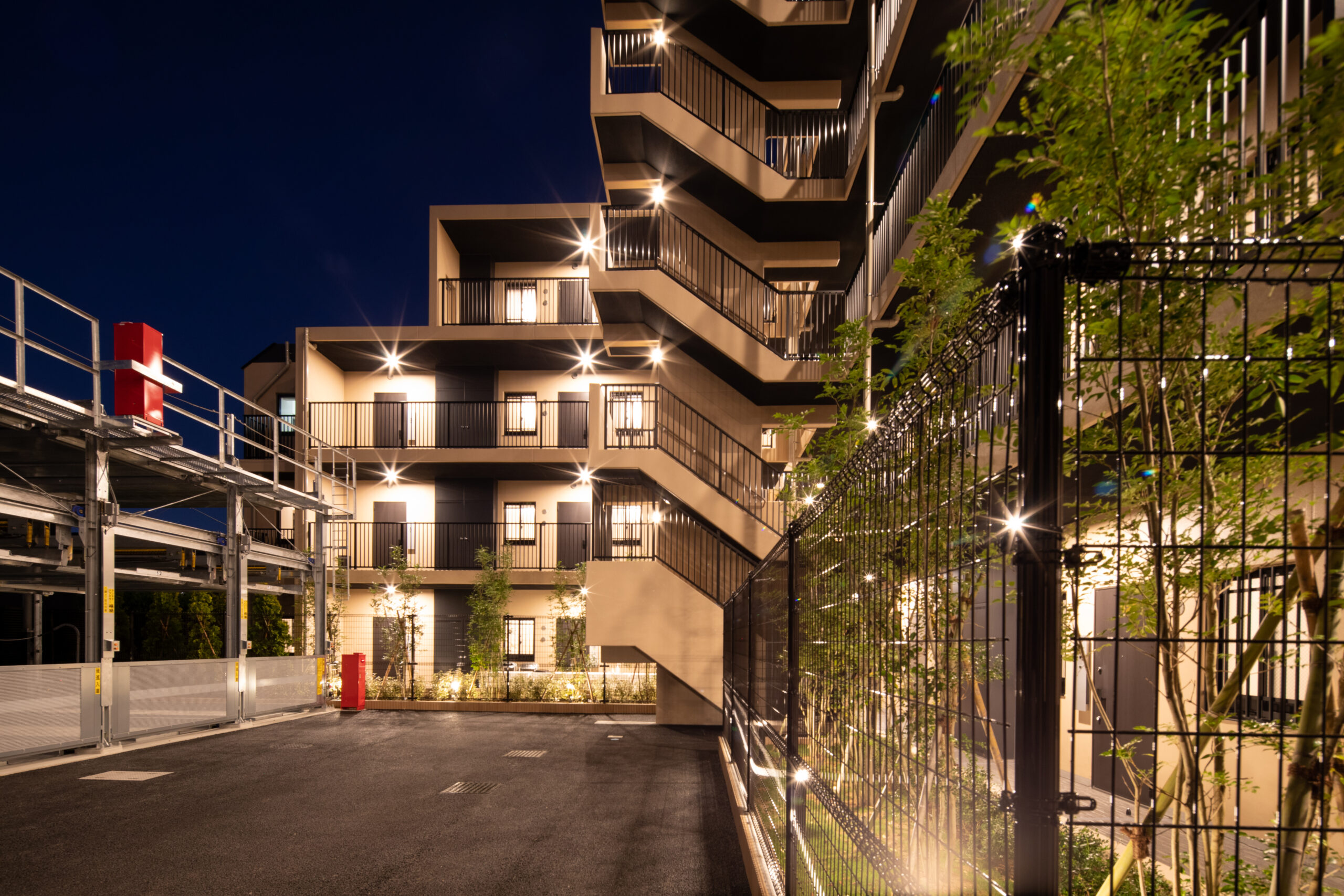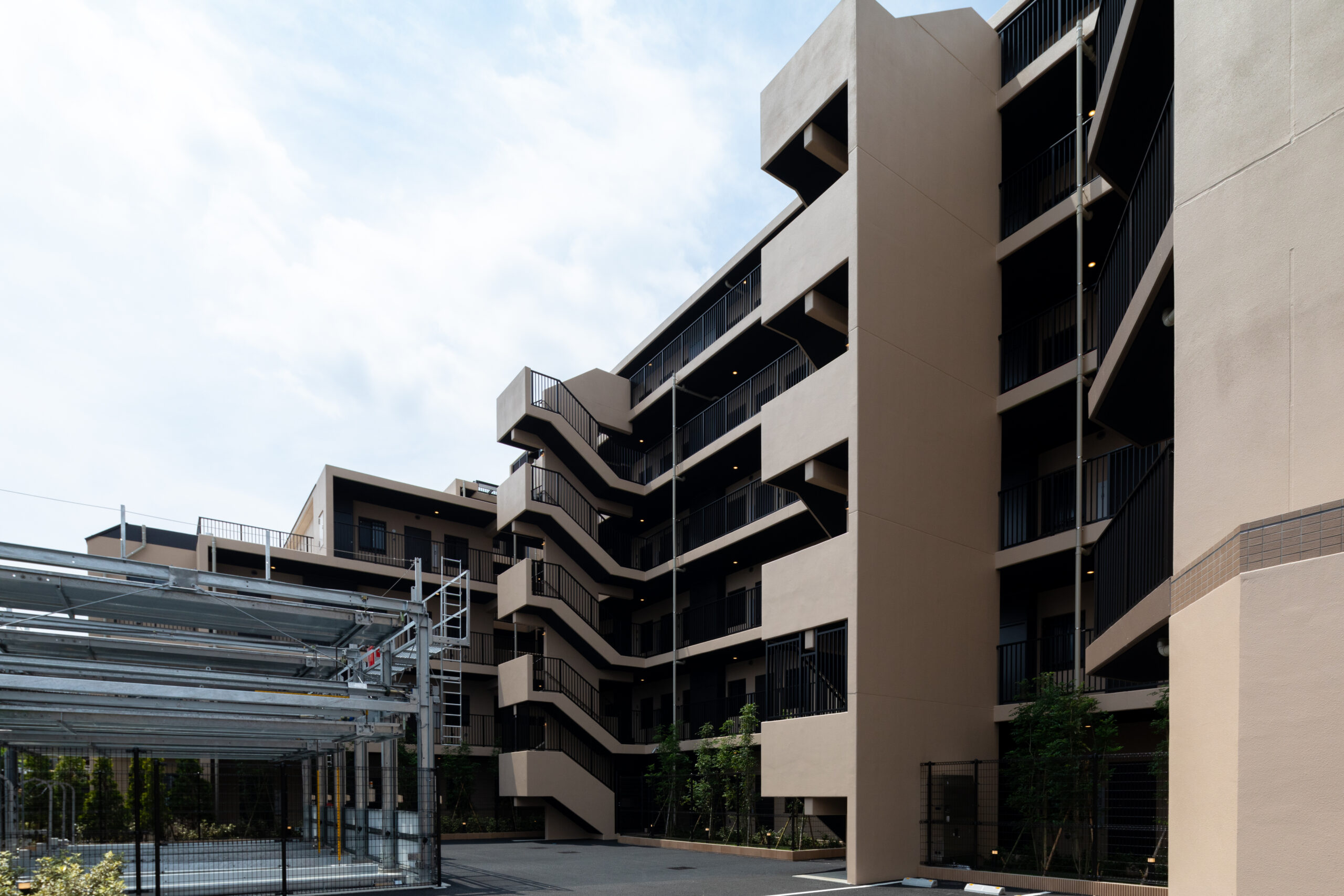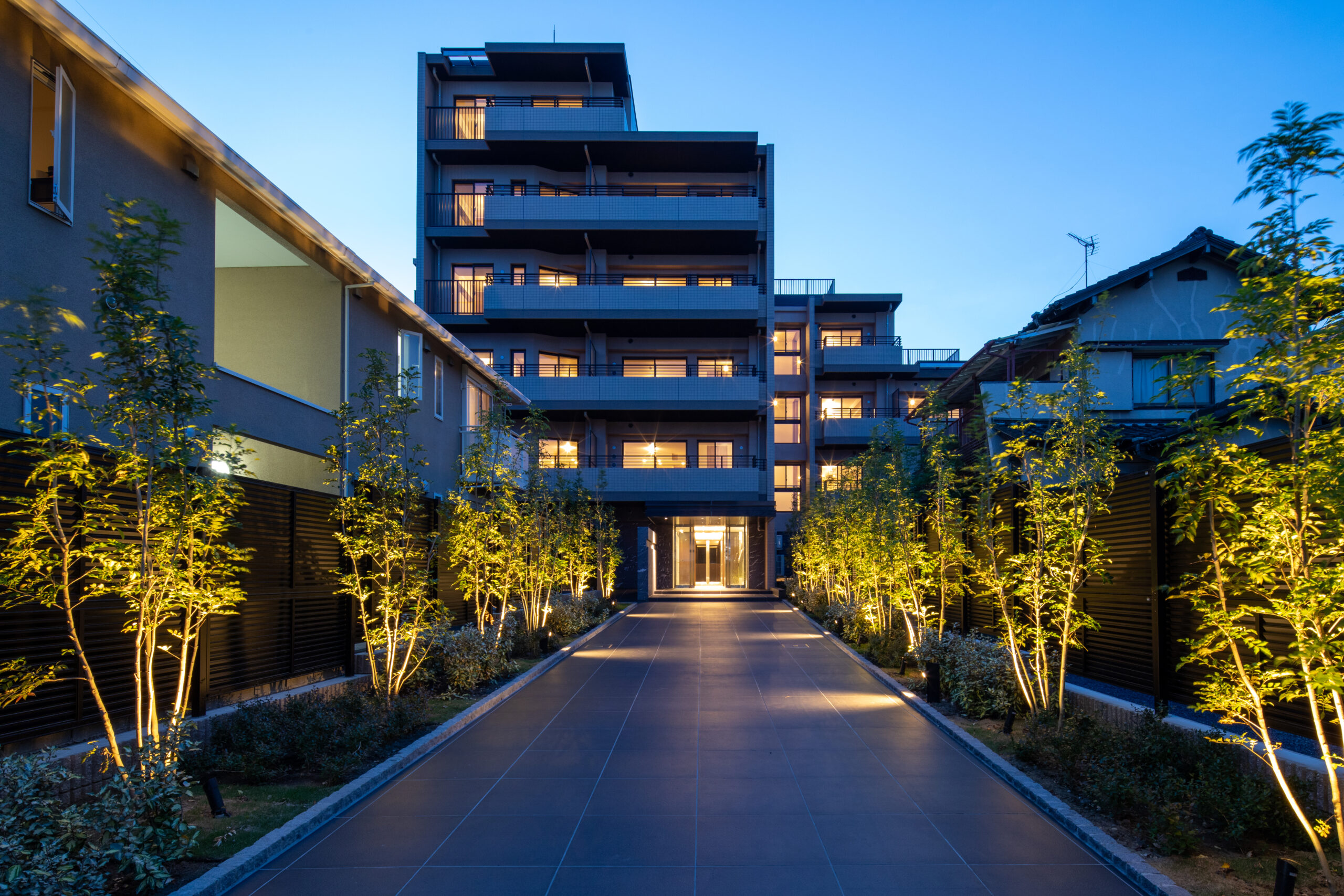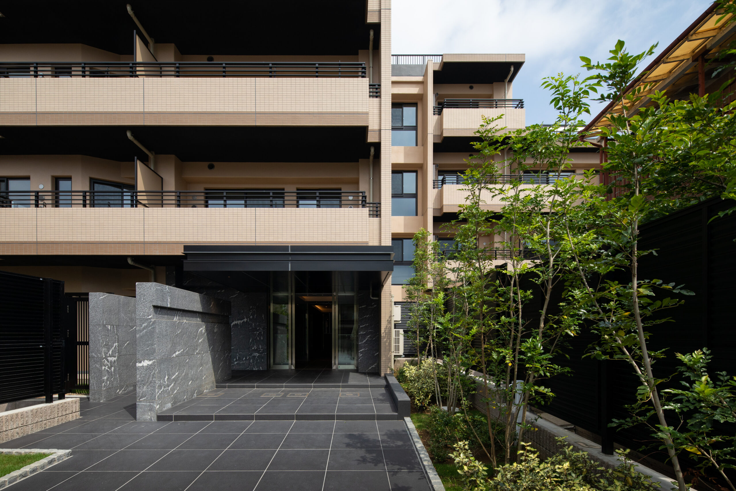 本プロジェクトは、都市の利便性と落ち着いた住環境を両立させることを目的に計画された集合住宅です。敷地奥へと伸びるアプローチ空間には、多様な樹種による豊かな植栽を設け、外部の喧騒から緩やかに切り離された静穏な空気を生み出しています。四季の移ろいが感じられる緑の連なりは、居住者を私的な領域へと導くプロローグとなり、帰宅時に心を整える“迎えの仕掛け”として機能します。エントランスは重厚な石壁と深い庇により、建物の品格と安心感を象徴する堂々とした表情を形成しました。外観は水平ラインを基調に端正な構成とし、バルコニー奥行きや手すりの陰影が立体的で落ち着きある佇まいをつくり出しています。周辺の低層住宅地との調和を図りながら、採光・通風・眺望を最大限に確保する住戸計画を行うことで、日々の暮らしに上質な快適性を提供。アプローチ、植栽、建築が一体となり、住む人に長く愛される住環境を実現しています。