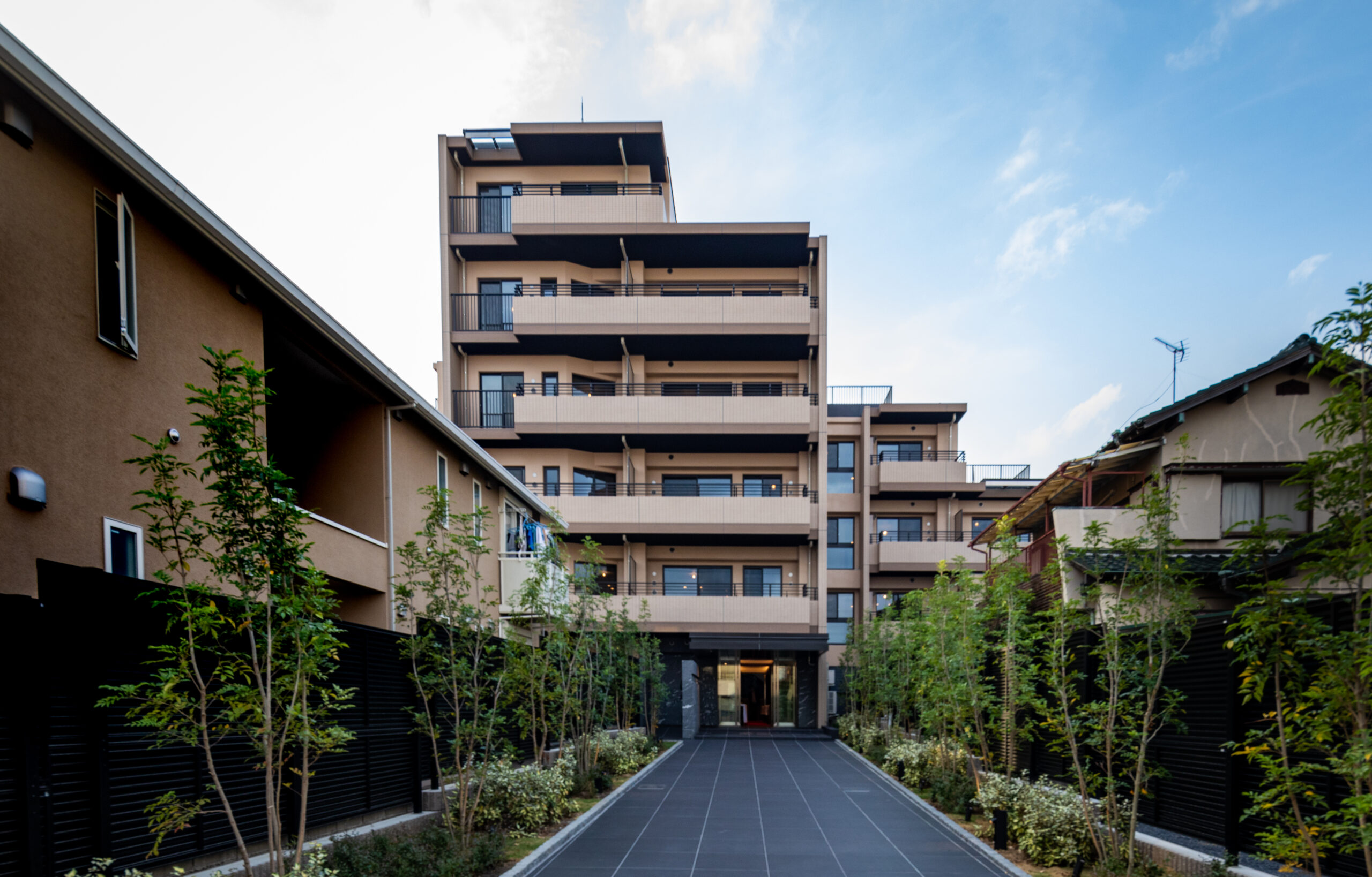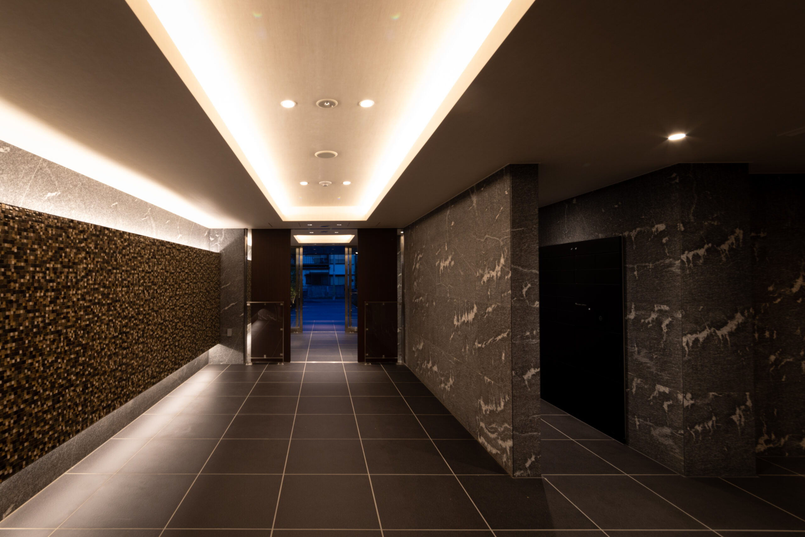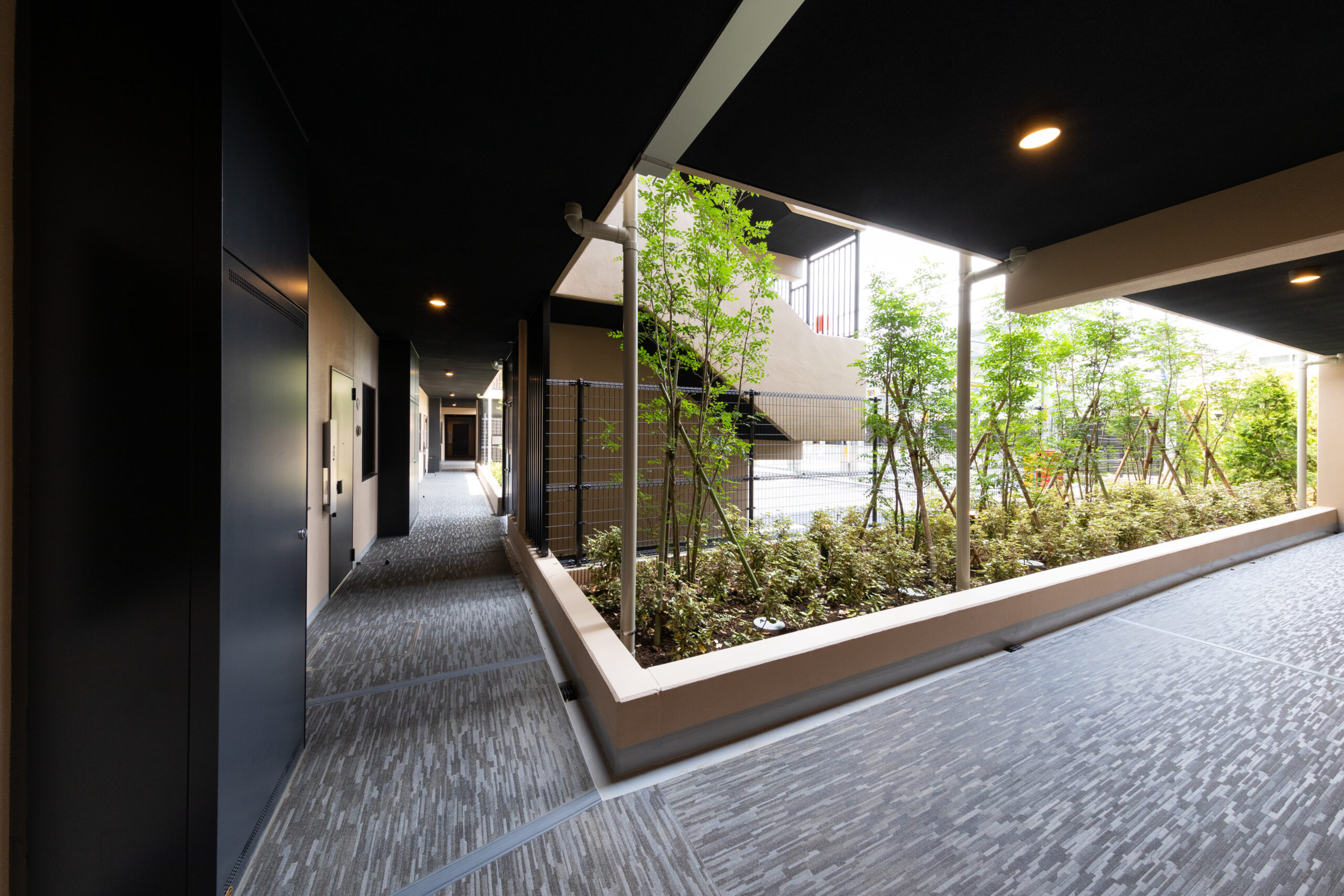 本プロジェクトは、都市の利便性と落ち着いた住環境を両立させることを目的に計画された集合住宅です。敷地奥へと伸びるアプローチ空間には、多様な樹種による豊かな植栽を設け、外部の喧騒から緩やかに切り離された静穏な空気を生み出しています。四季の移ろいが感じられる緑の連なりは、居住者を私的な領域へと導くプロローグとなり、帰宅時に心を整える“迎えの仕掛け”として機能します。エントランスは重厚な石壁と深い庇により、建物の品格と安心感を象徴する堂々とした表情を形成しました。外観は水平ラインを基調に端正な構成とし、バルコニー奥行きや手すりの陰影が立体的で落ち着きある佇まいをつくり出しています。周辺の低層住宅地との調和を図りながら、採光・通風・眺望を最大限に確保する住戸計画を行うことで、日々の暮らしに上質な快適性を提供。アプローチ、植栽、建築が一体となり、住む人に長く愛される住環境を実現しています。