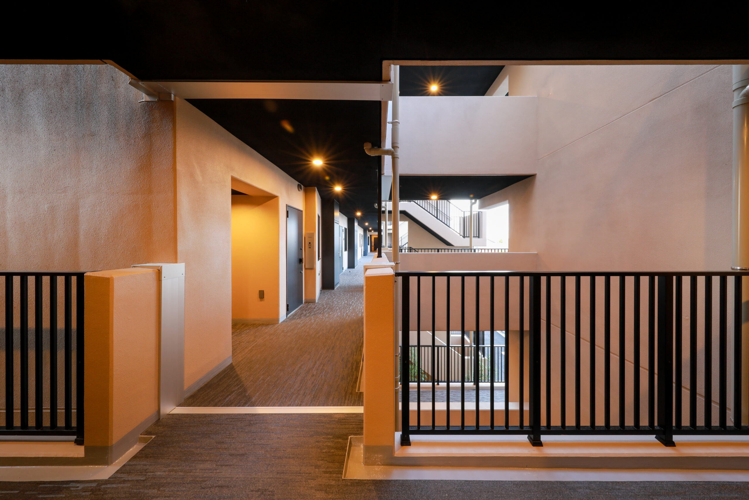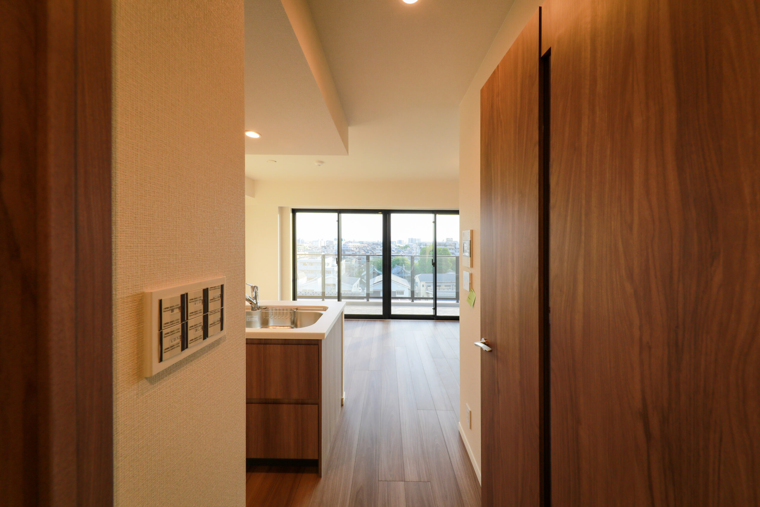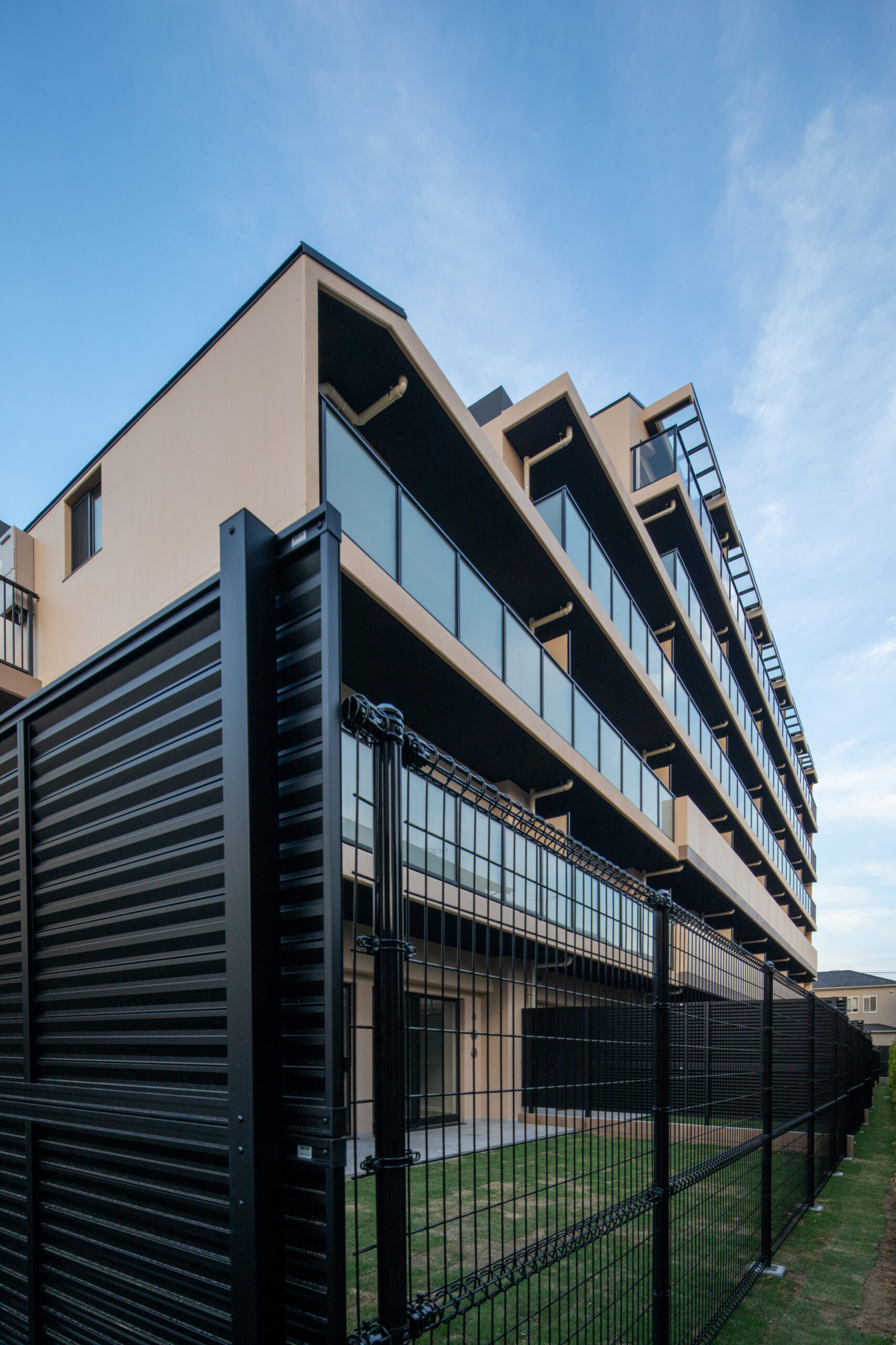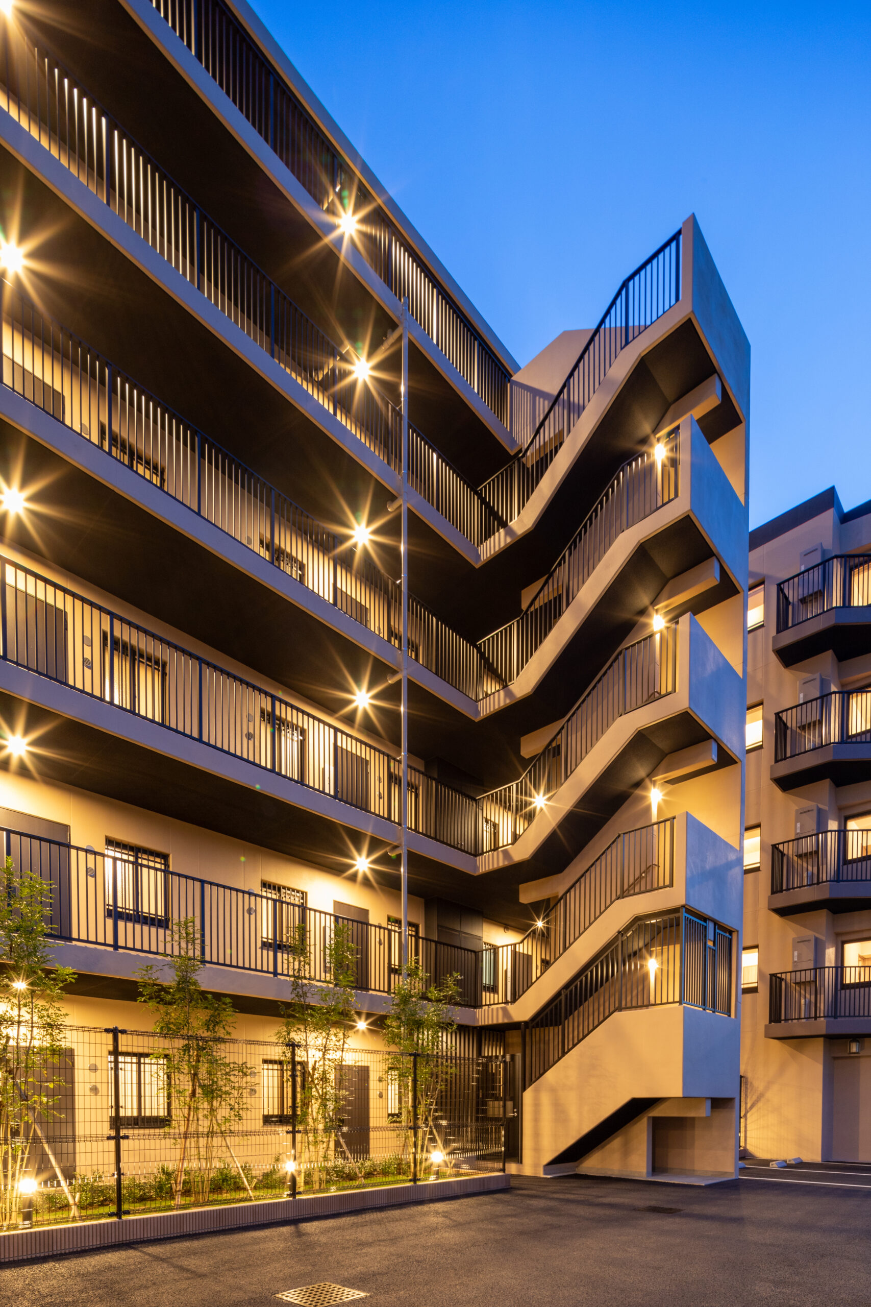 本プロジェクトは、都市の利便性と落ち着いた住環境を両立させることを目的に計画された集合住宅です。敷地奥へと伸びるアプローチ空間には、多様な樹種による豊かな植栽を設け、外部の喧騒から緩やかに切り離された静穏な空気を生み出しています。四季の移ろいが感じられる緑の連なりは、居住者を私的な領域へと導くプロローグとなり、帰宅時に心を整える“迎えの仕掛け”として機能します。エントランスは重厚な石壁と深い庇により、建物の品格と安心感を象徴する堂々とした表情を形成しました。外観は水平ラインを基調に端正な構成とし、バルコニー奥行きや手すりの陰影が立体的で落ち着きある佇まいをつくり出しています。周辺の低層住宅地との調和を図りながら、採光・通風・眺望を最大限に確保する住戸計画を行うことで、日々の暮らしに上質な快適性を提供。アプローチ、植栽、建築が一体となり、住む人に長く愛される住環境を実現しています。