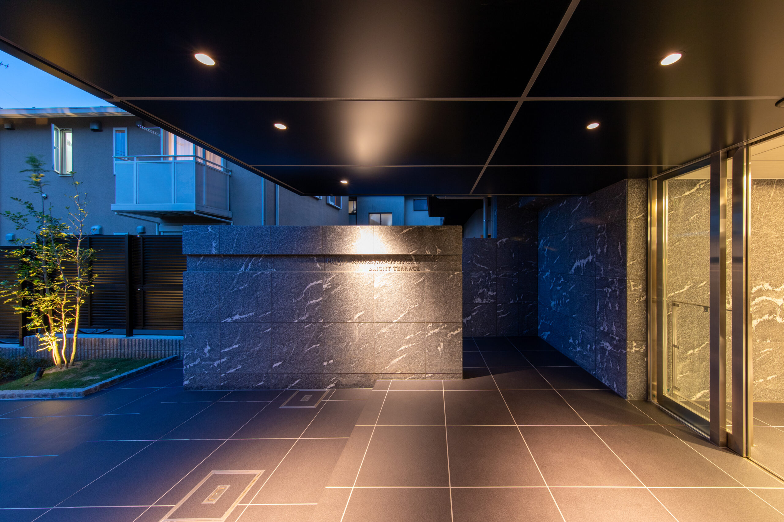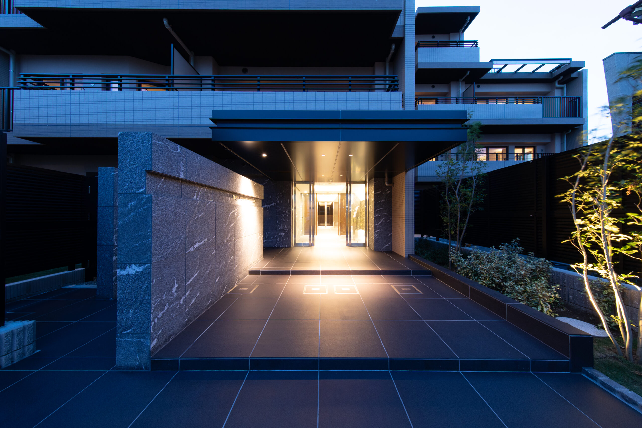 本プロジェクトは、千葉県市川市の南部に位置する行徳に計画された集合住宅である。敷地奥へと伸びるアプローチには背の高い樹種を両サイドに配置し、樹種とアプローチを照らす照明計画を行うことで、外部の喧騒から緩やかに切り離された静穏な空気を生み出した。四季の移ろいが感じられる緑の連なりは、居住者を私的な領域へと導くプロローグとなり、帰宅時に心を整える“迎えの仕掛け”として機能する。エントランスは重厚感のある石壁と深い庇により、建物の品格を象徴する堂々とした表情を形成した。外観は水平ラインを基調に端正な構成とし、バルコニーは躯体手摺、格子状手摺、ガラス手摺を掛け合わせることで立体的で落ち着きある佇まいをつくり出している。周辺の低層住宅との調和を図りながら、採光・通風・眺望を最大限に確保する住戸計画を行うことで、日々の暮らしに上質な快適性を提供。アプローチ、植栽、建築が一体となり、住む人に長く愛される住環境を実現した。
