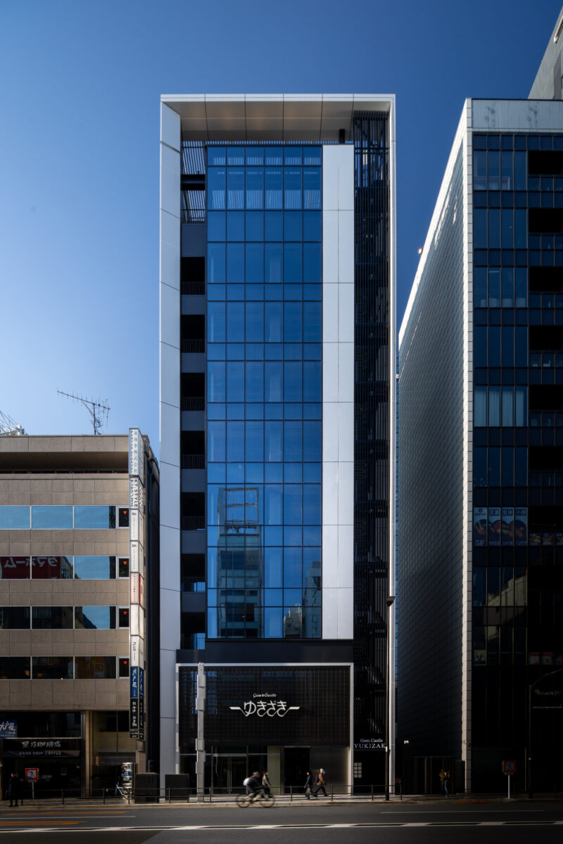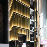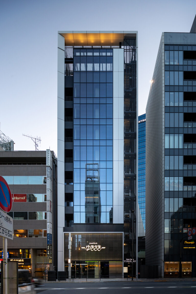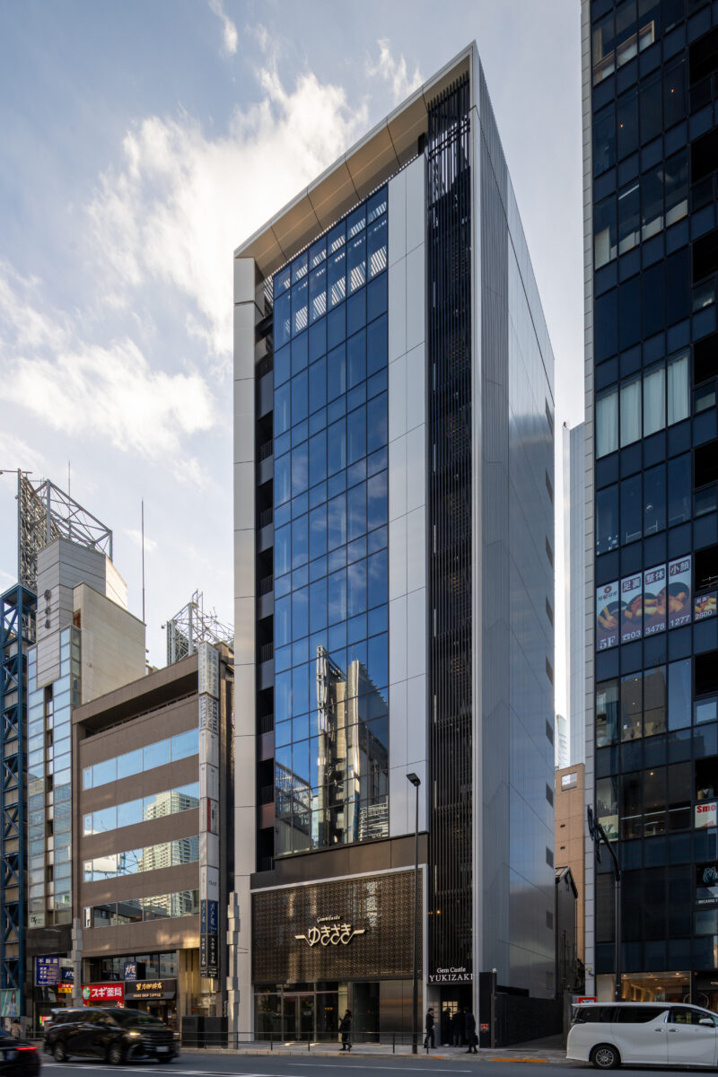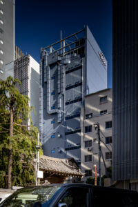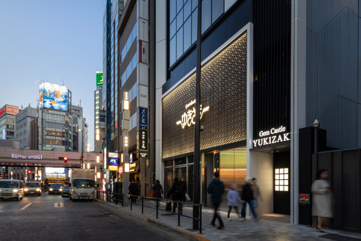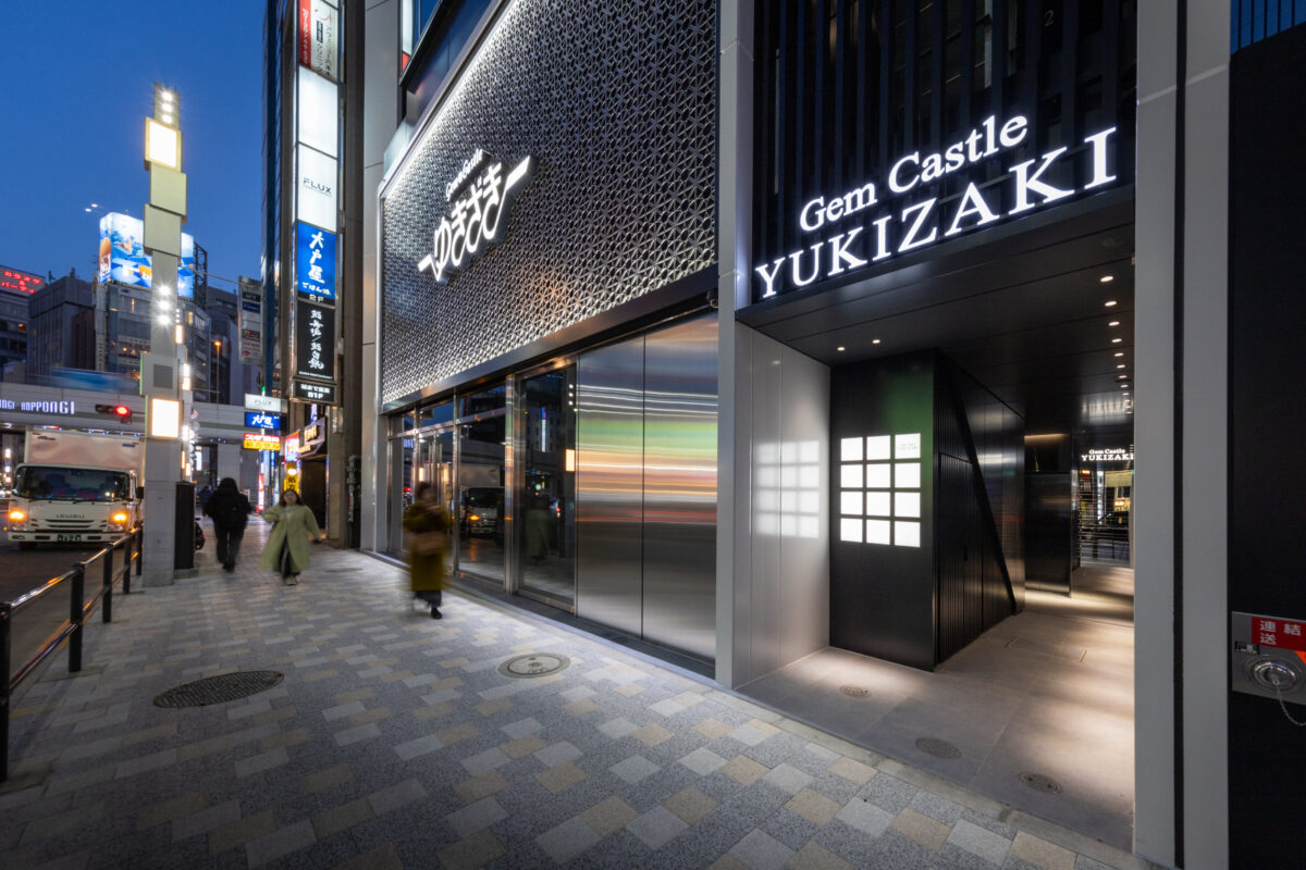六本木の賑わいの中に誕生した本建物は、宝石のような上質さと存在感を街に添えることを目指して計画されたテナントビルである。外観は過度な装飾を排したシンプルな構成としながらも、光の当たり方や見る角度によって印象が変化し、昼と夜で異なる表情を楽しめるデザインとしている。建物は屋上の工作物を含めて一体的にデザインされており、建築と設備の境界を感じさせない統合された外観を形成することで、実際の高さや規模以上の伸びやかさと存在感を生み出している。その結果、都市の中で自然と人の視線を引き寄せる佇まいを実現した。低層部は素材やディテールにこだわり、宝石店の家紋をモチーフとした基壇部によって高級感と個性を表現している。また、歩行者の視線に近いスケールに合わせて繊細な構成とし、足元から豊かな表情を生み出している。エントランスは質感の異なる黒を基調に構成し、重厚さと落ち着きを兼ね備えた空間とすることで、訪れる人を静かに迎え入れる。さらに屋上にはウッドデッキによるルーフトップバーを設け、都市の喧騒から少し離れた特別な時間を過ごせる場を創出している。全体として、都市の中で品格ある存在感を放つ建築を目指した。