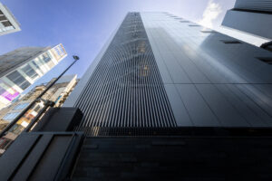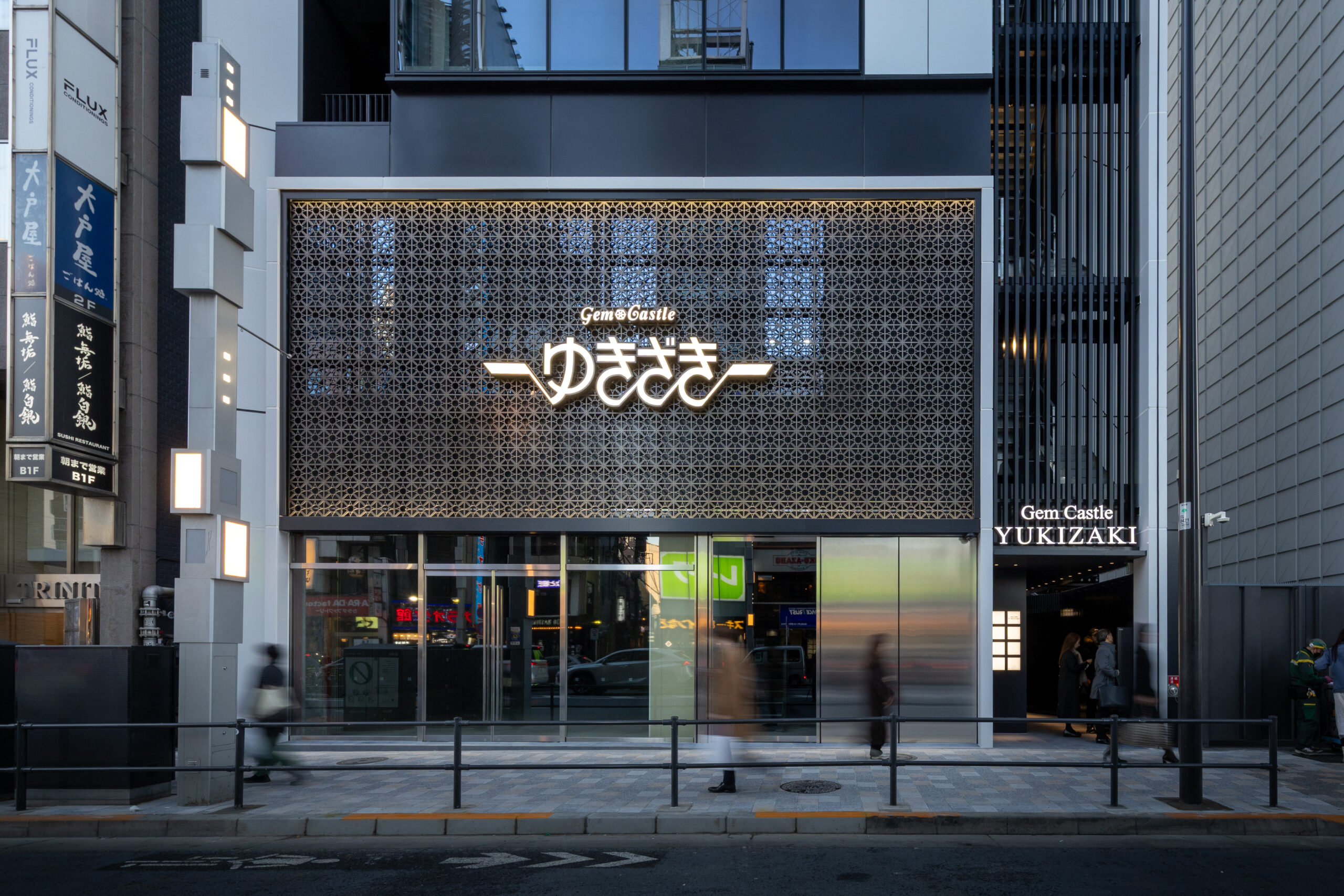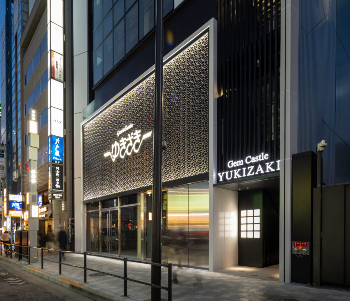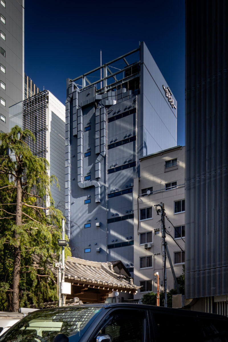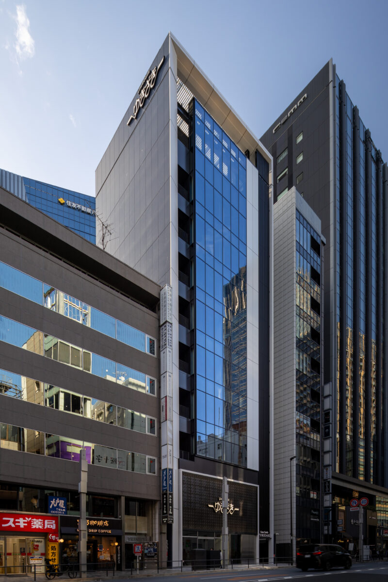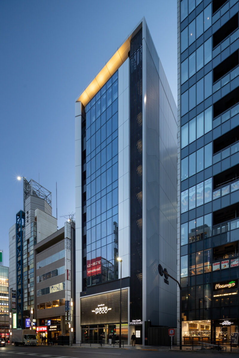 六本木の賑わいの中に誕生した本建物は、宝石のような上質さと存在感を街に添えることを目指して計画されたテナントビルである。外観は過度な装飾を排したシンプルな構成としながらも、光の当たり方や見る角度によって印象が変化し、昼と夜で異なる表情を楽しめるデザインとしている。建物は屋上の工作物を含めて一体的にデザインされており、建築と設備の境界を感じさせない統合された外観を形成することで、実際の高さや規模以上の伸びやかさと存在感を生み出している。その結果、都市の中で自然と人の視線を引き寄せる佇まいを実現した。低層部は素材やディテールにこだわり、宝石店の家紋をモチーフとした基壇部によって高級感と個性を表現している。また、歩行者の視線に近いスケールに合わせて繊細な構成とし、足元から豊かな表情を生み出している。エントランスは質感の異なる黒を基調に構成し、重厚さと落ち着きを兼ね備えた空間とすることで、訪れる人を静かに迎え入れる。さらに屋上にはウッドデッキによるルーフトップバーを設け、都市の喧騒から少し離れた特別な時間を過ごせる場を創出している。全体として、都市の中で品格ある存在感を放つ建築を目指した。