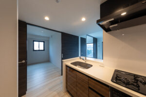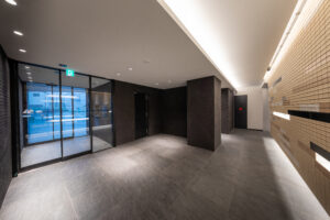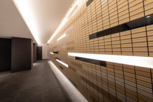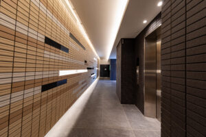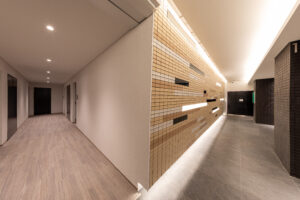 一方で、低層の二棟についてはコンクリート壁式構造を採用することで建物重量の抑制や施工合理性の向上、さらにコスト面での効率化を図っているが、構造形式の異なる建築物が同一挙動を示すことは想定し難いため、接続部にはエキスパンションジョイントを設け、相互の構造体を切り離すことでそれぞれの建物が無理のない形で地震動等の外力を受容できる計画としている。