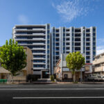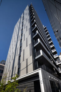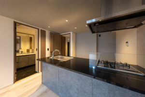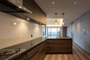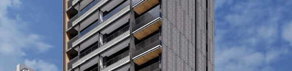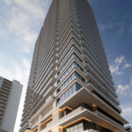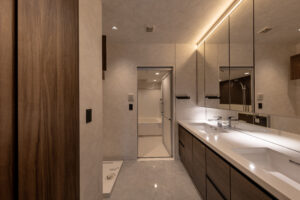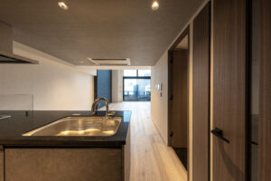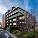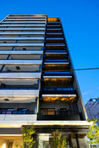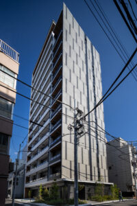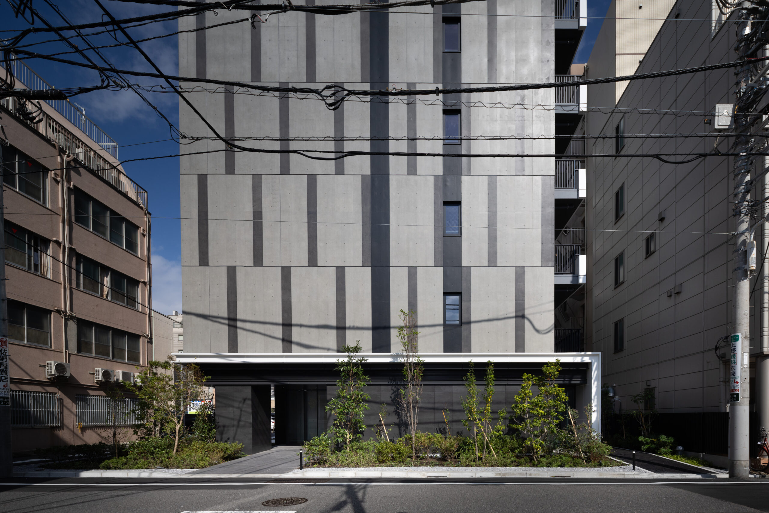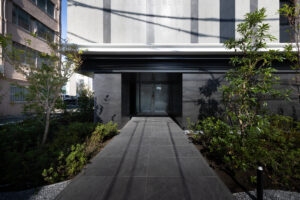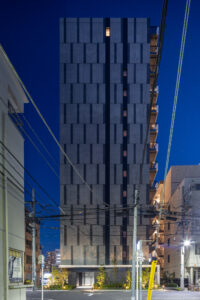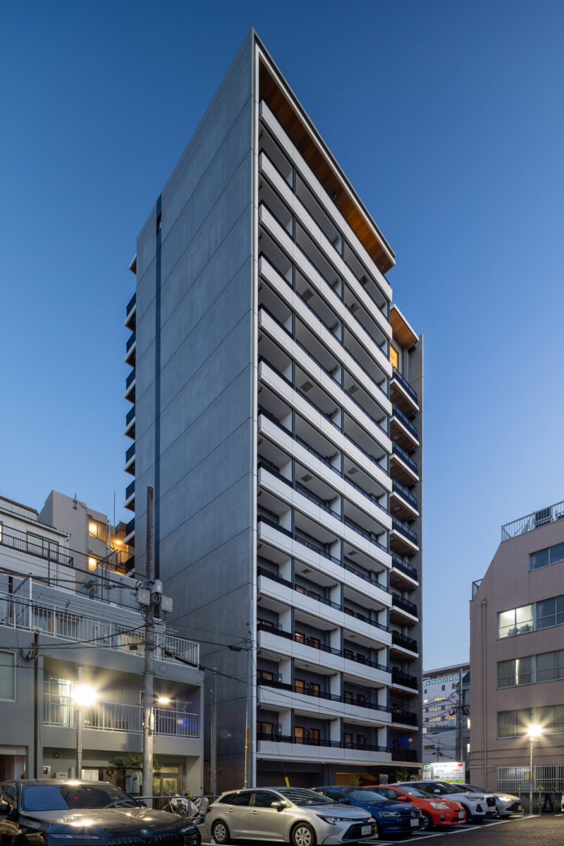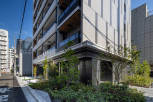 側面のファサードは、巨大な壁面が持つ圧迫感を意匠へと昇華させるため、ランダムな目地割りと黒い垂直ラインの反復によって幾何学的なリズムを刻んでいる。この彫刻的なディテールは、陽の移ろいとともに陰影を深め、都市的なスケール感の中で確かな存在感を放つ。対照的に住戸の主開口となるバルコニー面は、水平ラインを強調した軽快な構成としつつ、軒天に施した木質素材が温かみのある表情を添えた。硬質なコンクリートと有機的な素材のコントラストは、都市の喧騒と住まいの安らぎという二つのコンテクストの調和を意図したものである。足元には植栽によるバッファを設け、無機質になりがちな高層建築の接地性を柔らげ、街並みへの接続を図った。