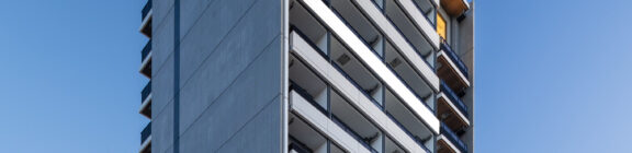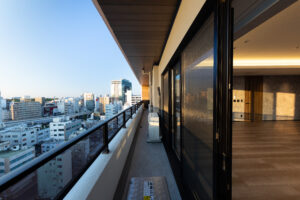 マッシブな壁面構成に対し、バルコニー面では、単調な積層となることを避けるため意図的な分節化を試みた。水平ラインを強調しつつ、構造や手摺壁に細やかな凹凸を設けることで、ファサードに物理的な奥行きと視覚的なリズムを創出。画一的になりがちな高層集合住宅の表情に深みを与えている。