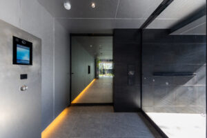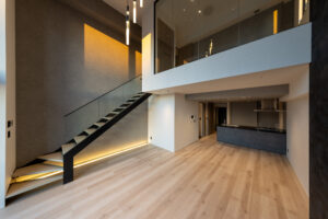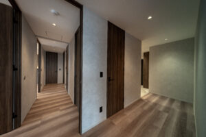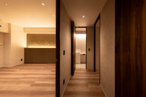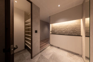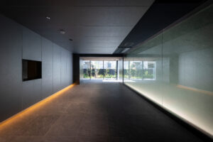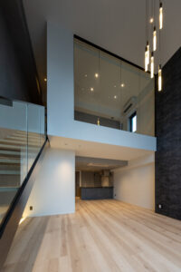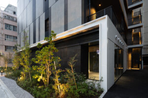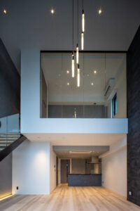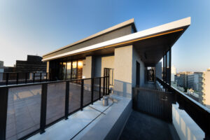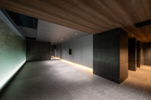 また、ソリッドなグレーの外壁と対比させるように、軒天には木目調素材を配して温かみのあるアクセントとした。無機質な表情の中に有機的な要素を重ね合わせることで、都市的な緊張感を和らげつつ、建物全体に品格を与えている。敷地の制約をデザインの駆動力へと転換し、法規制が導いた独自のシルエットの中に豊かな表情を内包させた建築である。