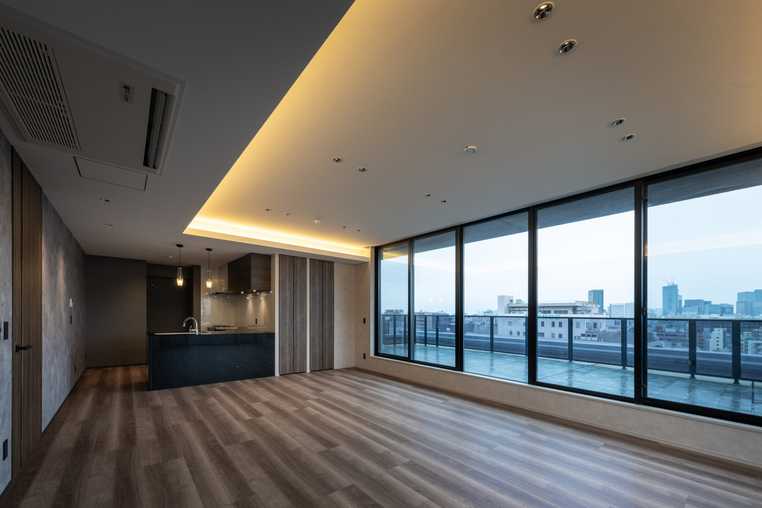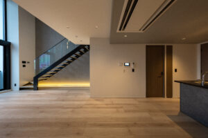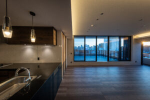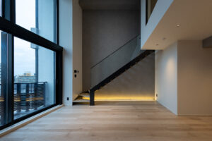 居住性の面では、道路斜線制限を活かしたルーフバルコニーと連続する大開口LDKや、5mの吹抜けを持つメゾネット住戸を計画。2層分の開口により、垂直方向への光の広がりと圧倒的な開放感を実現している。
