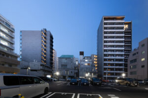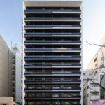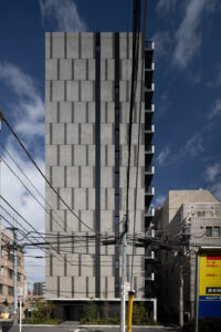都市の高密度なコンテクストにおいて、空へと垂直に伸びるスレンダーなプロポーションと、視点によって劇的に表情を変える二面性が、本建築の際立ったアイデンティティである。