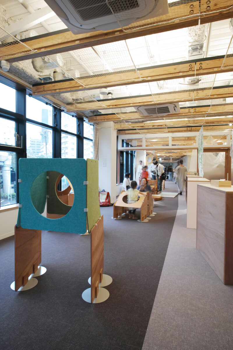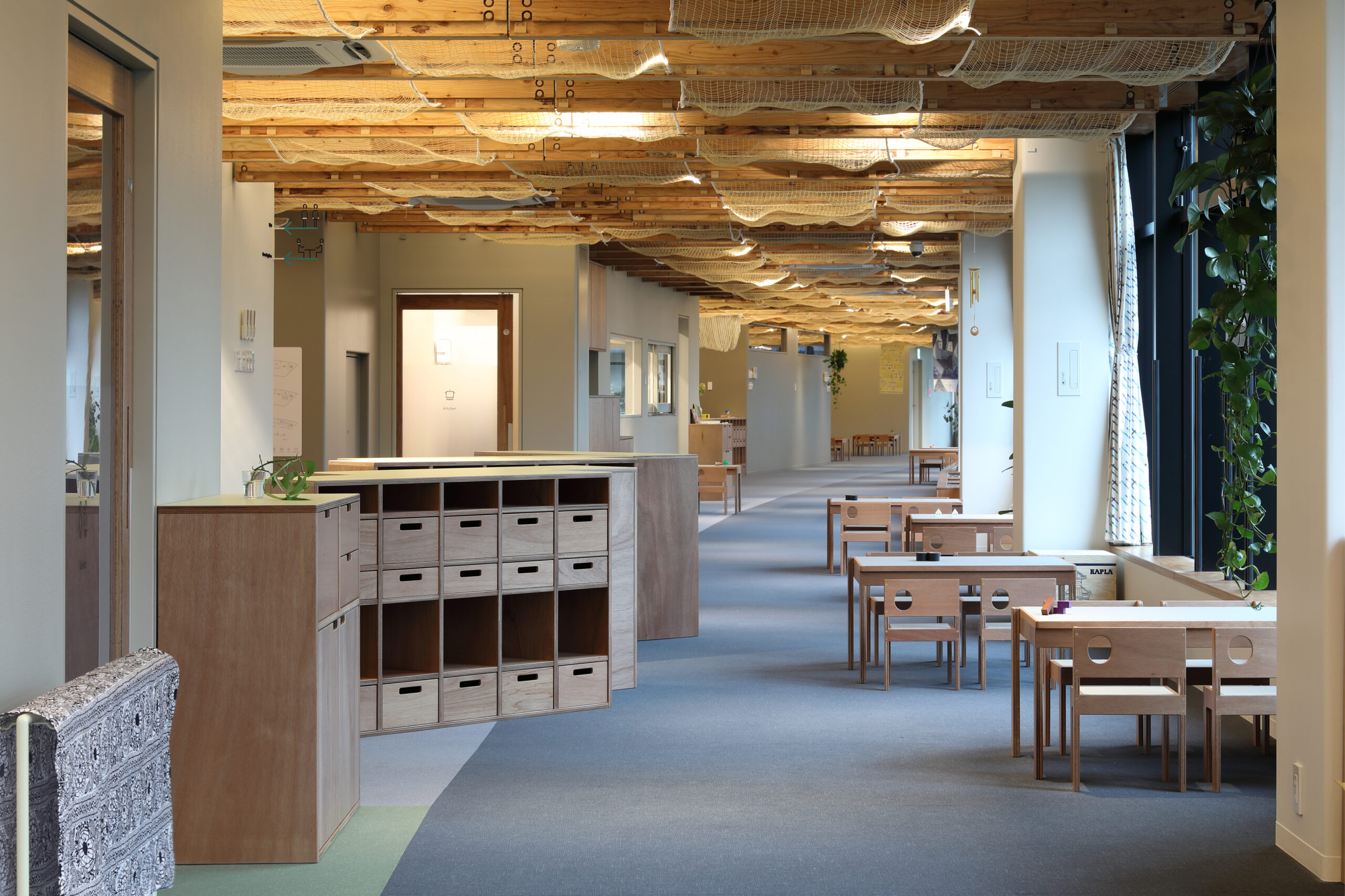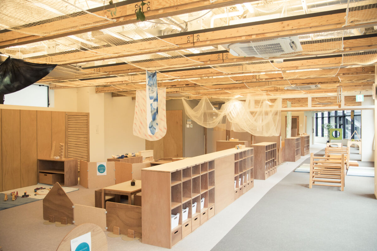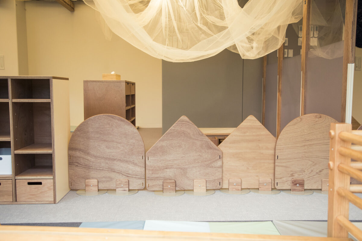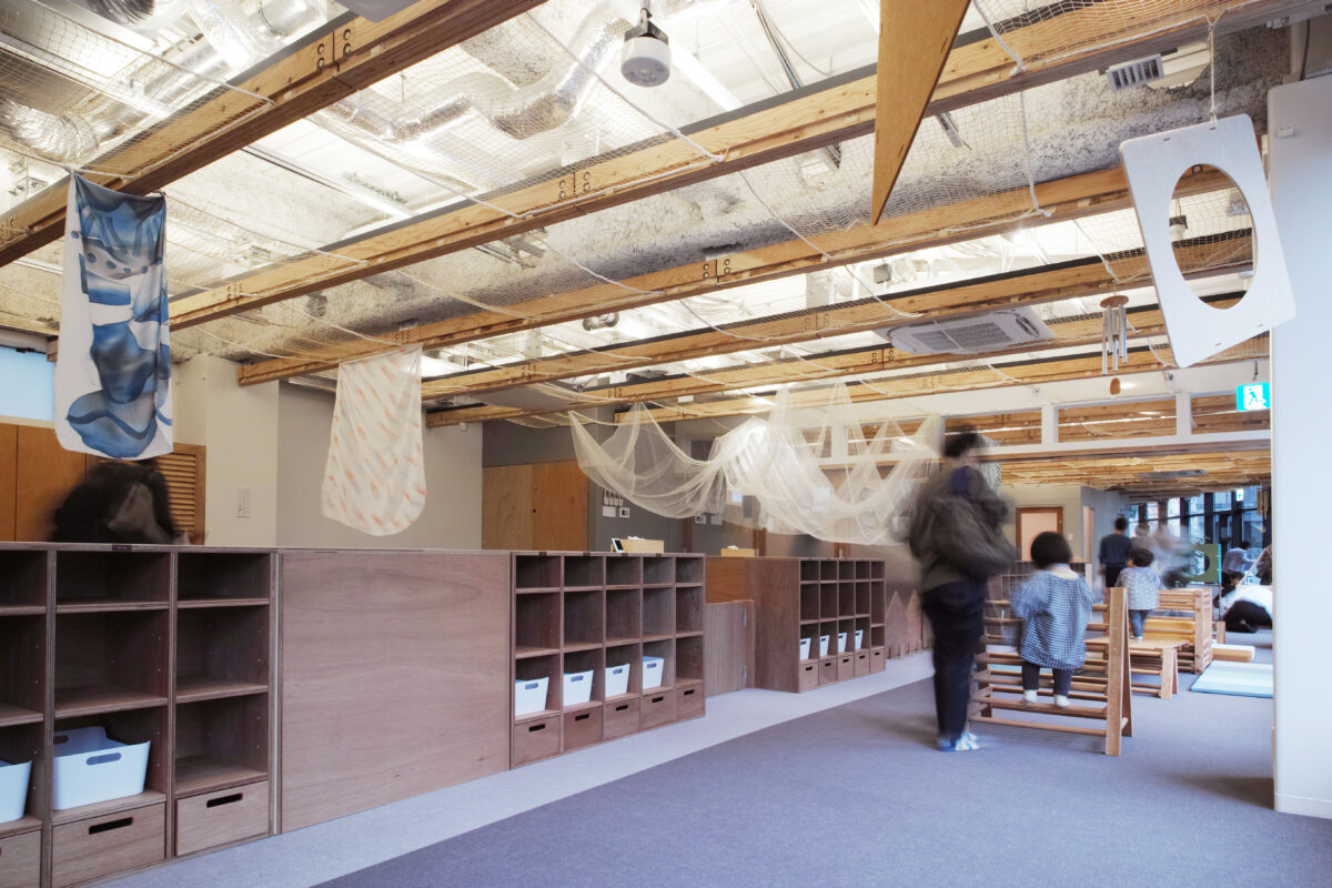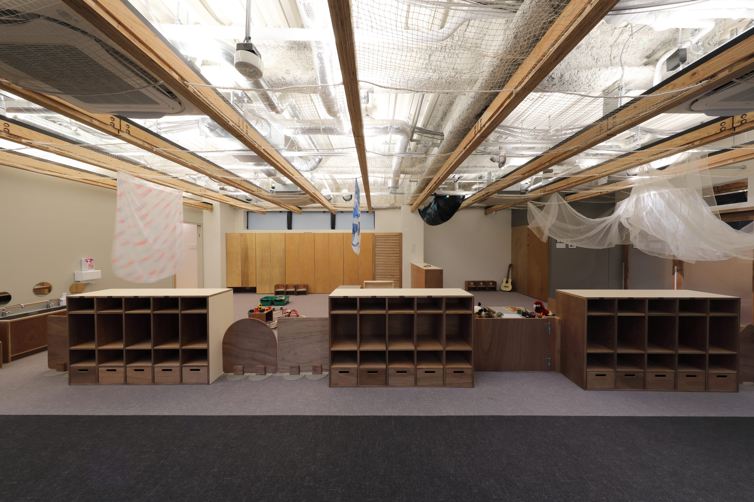 2・3階の天井には連続する木梁を設け、梁間にネット状の素材を張り、透ける幕や布を吊るして空間を緩やかに分節した。ネットは照明や設備を包み込みながら天井面を柔らかく見せ、安心感のあるスケールを与えている。幕は視線を遮り切らず領域感だけを生むため、保育者の見守りやすさを保ちながら、子どもが安心して選べる“小さな居場所”を点在させられる。年齢に合わせて天井のスケール感を調整したり、制作物や季節の飾りを梁やネットに吊って立体的に展示したりすることで、細長い空間を3次元的に使う仕組みとした。床の素材や色の切替え、可動什器、木製の登り遊具やテント等と組み合わせ、遊び・集中・対話が自然に切り替わる風景をつくり、細長い室内の中に多様な学びの場が生まれることを期待して設計を行った。