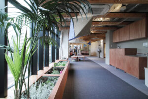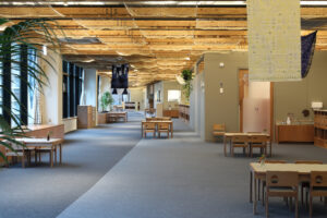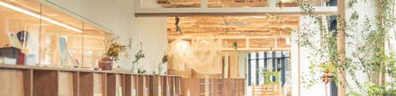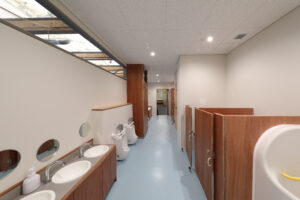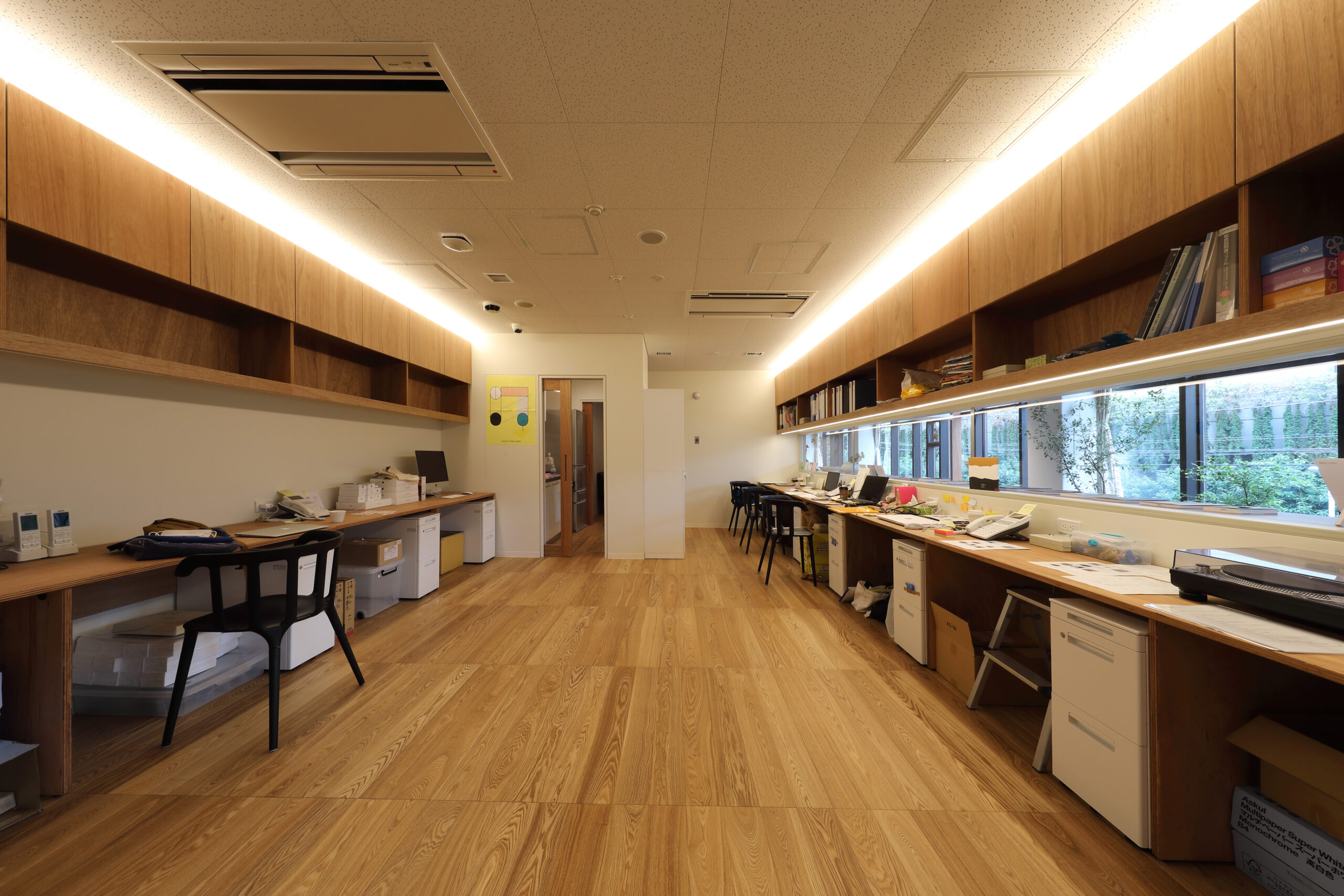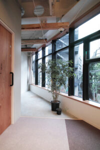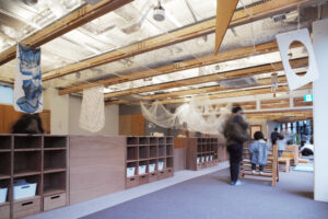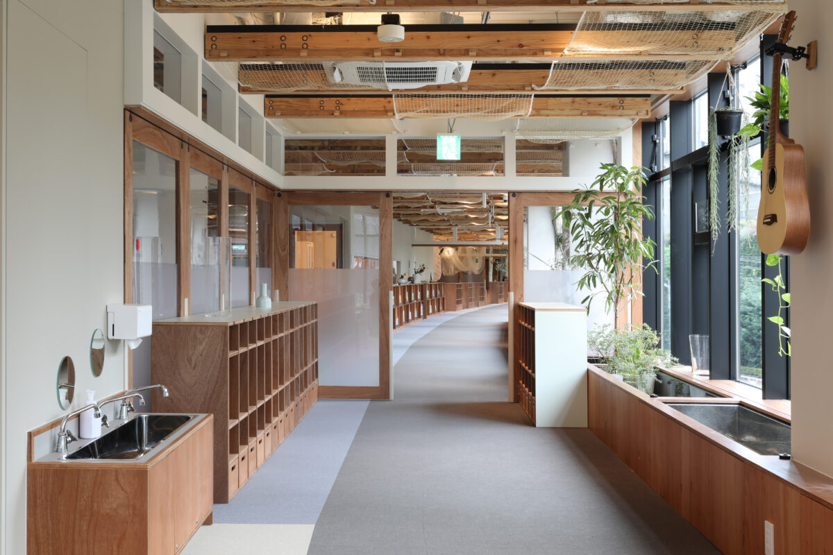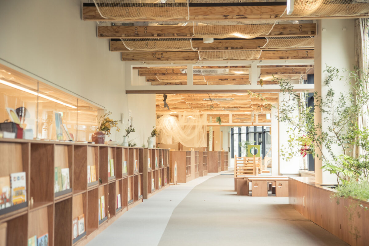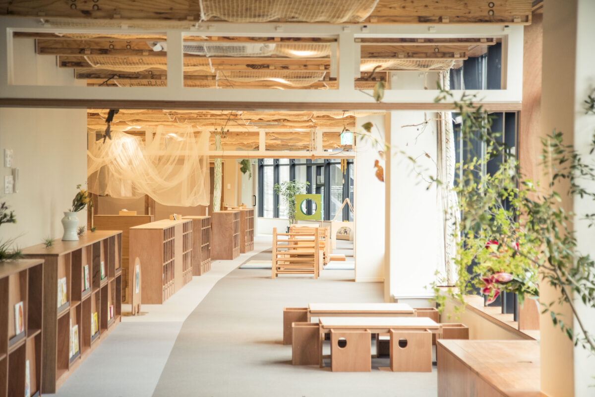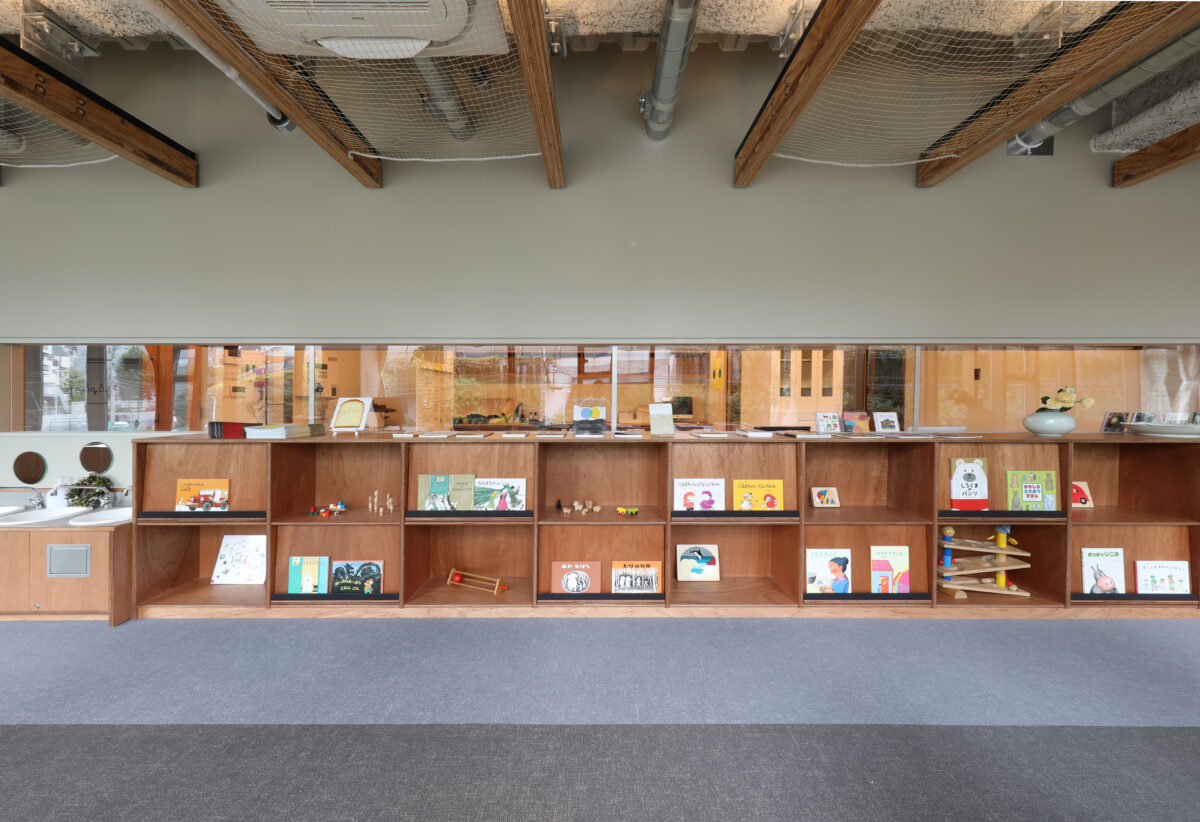 2・3階の天井には連続する木梁を設け、梁間にネット状の素材を張り、透ける幕や布を吊るして空間を緩やかに分節した。ネットは照明や設備を包み込みながら天井面を柔らかく見せ、安心感のあるスケールを与えている。幕は視線を遮り切らず領域感だけを生むため、保育者の見守りやすさを保ちながら、子どもが安心して選べる“小さな居場所”を点在させられる。年齢に合わせて天井のスケール感を調整したり、制作物や季節の飾りを梁やネットに吊って立体的に展示したりすることで、細長い空間を3次元的に使う仕組みとした。床の素材や色の切替え、可動什器、木製の登り遊具やテント等と組み合わせ、遊び・集中・対話が自然に切り替わる風景をつくり、細長い室内の中に多様な学びの場が生まれることを期待して設計を行った。