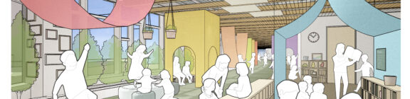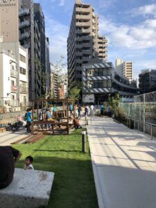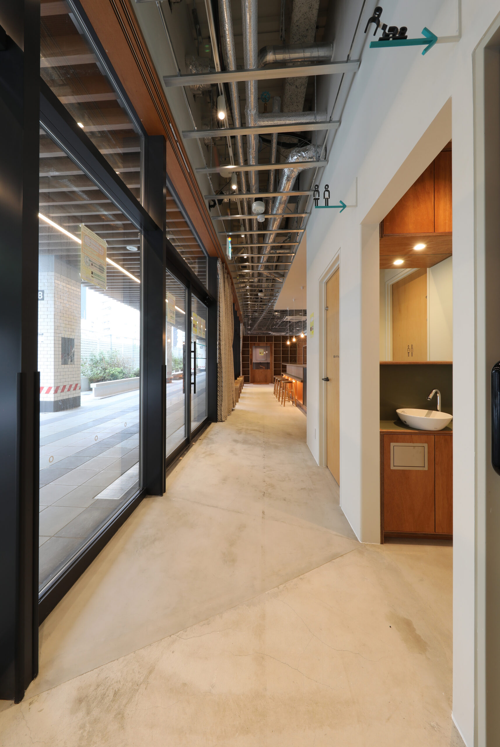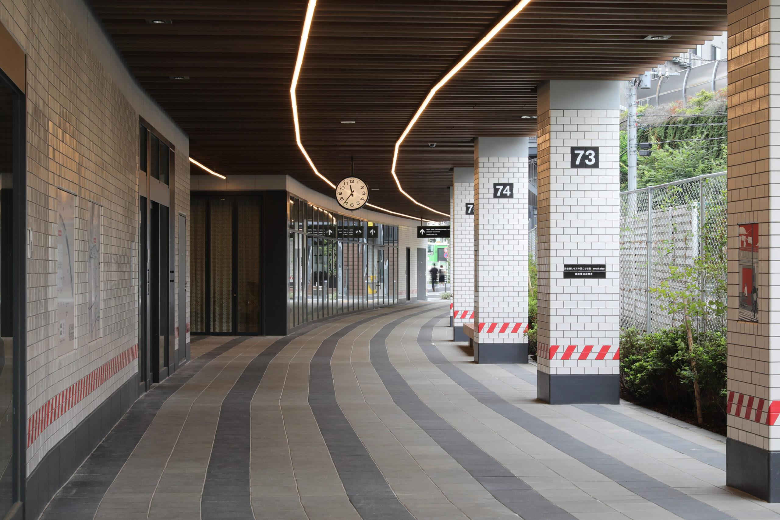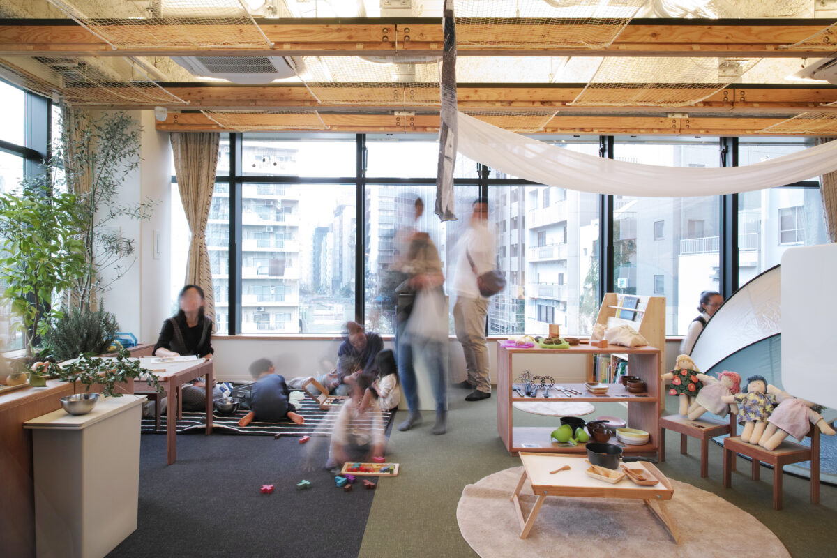渋谷駅周辺再開発の一環として、渋谷ストリームから渋谷川沿いの遊歩道再整備へと連続するように計画された、旧東横線渋谷駅の建て替えプロジェクト「渋谷ブリッジ」内の保育園計画である。旧駅舎の記憶を継承する細長い建物形状を前提に、体格や運動量の異なる0~5歳の子どもたちが、それぞれに応じた距離感や居場所を選べるようにしながら、多様な学びが生まれる空間へと展開することを主題とした。また、渋谷川沿いには人々の賑わいが日常的に生まれることが想定されるため、外部の気配と適度に関わりつつも、園児が安心して過ごせる保育環境を確保する必要があった。