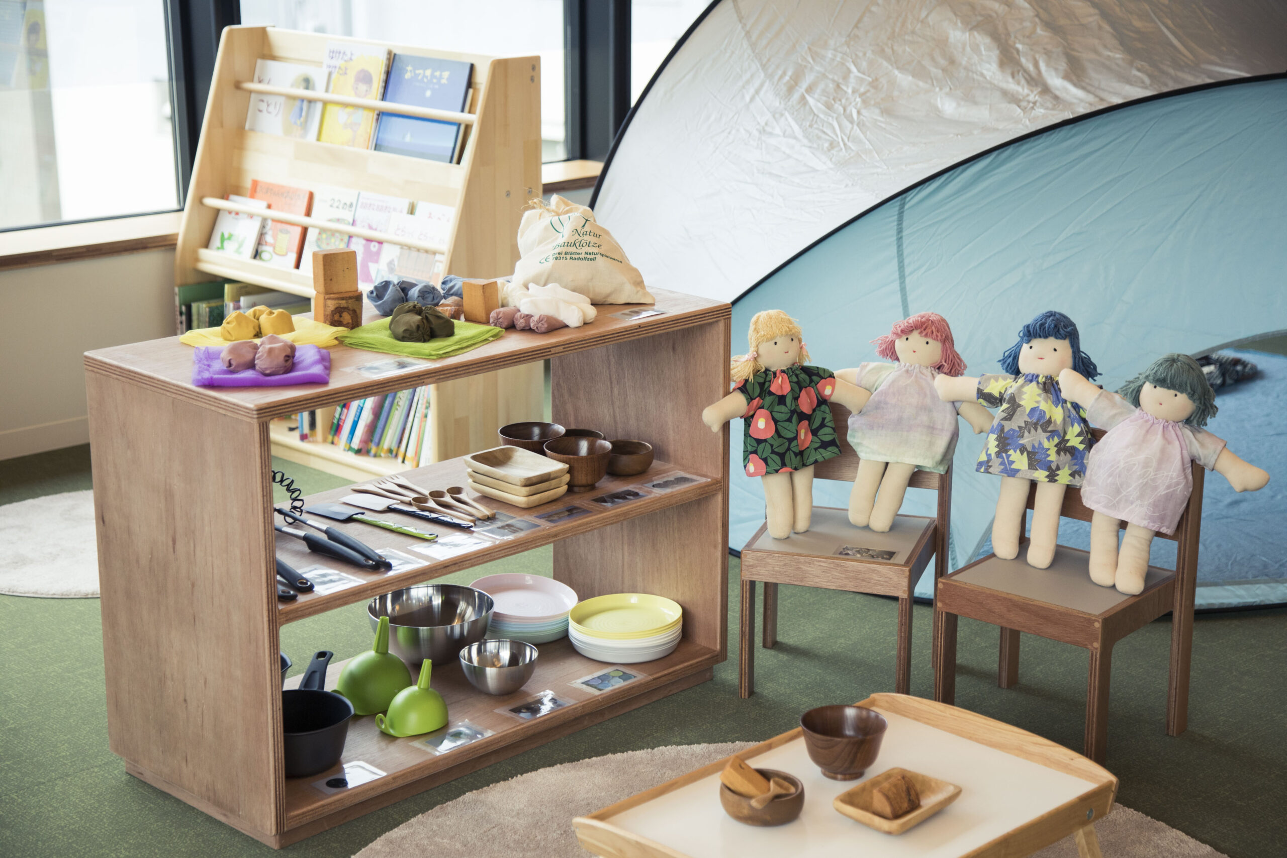 渋谷駅周辺再開発の一環となる渋谷ストリームから続く、渋谷川沿いの遊歩道再整備に連続するように計画された、旧東横線渋谷駅の建て替え計画である「渋谷ブリッジ」内の保育園の計画である。「旧駅舎を継承した細長い建物形状」を、どのようにして体格さや運動量の違う0~5歳子供たちの居場所をつくり、様々な学びの空間にできるかということが主題となった。また、人々の賑わいが予想されるため子供たちが安心できる保育園とする必要があった。私たちは、「空中に浮いた保育園」というコンセプトを基に設計を行い、渋谷川沿いの遊歩道から続く1階のピロティ空間に沿うようにギャラリーやカフェを配置し賑わいが連続するような計画とし、2・3階に保育園を配置する計画とした。2・3階の天井に木梁をもうけ、温かみのある連続した空間としながら、幕を吊るして空間の分節や子供の年齢にあった天井高さの調整、子供たちの作品などを飾るなど、木梁が細長い空間を3次元的に使う仕組みとなり、細長い室内空間の中に多様な空間を生まれることを期待して設計を行った。