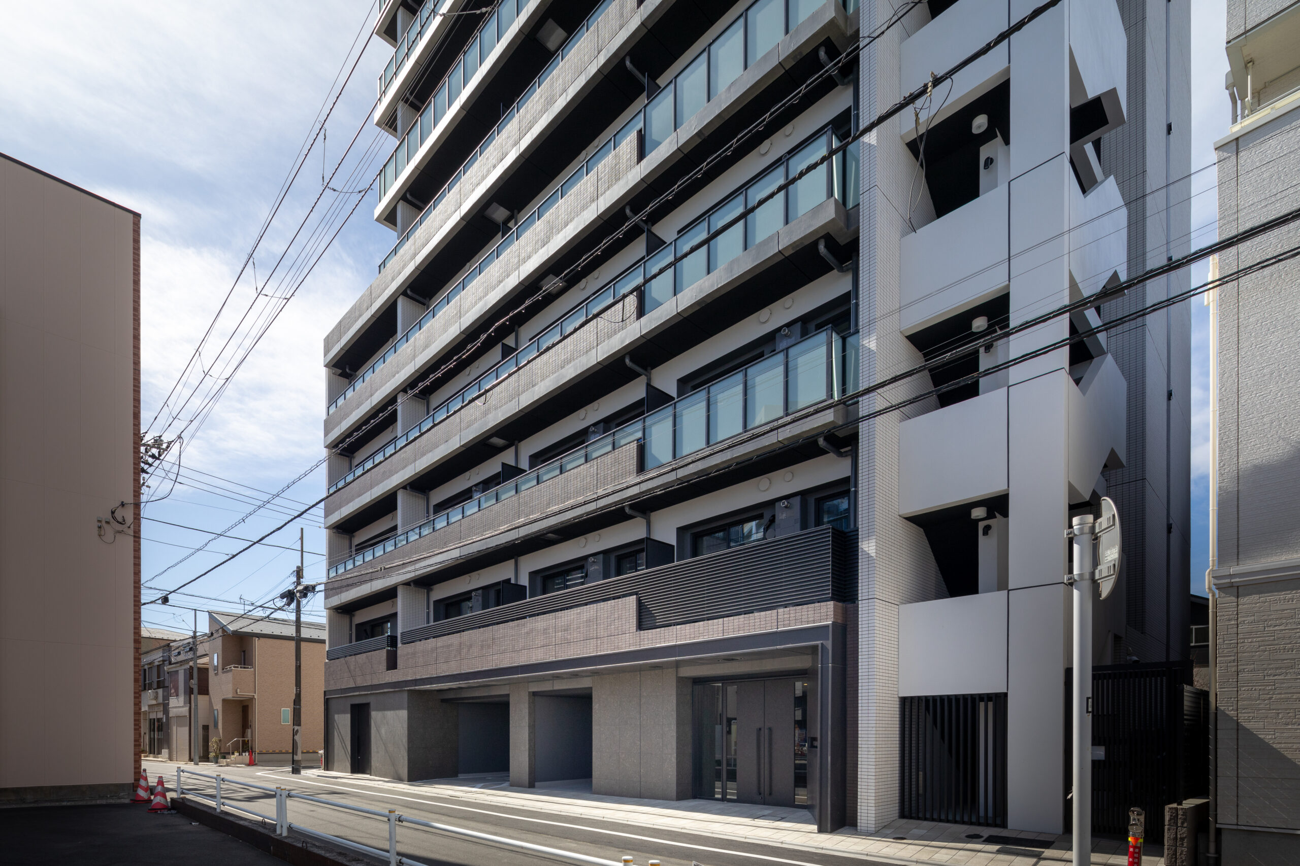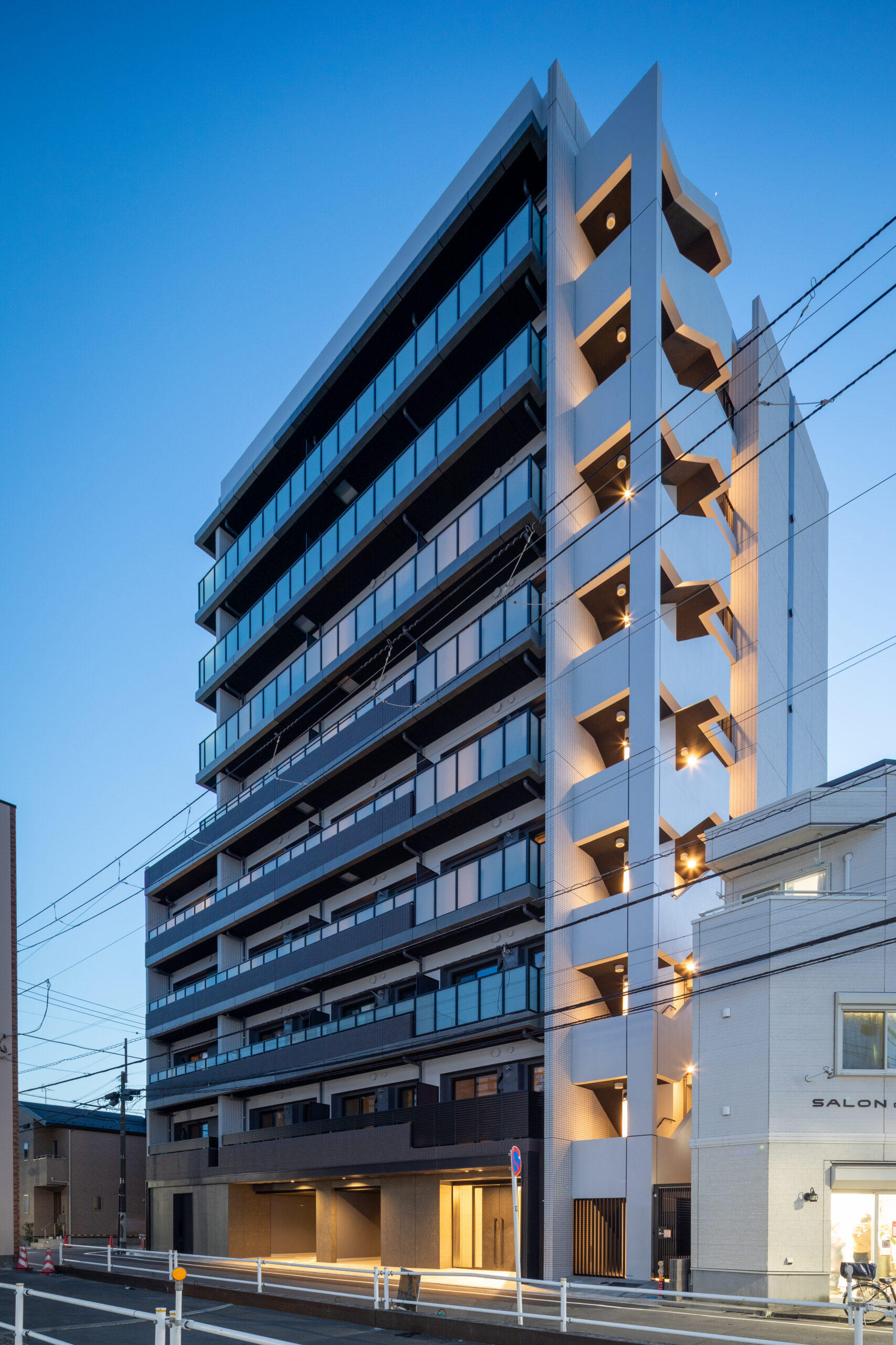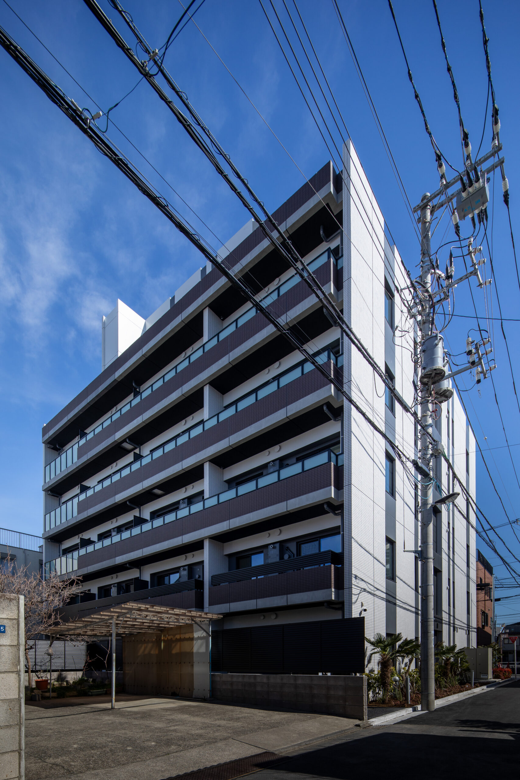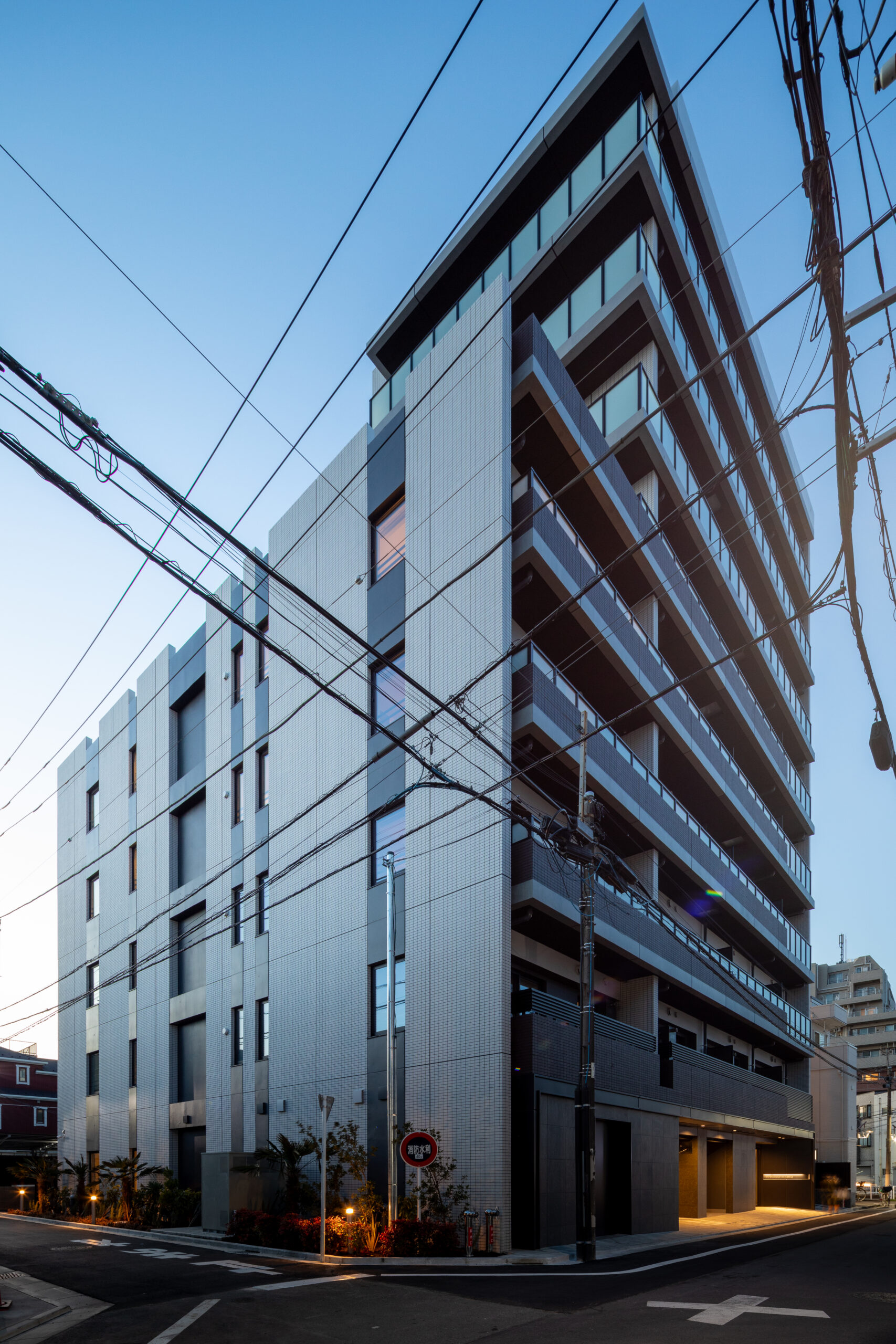 敷地は墨田区墨田三丁目、準工業地域と商業地域の境界線上に静かに横たわる整形の一画である。そこにRC造地上9階建、46戸の共同住宅を立ち上げる。雑多な街のエネルギーと、住まいの密やかな時間をチューニングするように、ボリュームは高さ制限に従い段状にセットバックし、スカイラインに柔らかなリズムを刻む。門型に構えたエントランスは街路に対する閾値として働き、商業の喧噪から居住領域へのモード変換装置となる。ファサードは色違いのタイル、透過と反射を織りなすガラス、陰影を制御するルーバー、薄いアルミパネルをピクセルのように配置し、その素材切り替えのバランスを慎重に調律しながら、構造グリッドと開口のモジュールに呼応させ、用途混在の街にふさわしい多層的な表情を獲得する。整形敷地の矩形性は、効率的な住戸プランと設備シャフトの合理的な配置を可能にし、躯体と仕上げの納まりはディテールレベルで最適化される。こうして技術的要件の集積は、やがて住民の生活音や窓辺の灯りと混ざり合い、墨田三丁目という地点にだけ現れる、ひとつの都市断面を描き出していく。