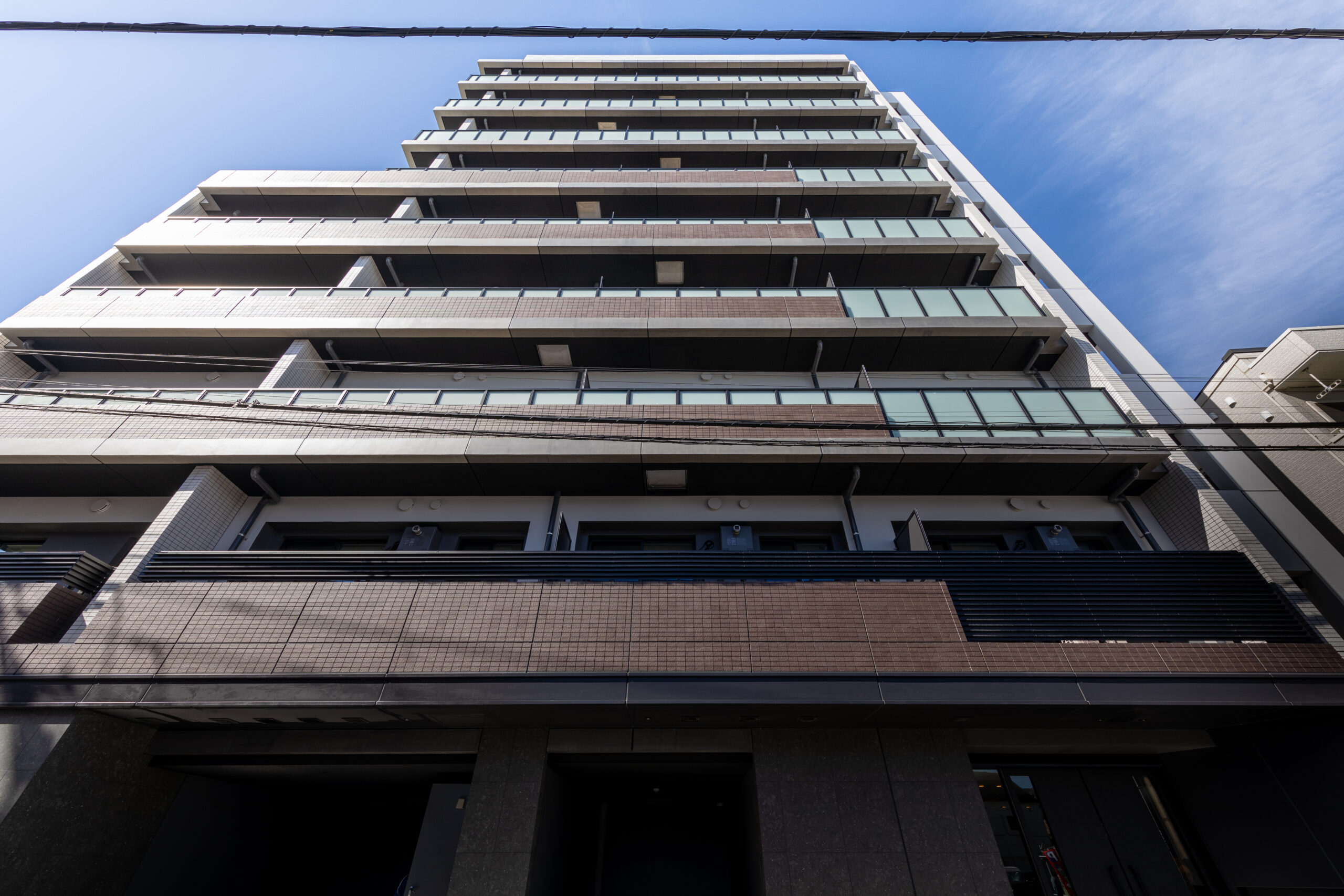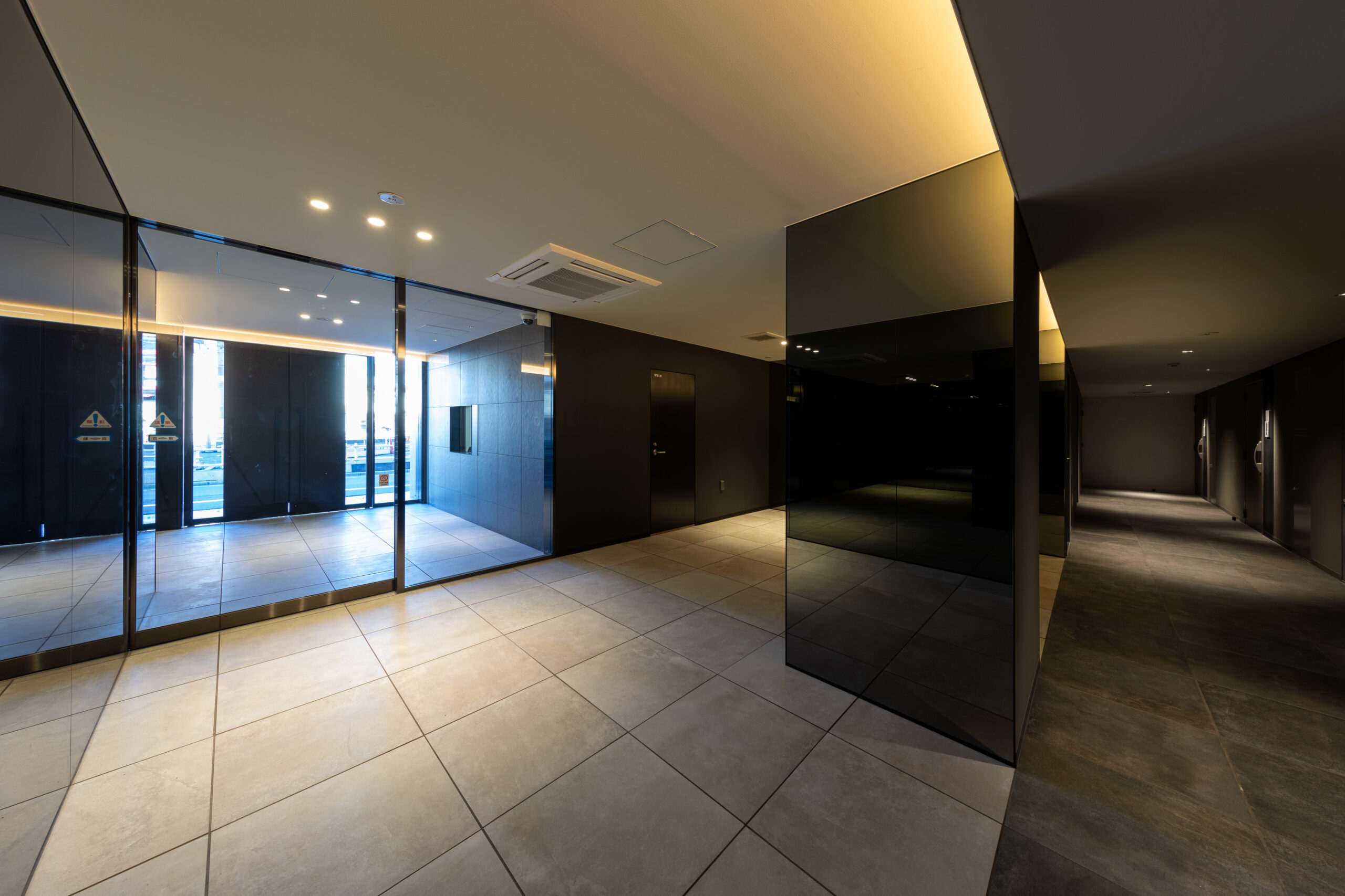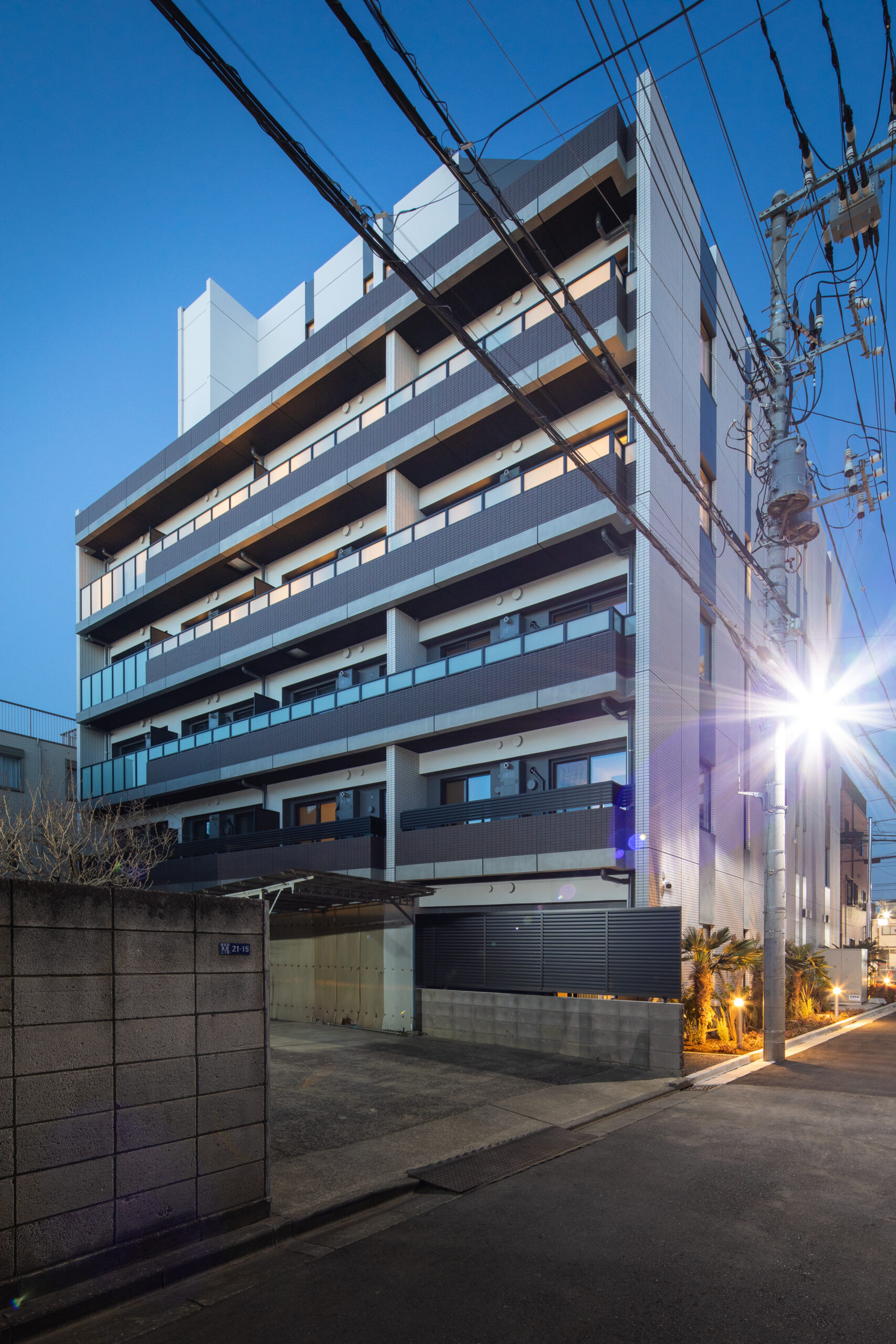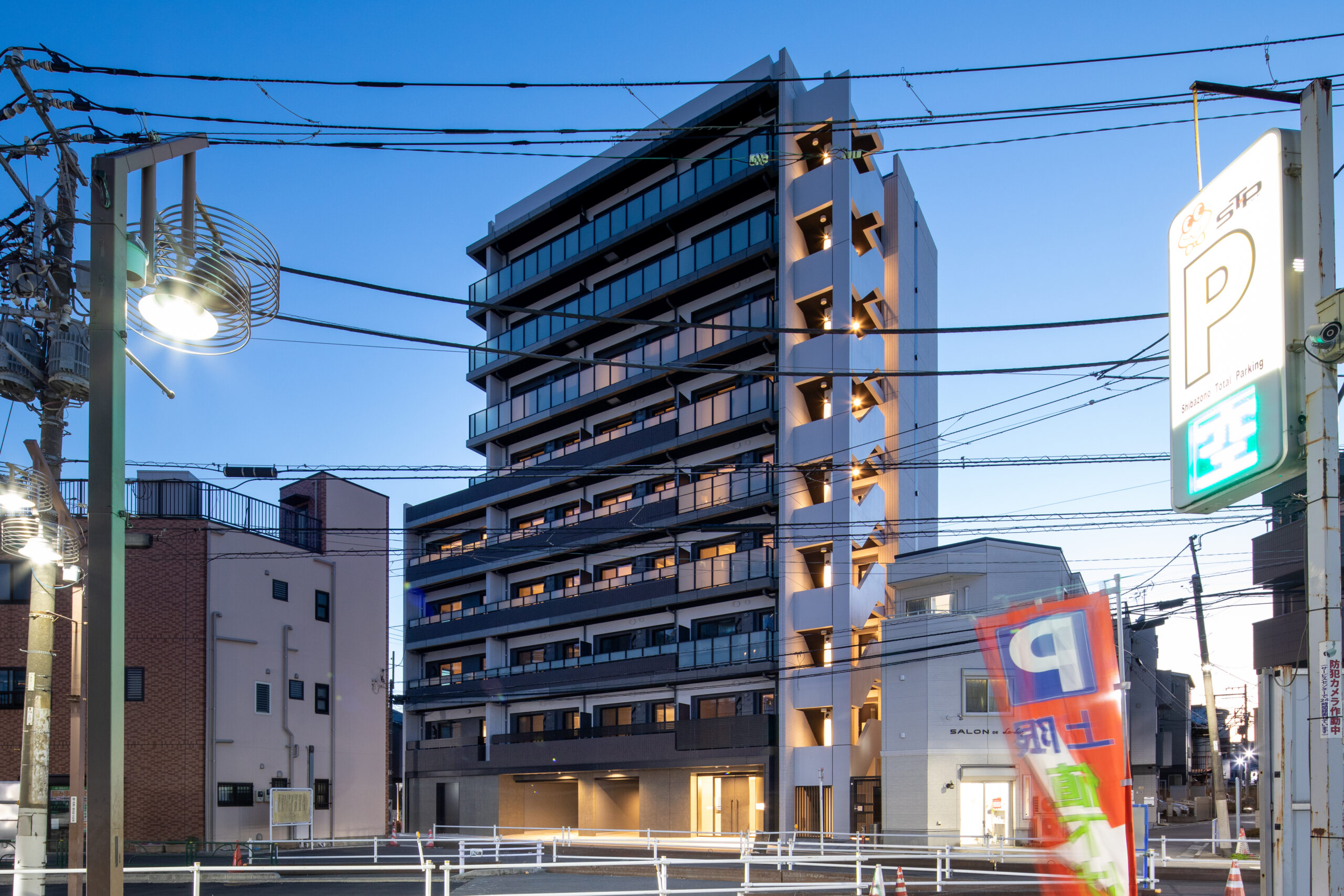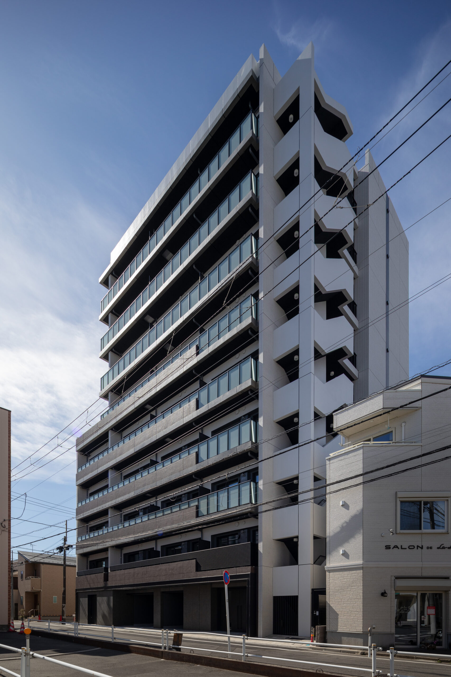 敷地は墨田区墨田三丁目、準工業地域と商業地域の境界線上に静かに横たわる整形の一画である。そこにRC造地上9階建、46戸の共同住宅を立ち上げる。雑多な街のエネルギーと、住まいの密やかな時間をチューニングするように、ボリュームは高さ制限に従い段状にセットバックし、スカイラインに柔らかなリズムを刻む。門型に構えたエントランスは街路に対する閾値として働き、商業の喧噪から居住領域へのモード変換装置となる。ファサードは色違いのタイル、透過と反射を織りなすガラス、陰影を制御するルーバー、薄いアルミパネルをピクセルのように配置し、その素材切り替えのバランスを慎重に調律しながら、構造グリッドと開口のモジュールに呼応させ、用途混在の街にふさわしい多層的な表情を獲得する。整形敷地の矩形性は、効率的な住戸プランと設備シャフトの合理的な配置を可能にし、躯体と仕上げの納まりはディテールレベルで最適化される。こうして技術的要件の集積は、やがて住民の生活音や窓辺の灯りと混ざり合い、墨田三丁目という地点にだけ現れる、ひとつの都市断面を描き出していく。