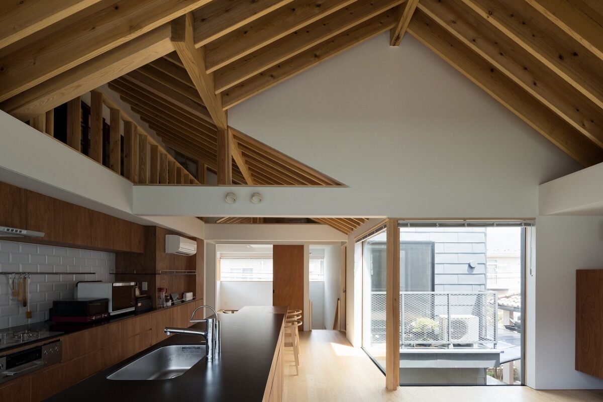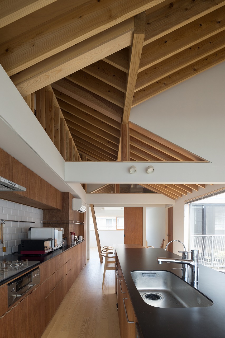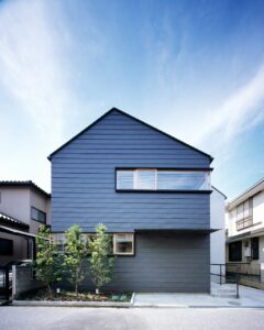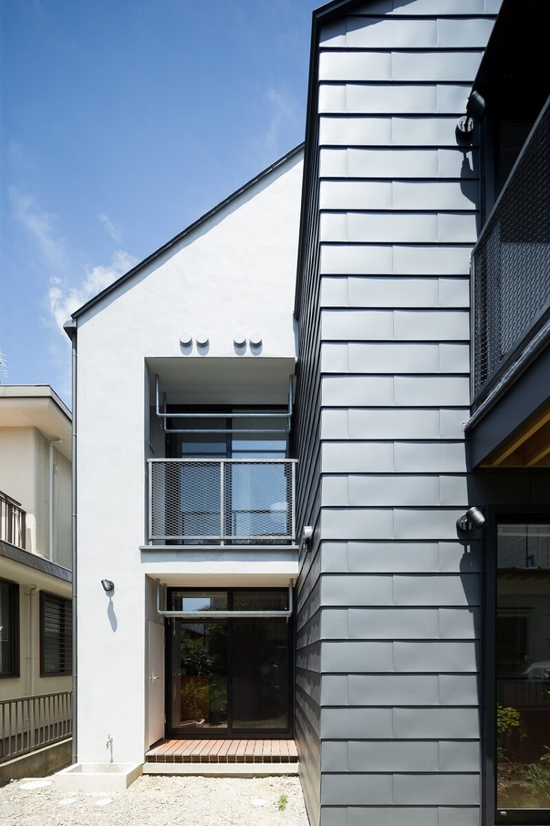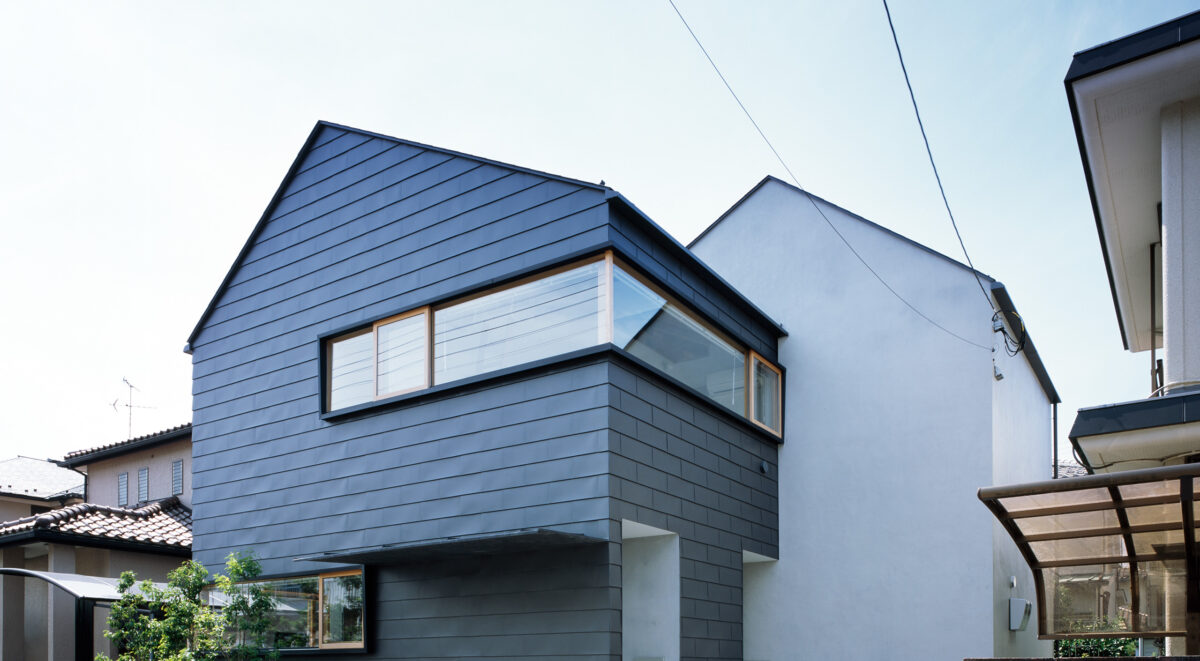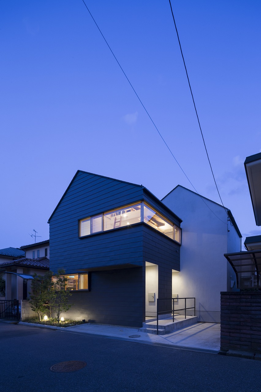 社会学を研究する大学教授のための二世帯住宅である。本計画では、第一子の誕生を契機に、親世帯と子世帯の関係性をあらためて再構築することをテーマとした。三つの切妻屋根をわずかにずらして配置することで、それぞれのボリュームが独立性を保ちながらも互いに緩やかに呼応する構成とした。このずれが生み出す中間的な外部空間は、両世帯の視線や動線を柔らかくつなぐ緩衝帯として機能し、空間的な文節化が新たなコミュニケーションの関係性を促している。外装は中央のボリュームをモルタル塗り、両側をガルバリウム鋼板仕上げとし、異なる素材の対比によって、生の力強さと内部空間の繊細さを際立たせた。内部では家具・建具・天井材にすべてラワン合板を採用したが、ラワンには赤材・白材・灰材が混在し、木目も直線的なものから複雑に曲がるものまで多様であるため、そのまま用いると赤白灰が入り混じったパッチワーク状となり、雑然とした印象になってしまう。そこで、白ラワンを天井に、赤ラワンを家具・建具に使い分け、素材の個性を秩序立てながら全体の統一感を確保した。施工者と家具職人の緊密な協働により、繊細さと一体感を兼ね備えた空間を実現している。
