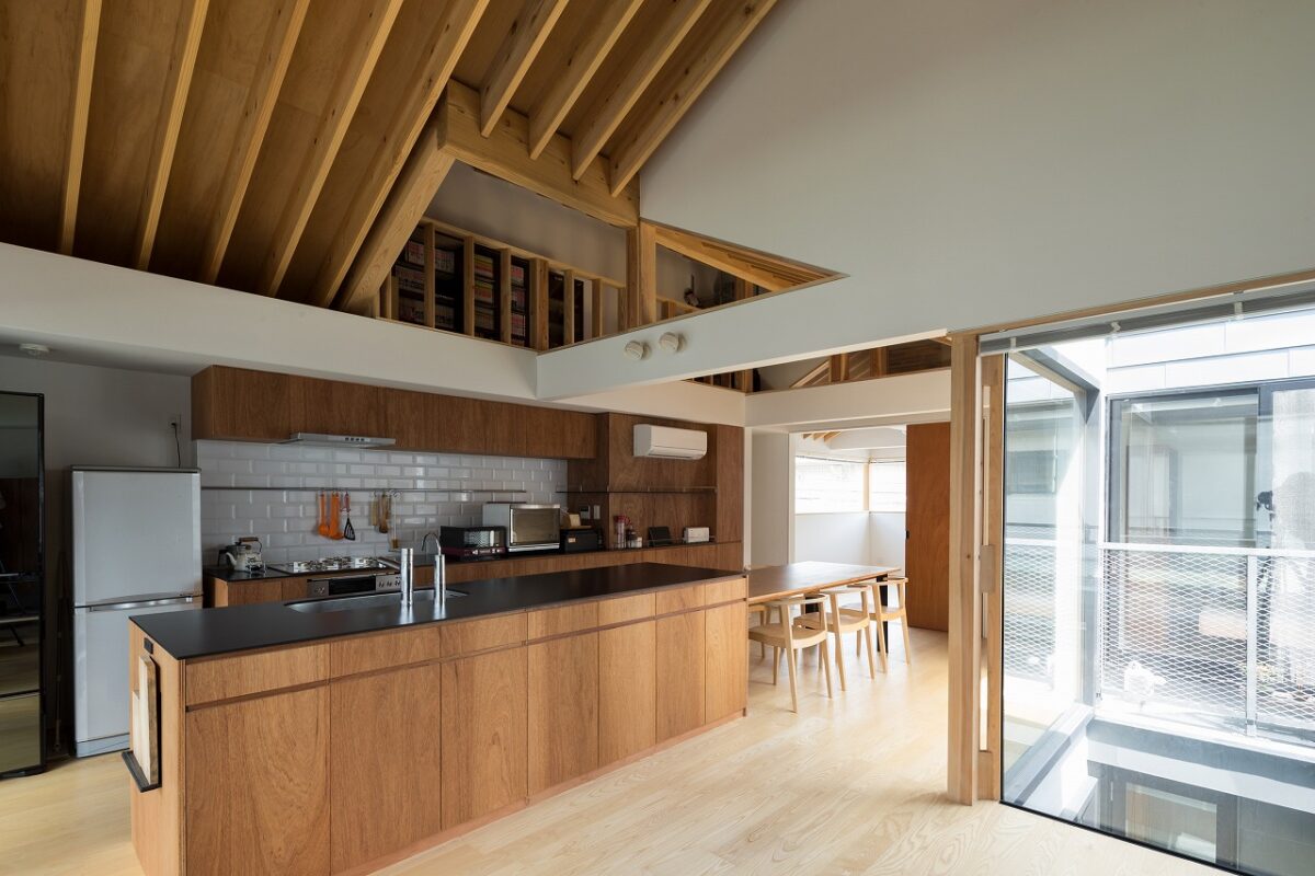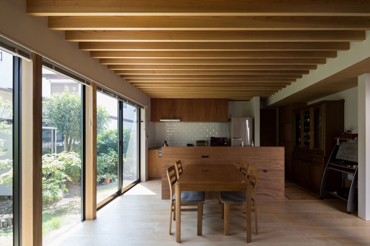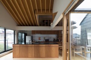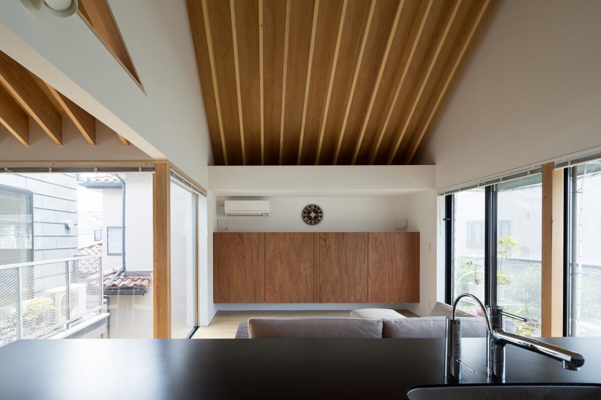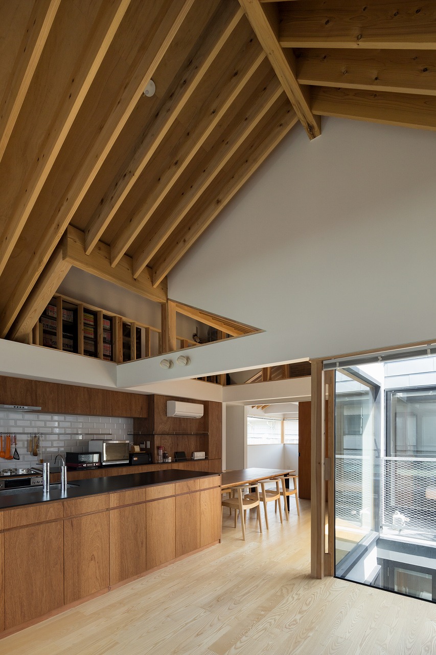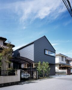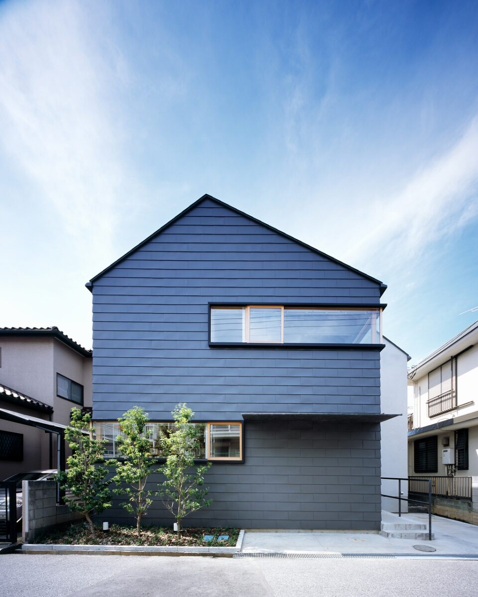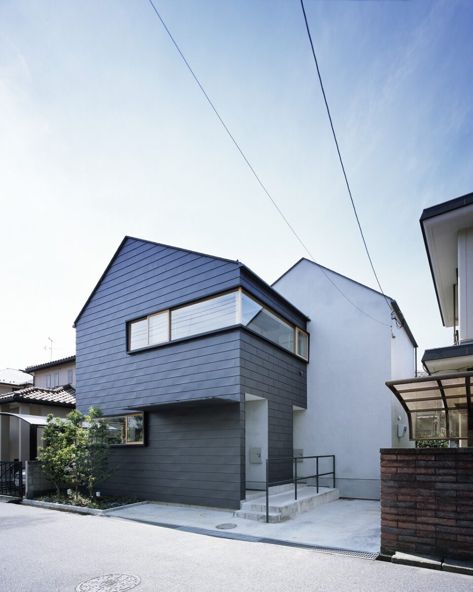 社会学を研究する大学教授のための二世帯住宅である。本計画では、第一子の誕生を契機に、親世帯と子世帯の関係性をあらためて再構築することをテーマとした。三つの切妻屋根をわずかにずらして配置することで、それぞれのボリュームが独立性を保ちながらも互いに緩やかに呼応する構成とした。このずれが生み出す中間的な外部空間は、両世帯の視線や動線を柔らかくつなぐ緩衝帯として機能し、空間的な文節化が新たなコミュニケーションの関係性を促している。外装は中央のボリュームをモルタル塗り、両側をガルバリウム鋼板仕上げとし、異なる素材の対比によって、生の力強さと内部空間の繊細さを際立たせた。内部では家具・建具・天井材にすべてラワン合板を採用したが、ラワンには赤材・白材・灰材が混在し、木目も直線的なものから複雑に曲がるものまで多様であるため、そのまま用いると赤白灰が入り混じったパッチワーク状となり、雑然とした印象になってしまう。そこで、白ラワンを天井に、赤ラワンを家具・建具に使い分け、素材の個性を秩序立てながら全体の統一感を確保した。施工者と家具職人の緊密な協働により、繊細さと一体感を兼ね備えた空間を実現している。