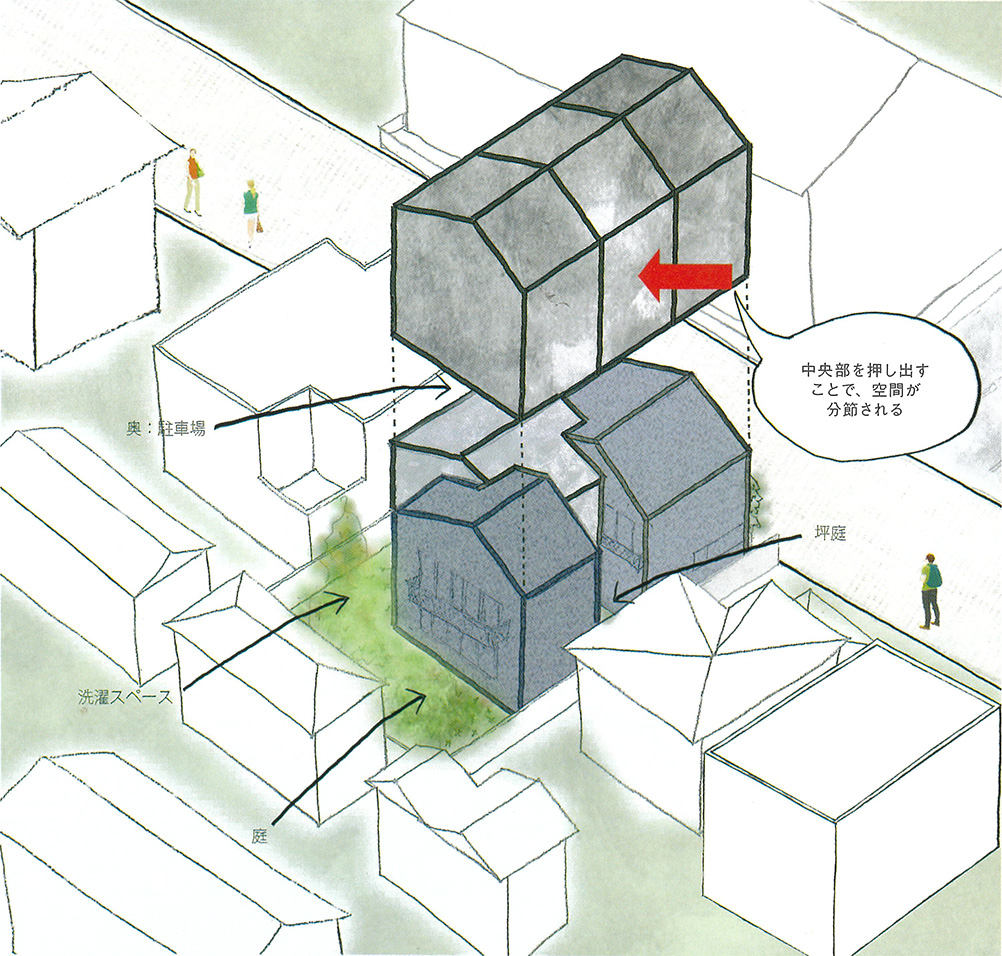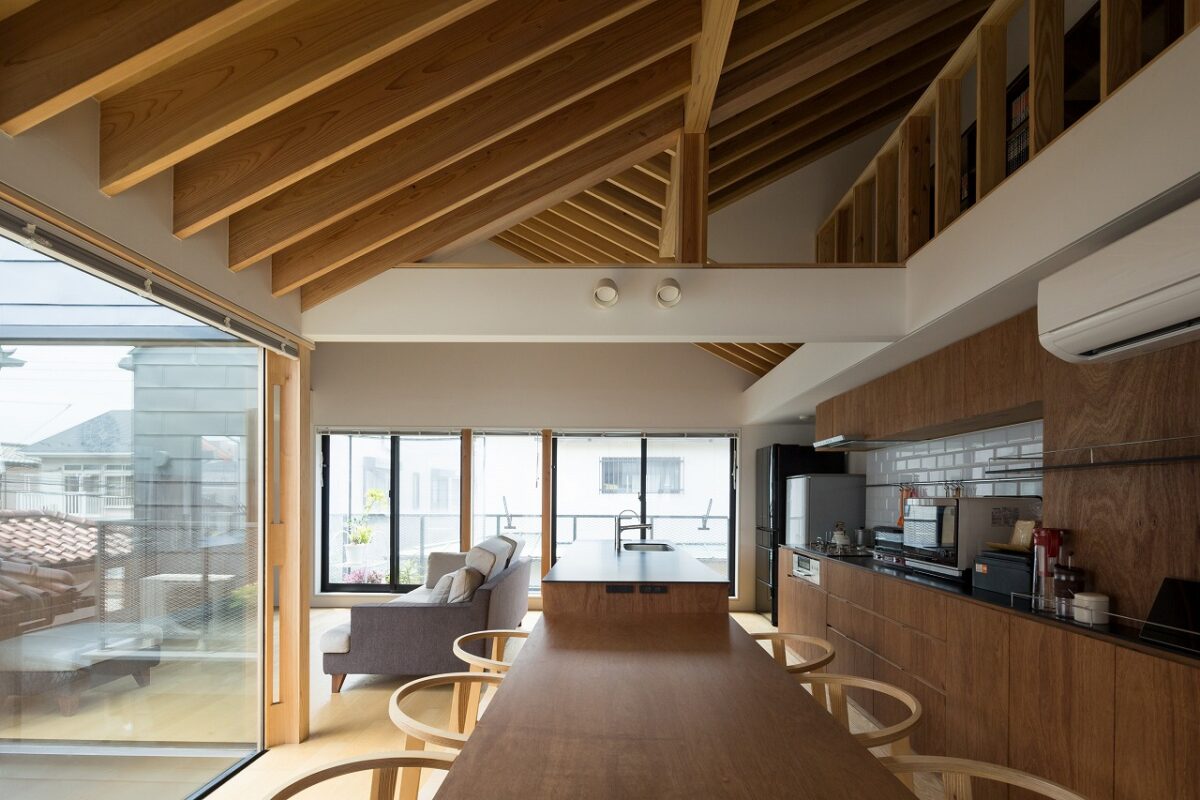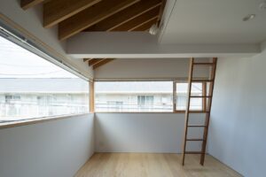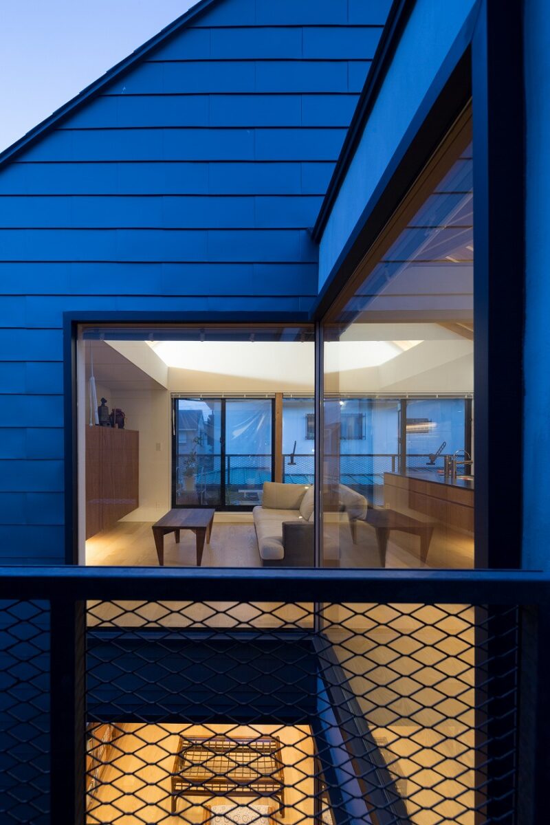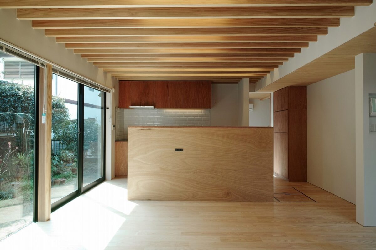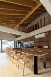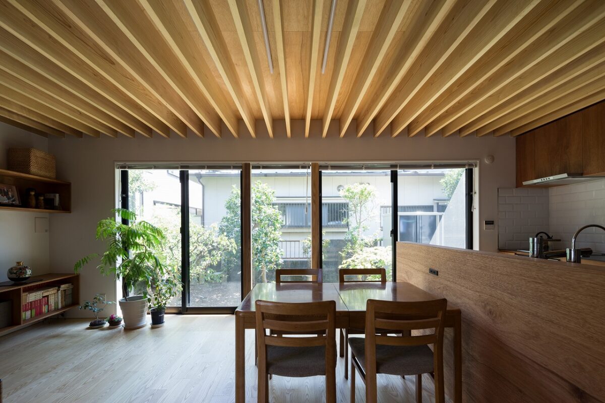 社会学を研究する大学教授のための二世帯住宅である。本計画では、第一子の誕生を契機に、親世帯と子世帯の関係性をあらためて再構築することをテーマとした。三つの切妻屋根をわずかにずらして配置することで、それぞれのボリュームが独立性を保ちながらも互いに緩やかに呼応する構成とした。このずれが生み出す中間的な外部空間は、両世帯の視線や動線を柔らかくつなぐ緩衝帯として機能し、空間的な文節化が新たなコミュニケーションの関係性を促している。外装は中央のボリュームをモルタル塗り、両側をガルバリウム鋼板仕上げとし、異なる素材の対比によって、生の力強さと内部空間の繊細さを際立たせた。内部では家具・建具・天井材にすべてラワン合板を採用したが、ラワンには赤材・白材・灰材が混在し、木目も直線的なものから複雑に曲がるものまで多様であるため、そのまま用いると赤白灰が入り混じったパッチワーク状となり、雑然とした印象になってしまう。そこで、白ラワンを天井に、赤ラワンを家具・建具に使い分け、素材の個性を秩序立てながら全体の統一感を確保した。施工者と家具職人の緊密な協働により、繊細さと一体感を兼ね備えた空間を実現している。