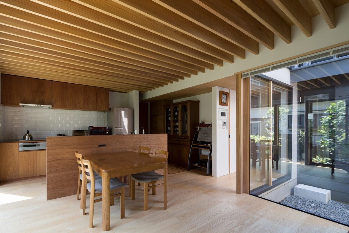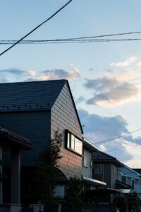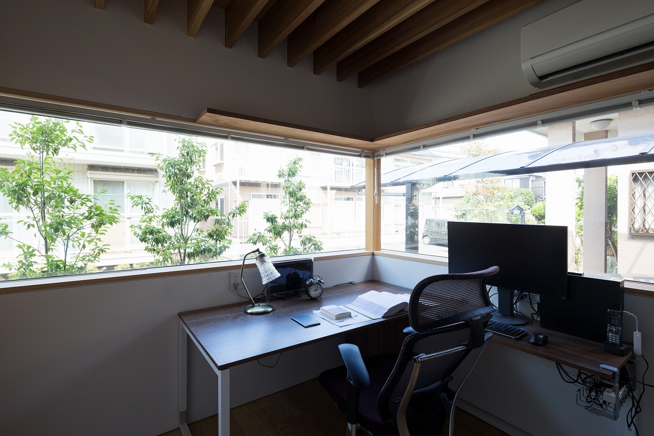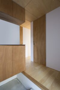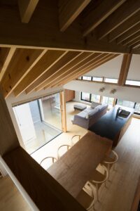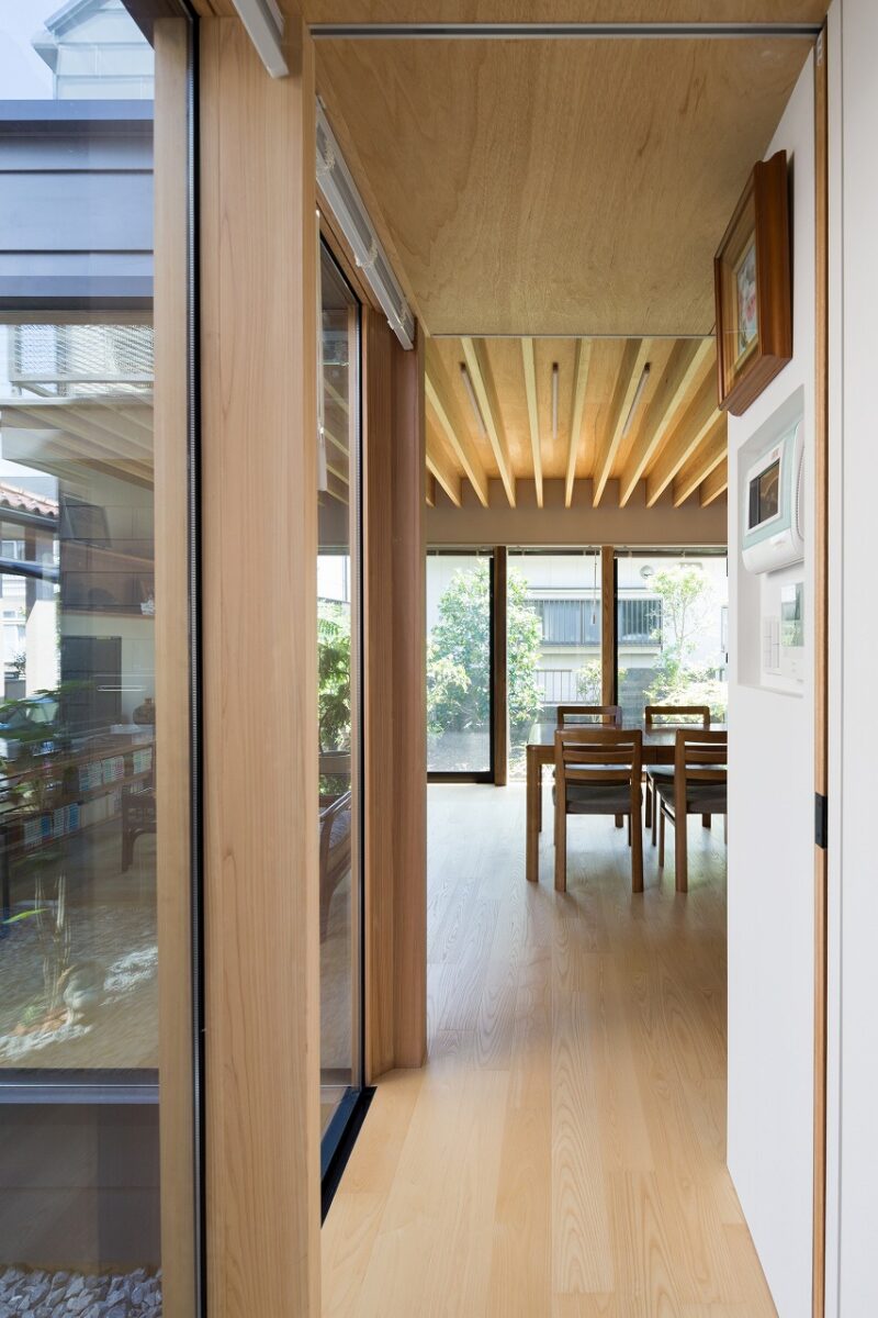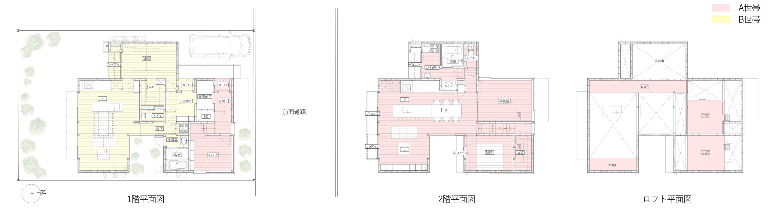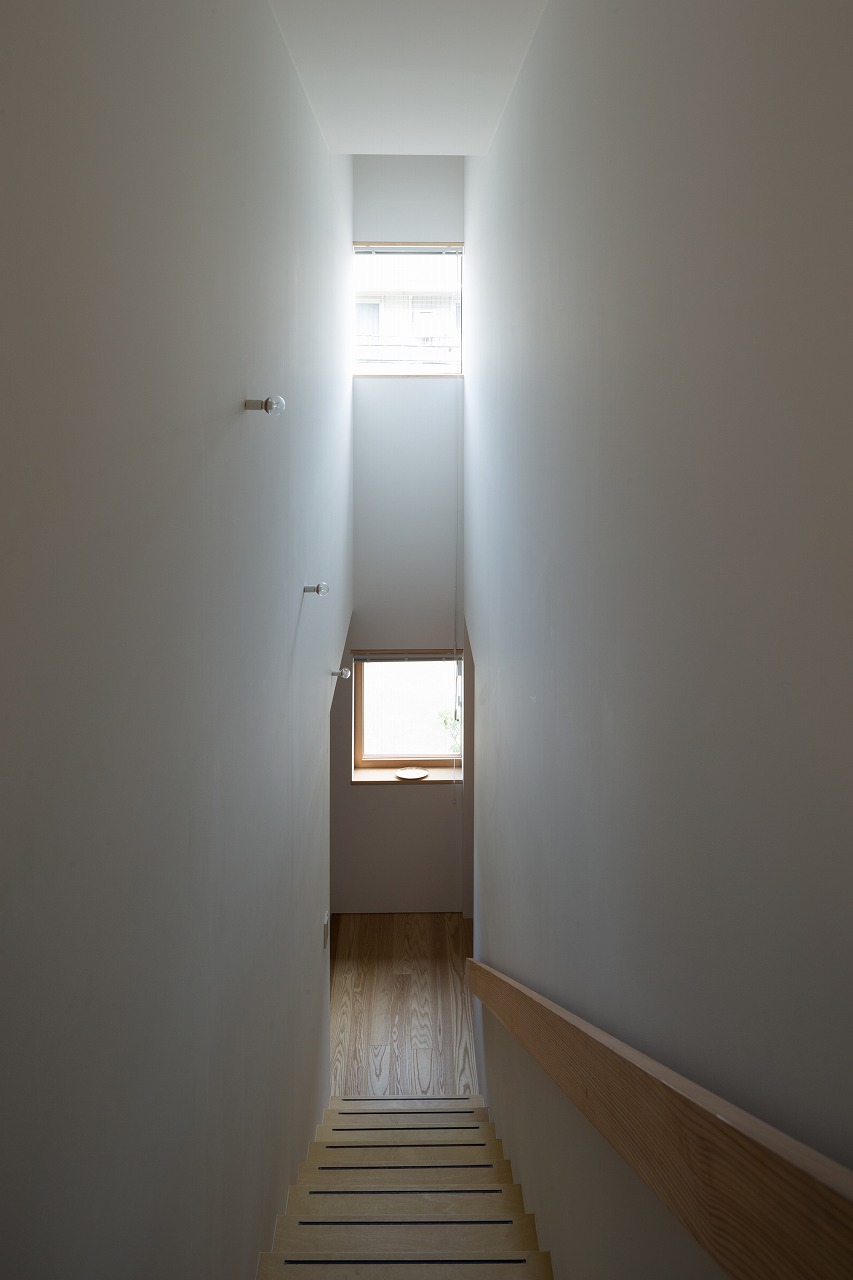 社会学を研究する大学教授のための二世帯住宅である。本計画では、第一子の誕生を契機に、親世帯と子世帯の関係性をあらためて再構築することをテーマとした。三つの切妻屋根をわずかにずらして配置することで、それぞれのボリュームが独立性を保ちながらも互いに緩やかに呼応する構成とした。このずれが生み出す中間的な外部空間は、両世帯の視線や動線を柔らかくつなぐ緩衝帯として機能し、空間的な文節化が新たなコミュニケーションの関係性を促している。外装は中央のボリュームをモルタル塗り、両側をガルバリウム鋼板仕上げとし、異なる素材の対比によって、生の力強さと内部空間の繊細さを際立たせた。内部では家具・建具・天井材にすべてラワン合板を採用したが、ラワンには赤材・白材・灰材が混在し、木目も直線的なものから複雑に曲がるものまで多様であるため、そのまま用いると赤白灰が入り混じったパッチワーク状となり、雑然とした印象になってしまう。そこで、白ラワンを天井に、赤ラワンを家具・建具に使い分け、素材の個性を秩序立てながら全体の統一感を確保した。施工者と家具職人の緊密な協働により、繊細さと一体感を兼ね備えた空間を実現している。