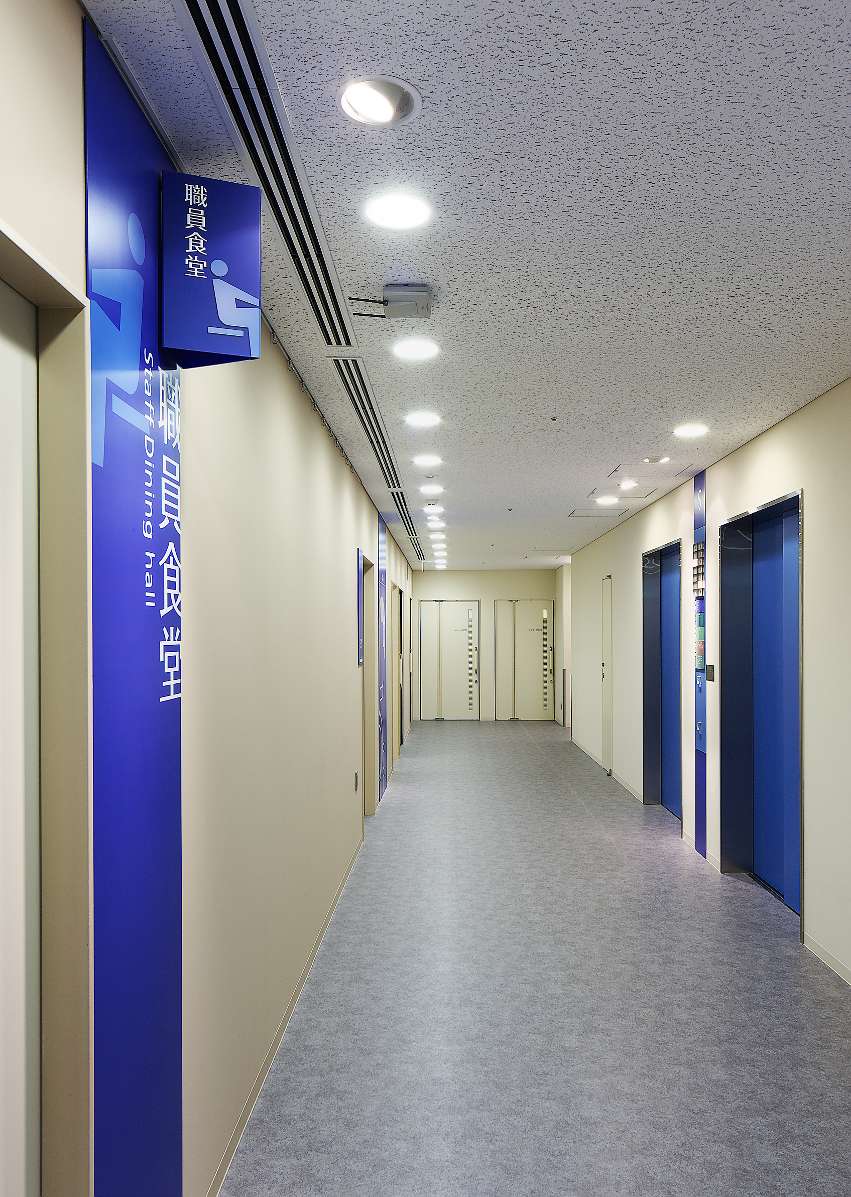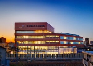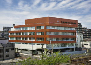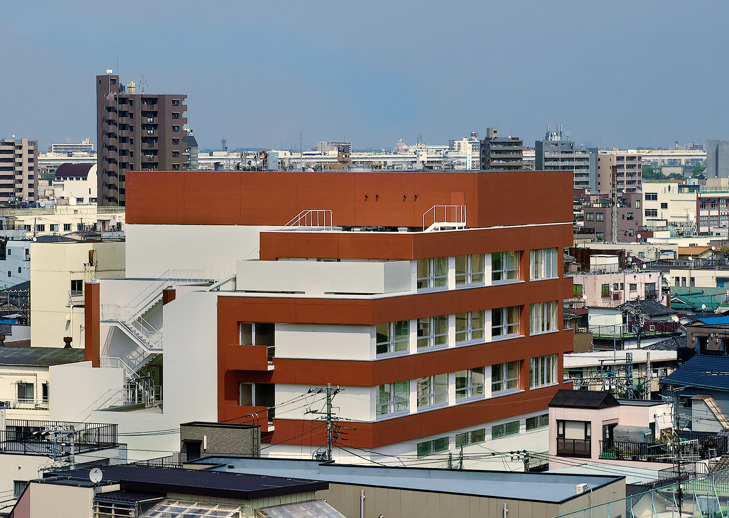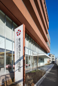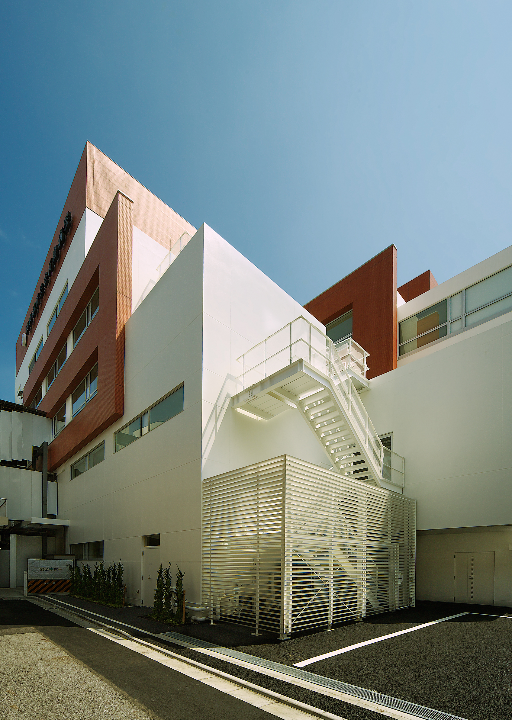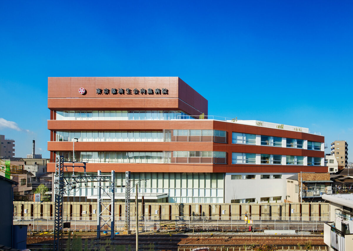 社会的弱者に寄り添う「済生勅語」の精神を体現する、墨田区北部の内科系基幹病院である。鉄道高架に寄り添うように積層したテラコッタ色の水平帯が、下町のスカイラインに新たな輪郭を与え、夜間には大きな行灯のように街と患者をやさしく照らす。狭隘な道路と敷地条件のもと、既存棟を稼働させながら段階的に建替える計画とし、低層部に外来と救急、高層部に病棟とスタッフエリアを重ねて効率的な動線を組み立てた。ハートビル法の容積緩和を活用して余裕あるホワイエや待合を確保し、明快なサイン計画と木質仕上げ、洗面・トイレ付きの病室が、誰にとっても迷いにくく、尊厳ある療養環境をつくり出している。最上階には下町の景を一望する食堂とリハビリテラスを置き、入院生活のなかに日常の時間と地域とのつながりを取り戻している。都市型病院としての機能性と、済生会らしい温かい公共性を一体にした新しい街の医療拠点である。