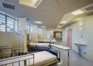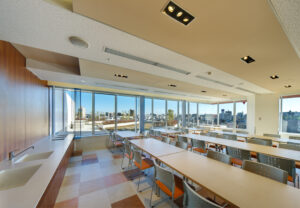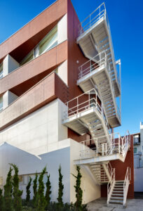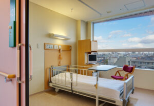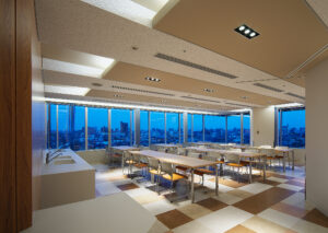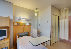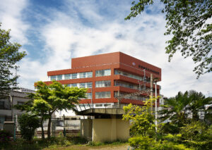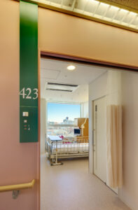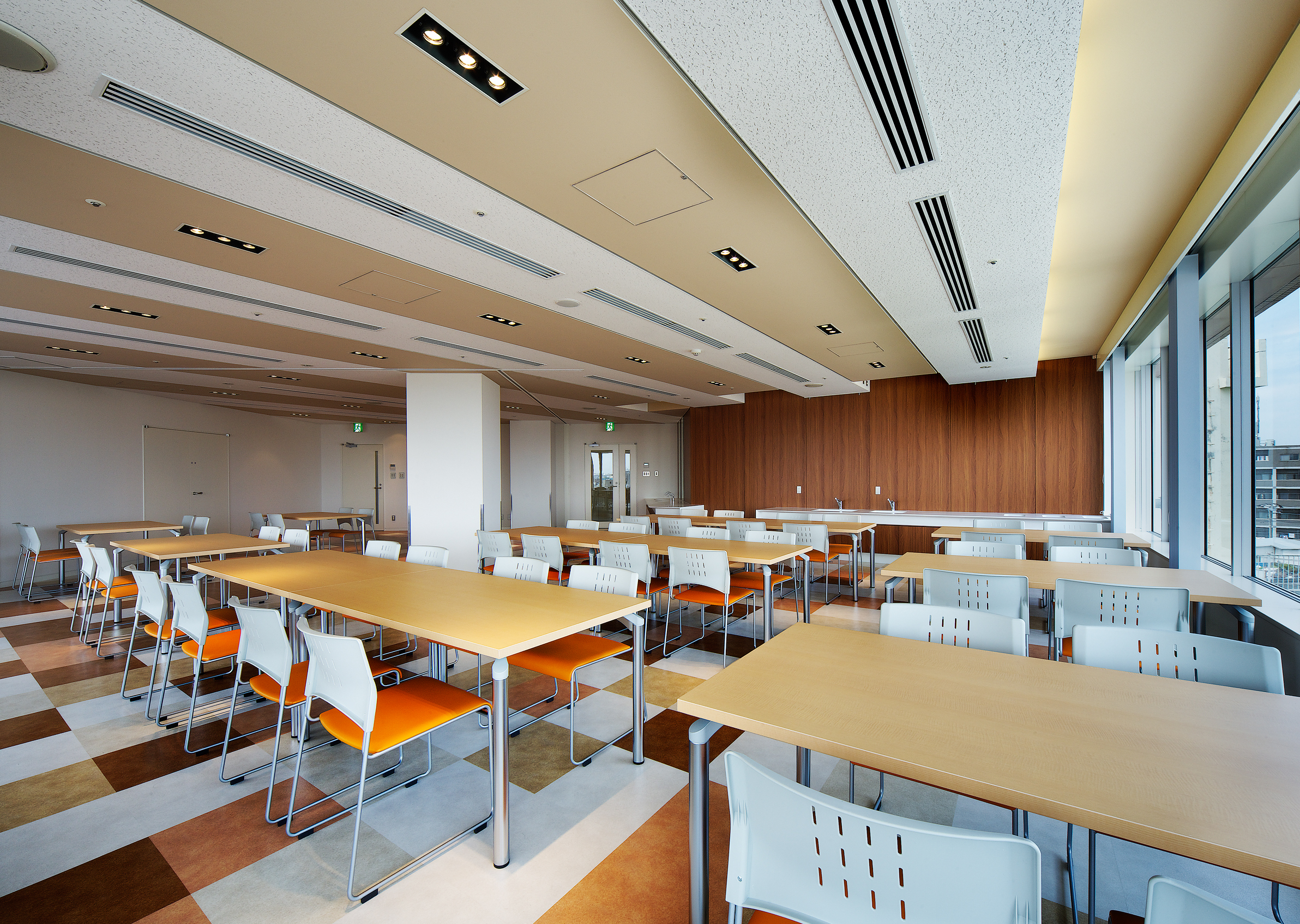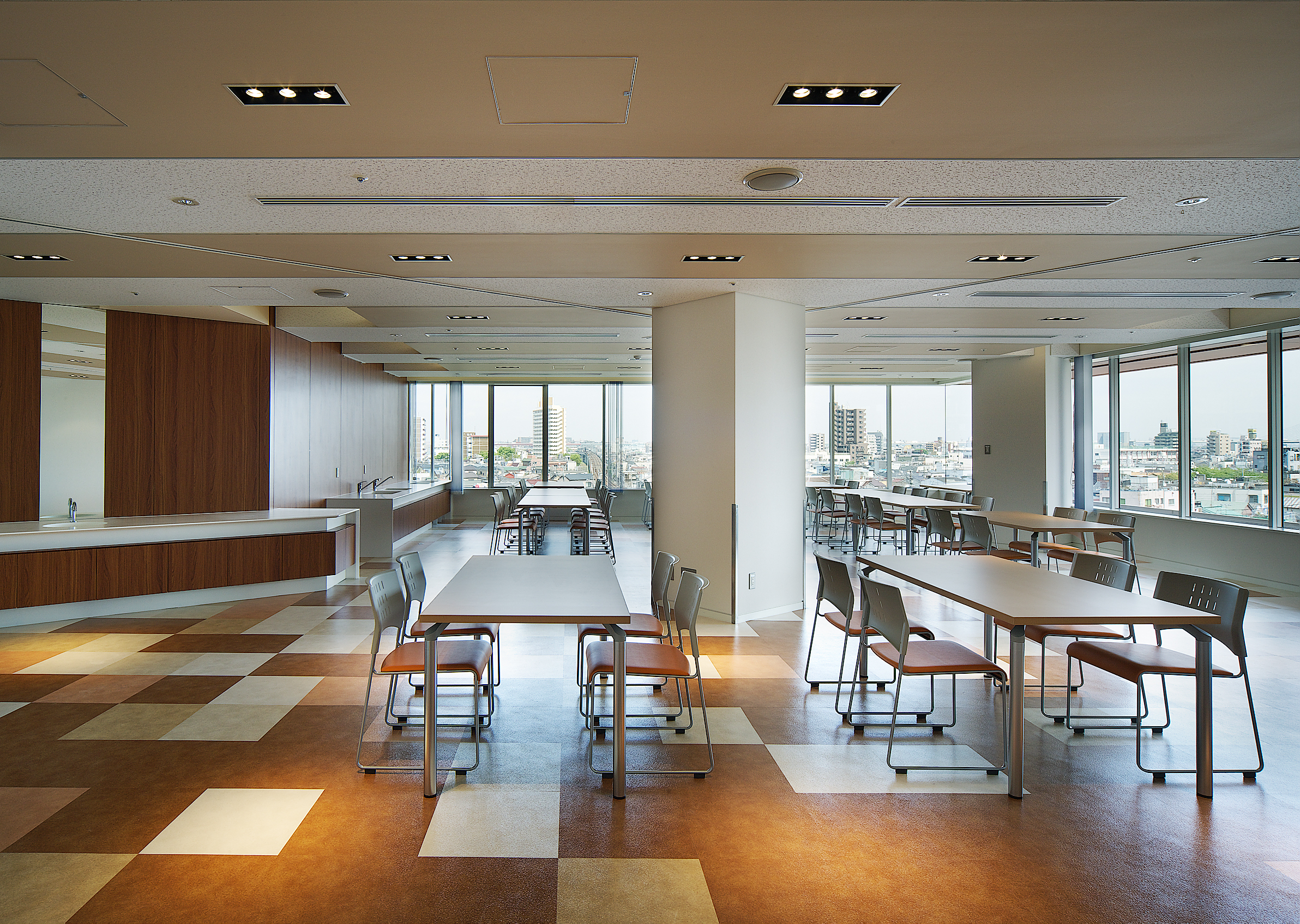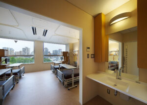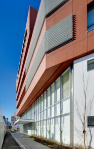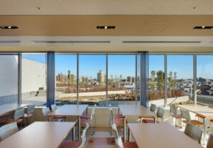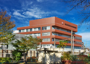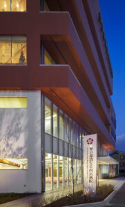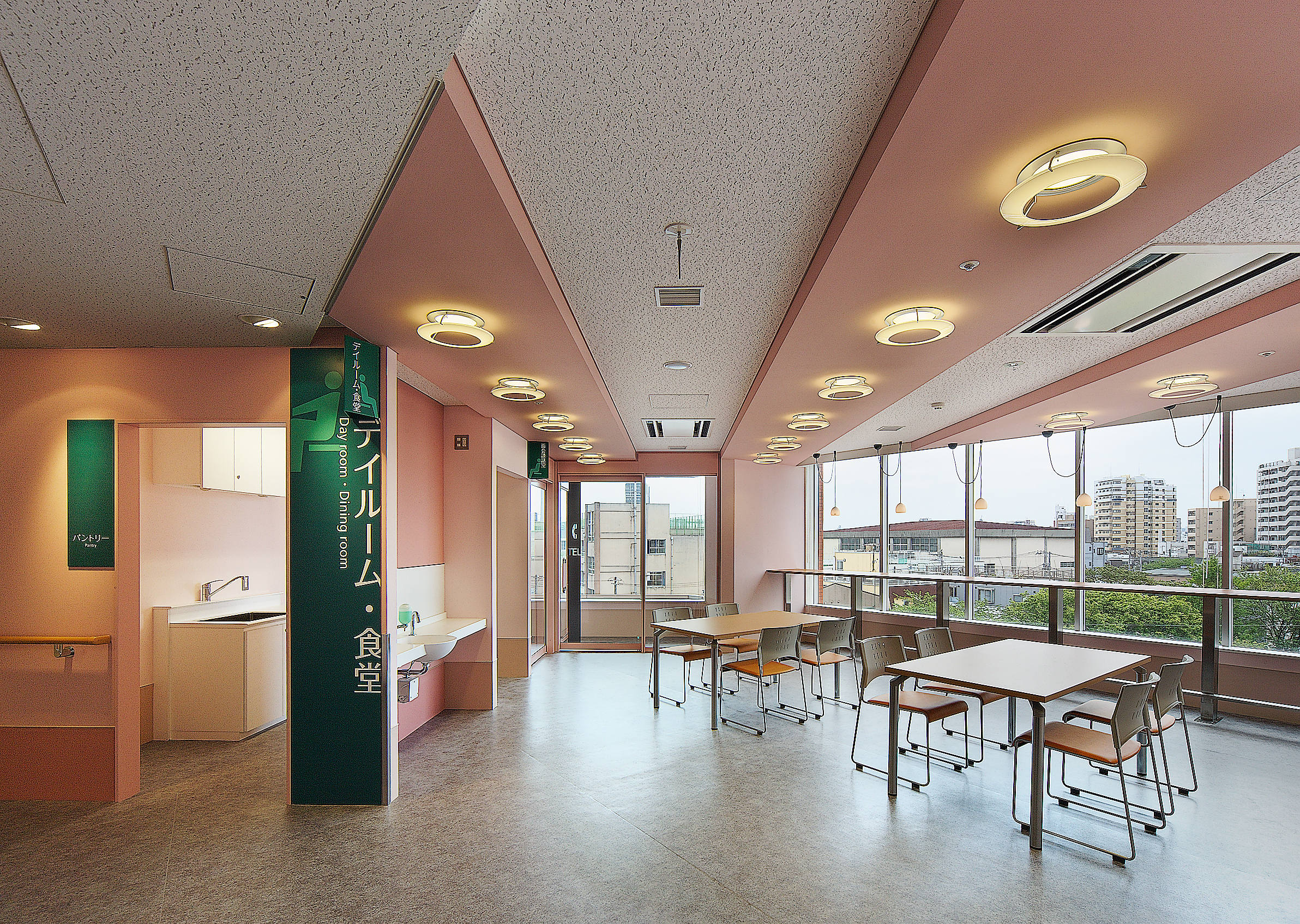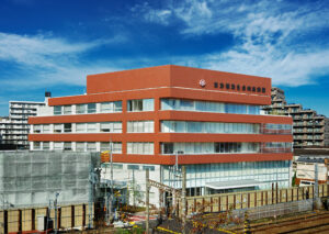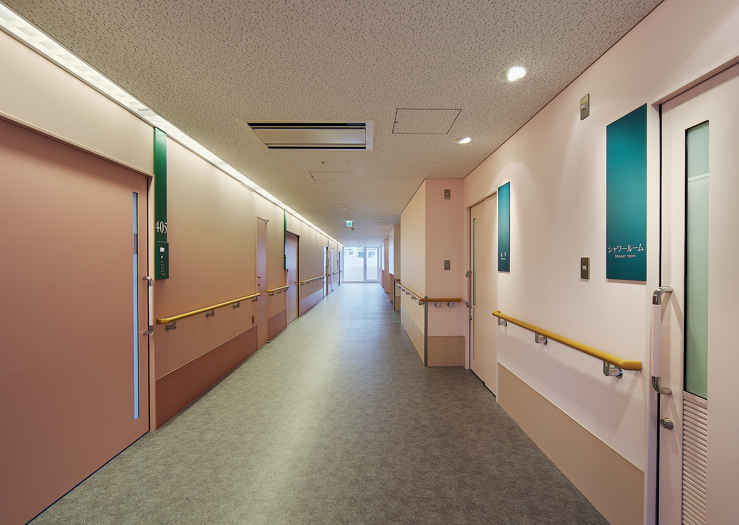 社会的弱者に寄り添う「済生勅語」の精神を体現する、墨田区北部の内科系基幹病院である。鉄道高架に寄り添うように積層したテラコッタ色の水平帯が、下町のスカイラインに新たな輪郭を与え、夜間には大きな行灯のように街と患者をやさしく照らす。狭隘な道路と敷地条件のもと、既存棟を稼働させながら段階的に建替える計画とし、低層部に外来と救急、高層部に病棟とスタッフエリアを重ねて効率的な動線を組み立てた。ハートビル法の容積緩和を活用して余裕あるホワイエや待合を確保し、明快なサイン計画と木質仕上げ、洗面・トイレ付きの病室が、誰にとっても迷いにくく、尊厳ある療養環境をつくり出している。最上階には下町の景を一望する食堂とリハビリテラスを置き、入院生活のなかに日常の時間と地域とのつながりを取り戻している。都市型病院としての機能性と、済生会らしい温かい公共性を一体にした新しい街の医療拠点である。