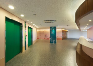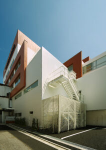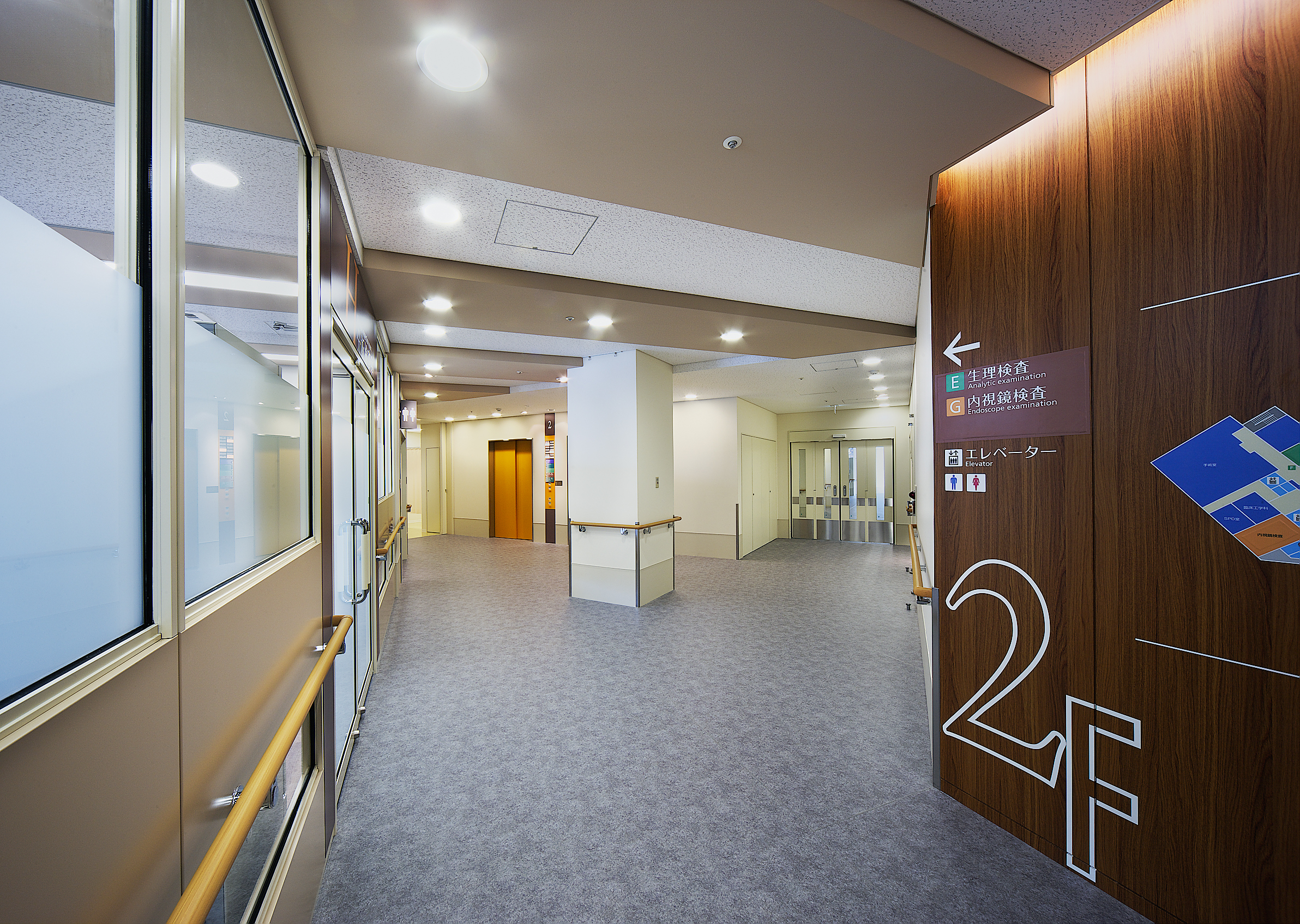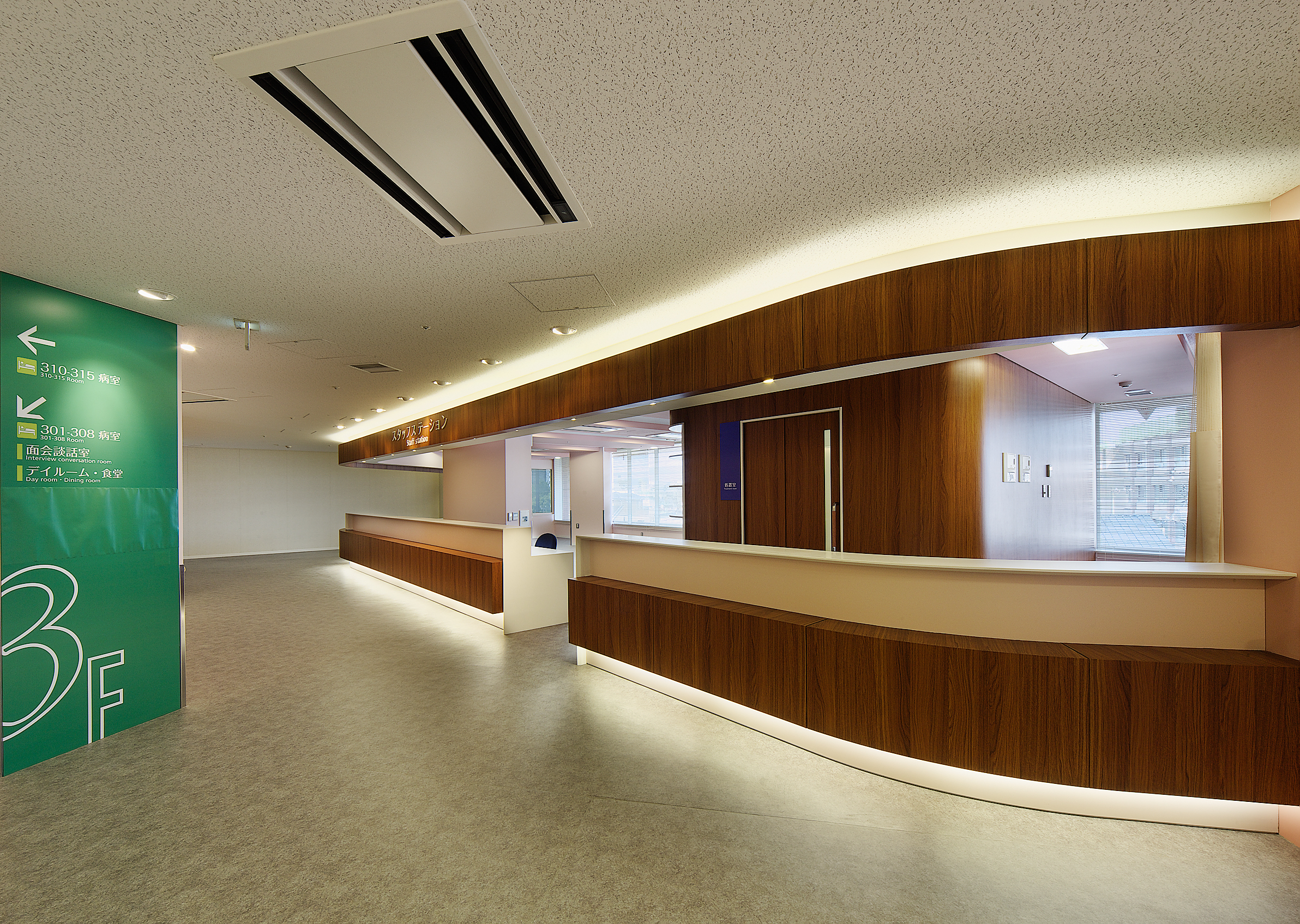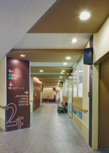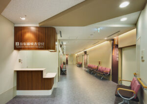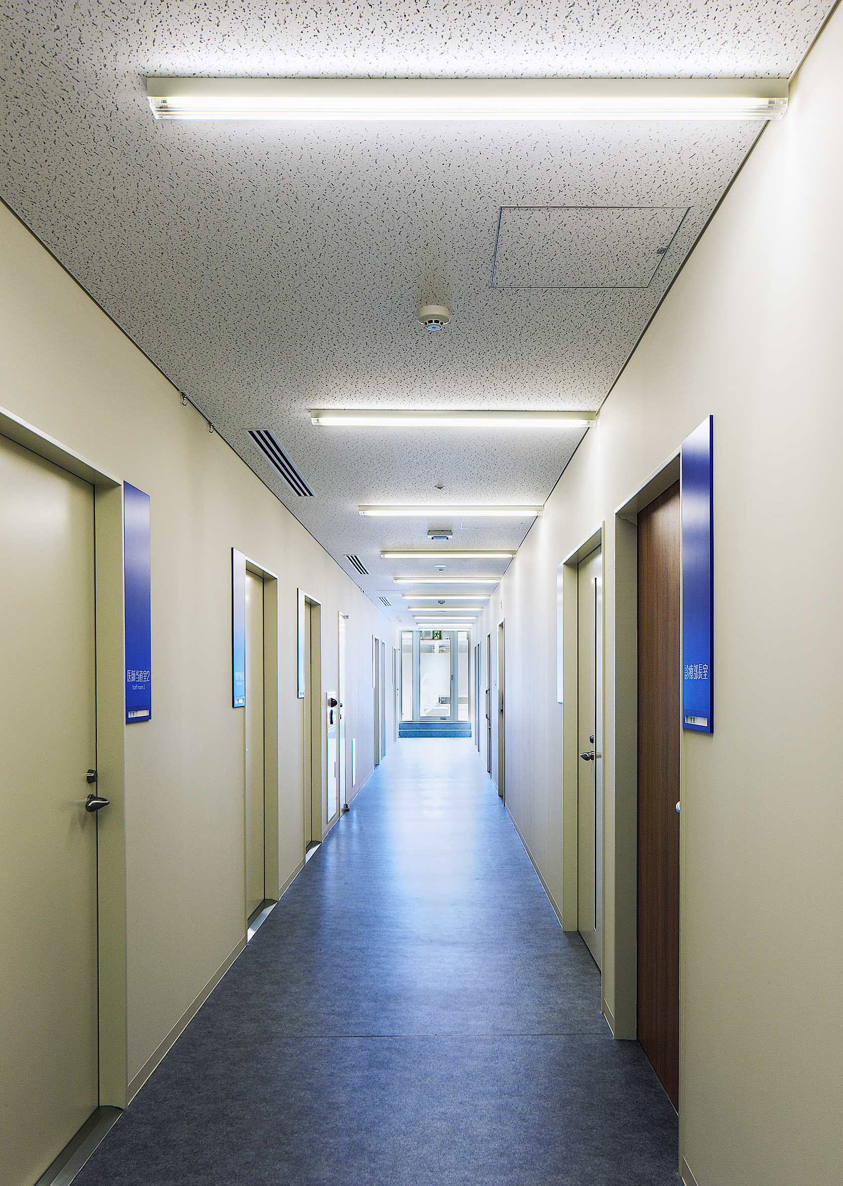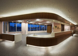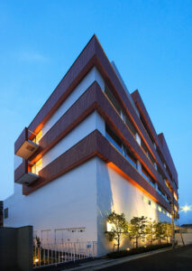 向島という都市的な文脈の中に建つ本病院は、医療施設に求められる機能性と、街に対して開かれた表情の両立を意図して計画されている。建物全体は水平性を強調した構成とし、各階のボリュームを積層させることで、スケールの大きな建築でありながら周辺環境に対して過度な圧迫感を与えない外観としている。ファサードには開口部と壁面のリズムを丁寧に整理し、昼夜を通して安定感のある佇まいを形成した。夜間には内部の活動が柔らかな光として外部ににじみ出ることで、病院特有の閉鎖性を和らげ、地域に安心感をもたらす存在となっている。医療の場としての信頼性と、都市の一部としての親和性を両立させることを目指した外観計画である。
