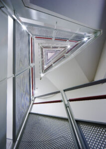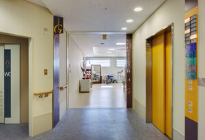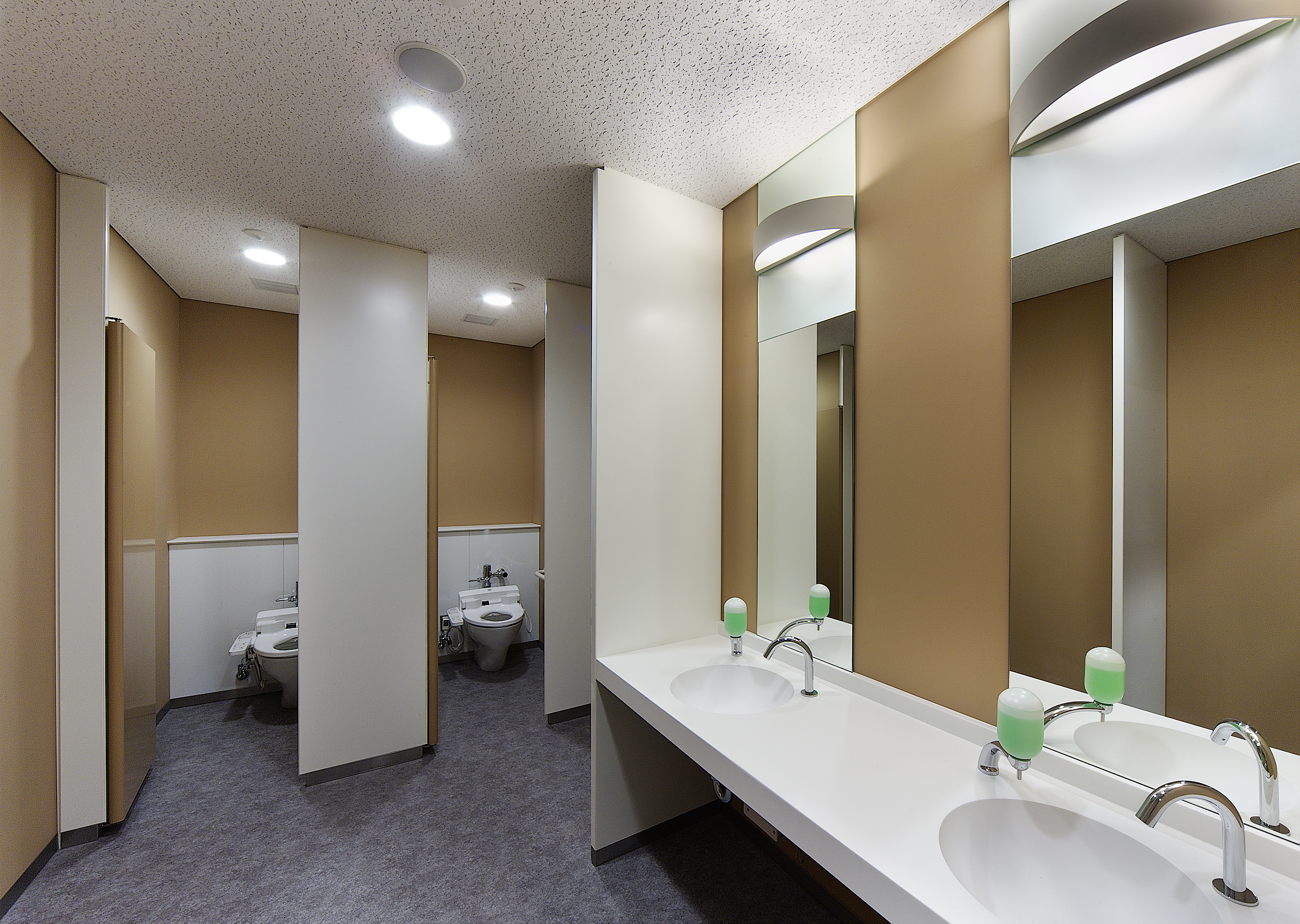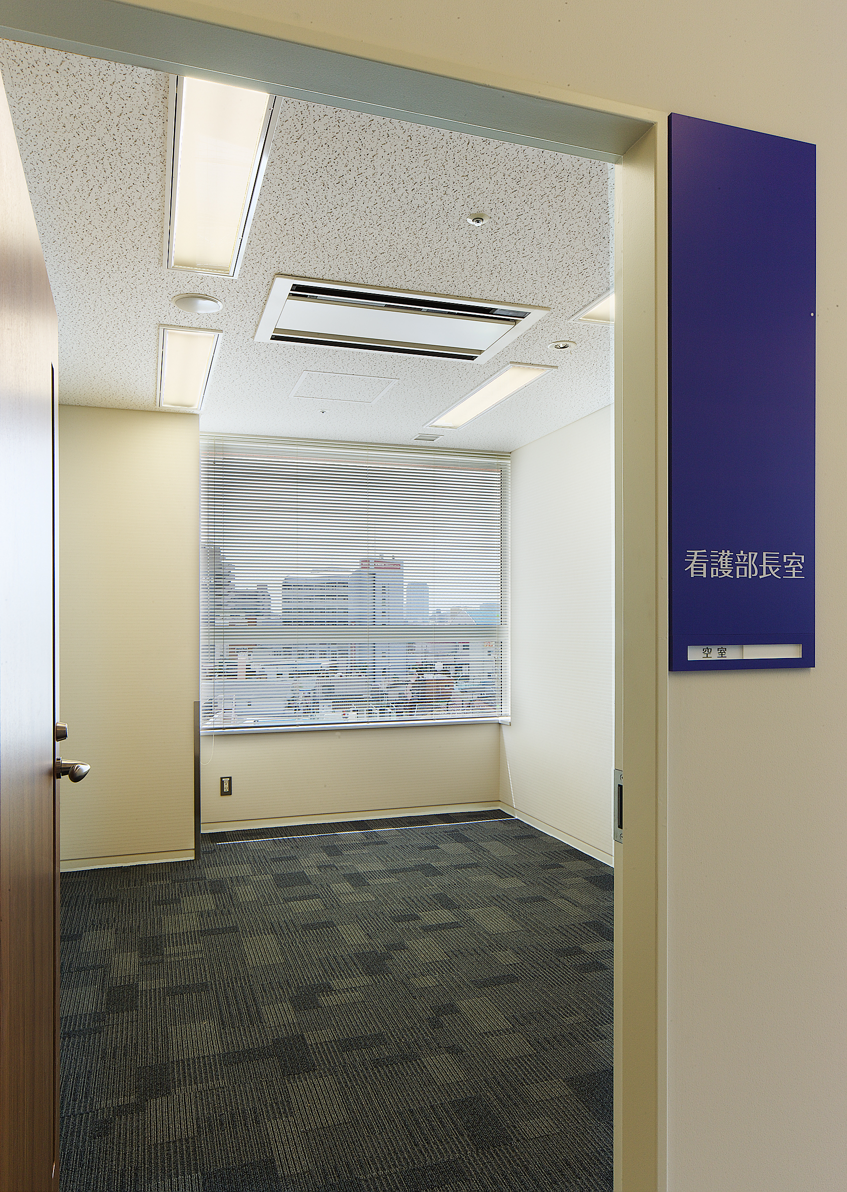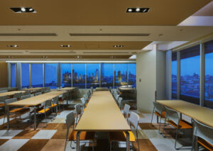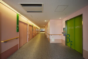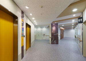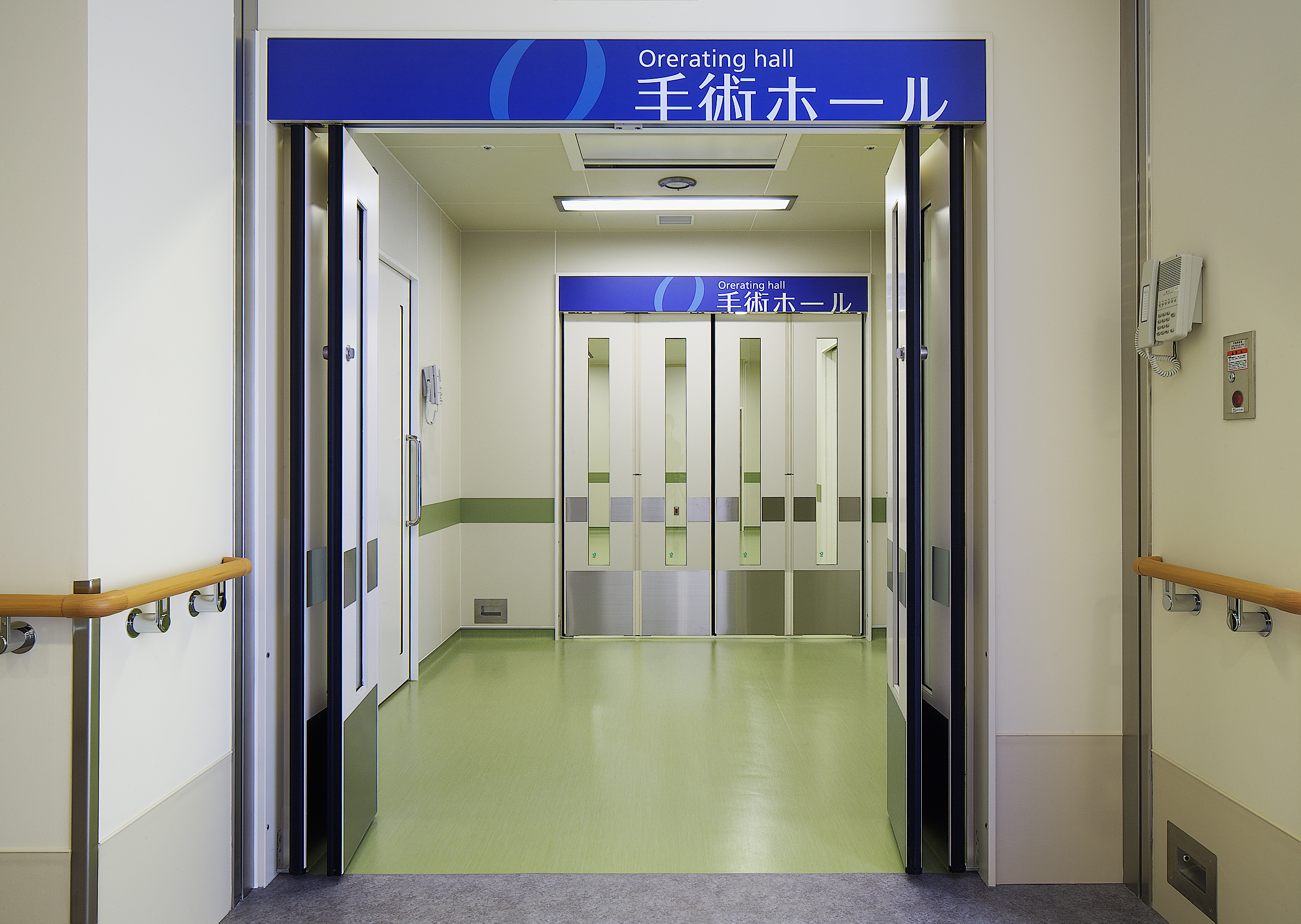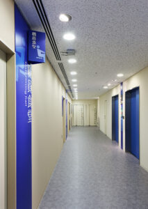向島という都市的な文脈の中に建つ本病院は、医療施設に求められる機能性と、街に対して開かれた表情の両立を意図して計画されている。建物全体は水平性を強調した構成とし、各階のボリュームを積層させることで、スケールの大きな建築でありながら周辺環境に対して過度な圧迫感を与えない外観としている。ファサードには開口部と壁面のリズムを丁寧に整理し、昼夜を通して安定感のある佇まいを形成した。夜間には内部の活動が柔らかな光として外部ににじみ出ることで、病院特有の閉鎖性を和らげ、地域に安心感をもたらす存在となっている。医療の場としての信頼性と、都市の一部としての親和性を両立させることを目指した外観計画である。