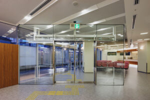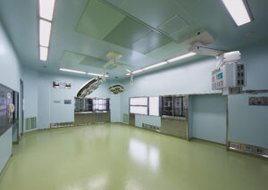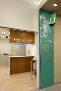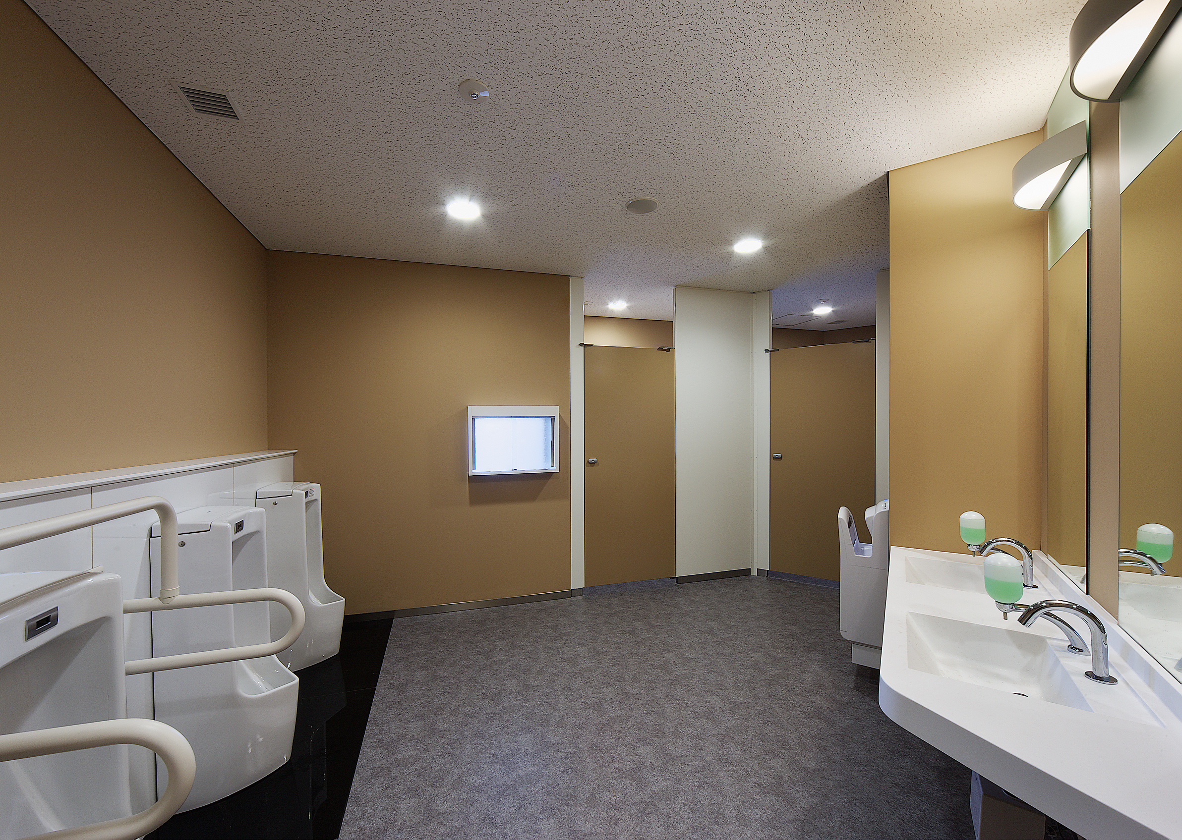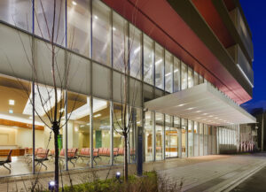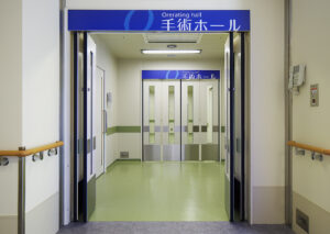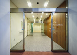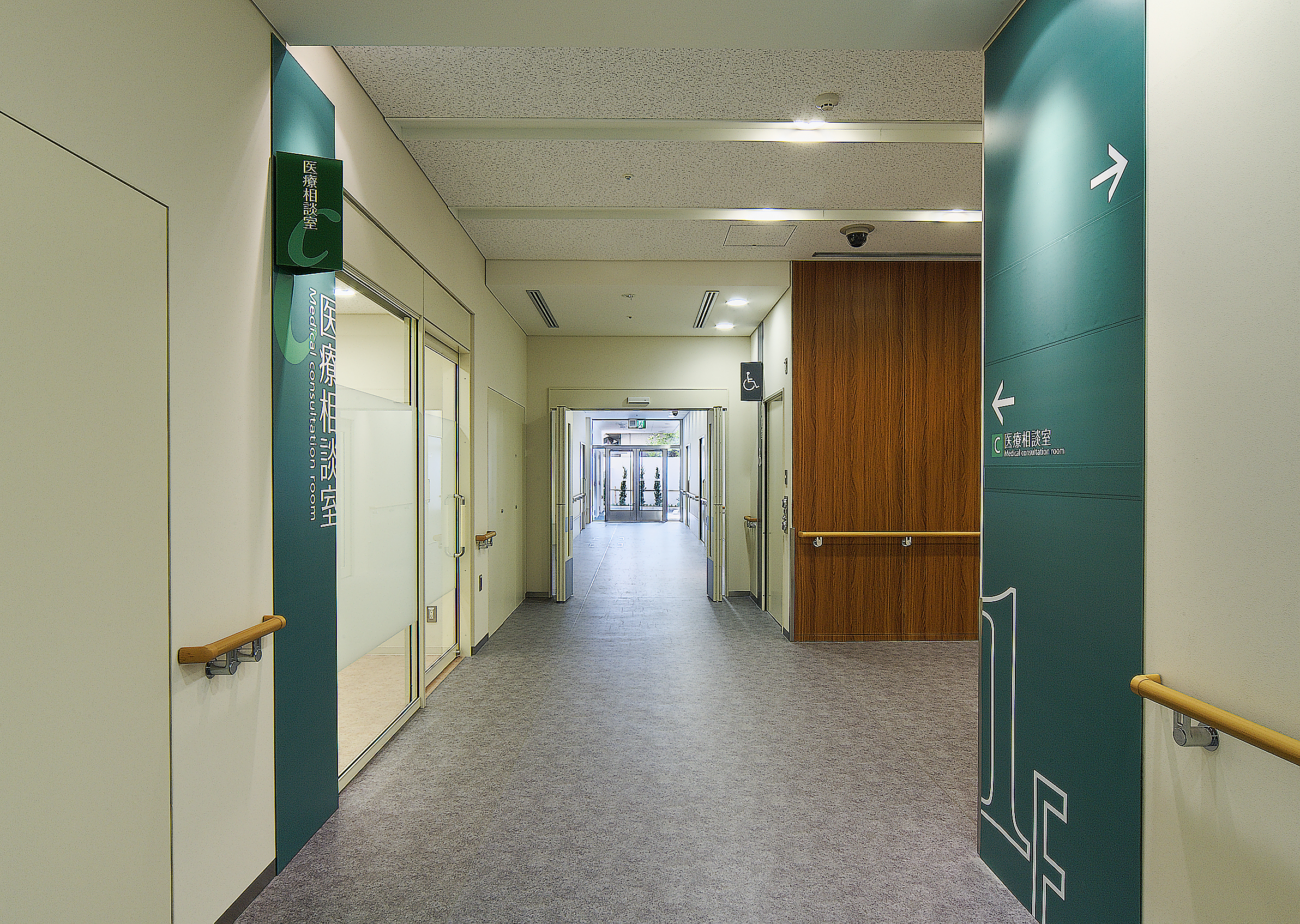本病院の外観は、医療施設に求められる機能性と安心感を前提としながら、夜間においても街と穏やかに関係を結ぶ佇まいを意図して計画している。低層部にはガラス面を大きく設け、待合や動線といった内部の様子が外部からやわらかく感じ取れる構成とすることで、閉鎖的になりがちな病院建築に対して開放的な印象を与えている。エントランスまわりに張り出した庇は、明確な居場所性をつくり出すと同時に、歩行者スケールに配慮した外部空間を形成する役割を担っている。夜間には内部の光が均質ににじみ出ることで、建物全体が過度に主張することなく、地域に寄り添う存在として街に立ち現れる。医療の場としての信頼性と、都市の一部としての親和性を両立させることを目指した外観計画である。