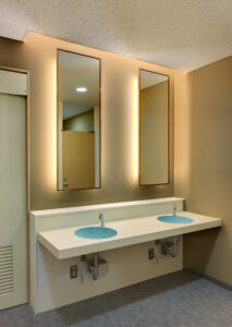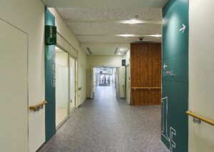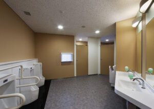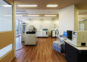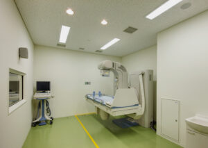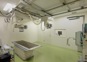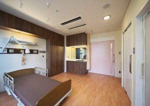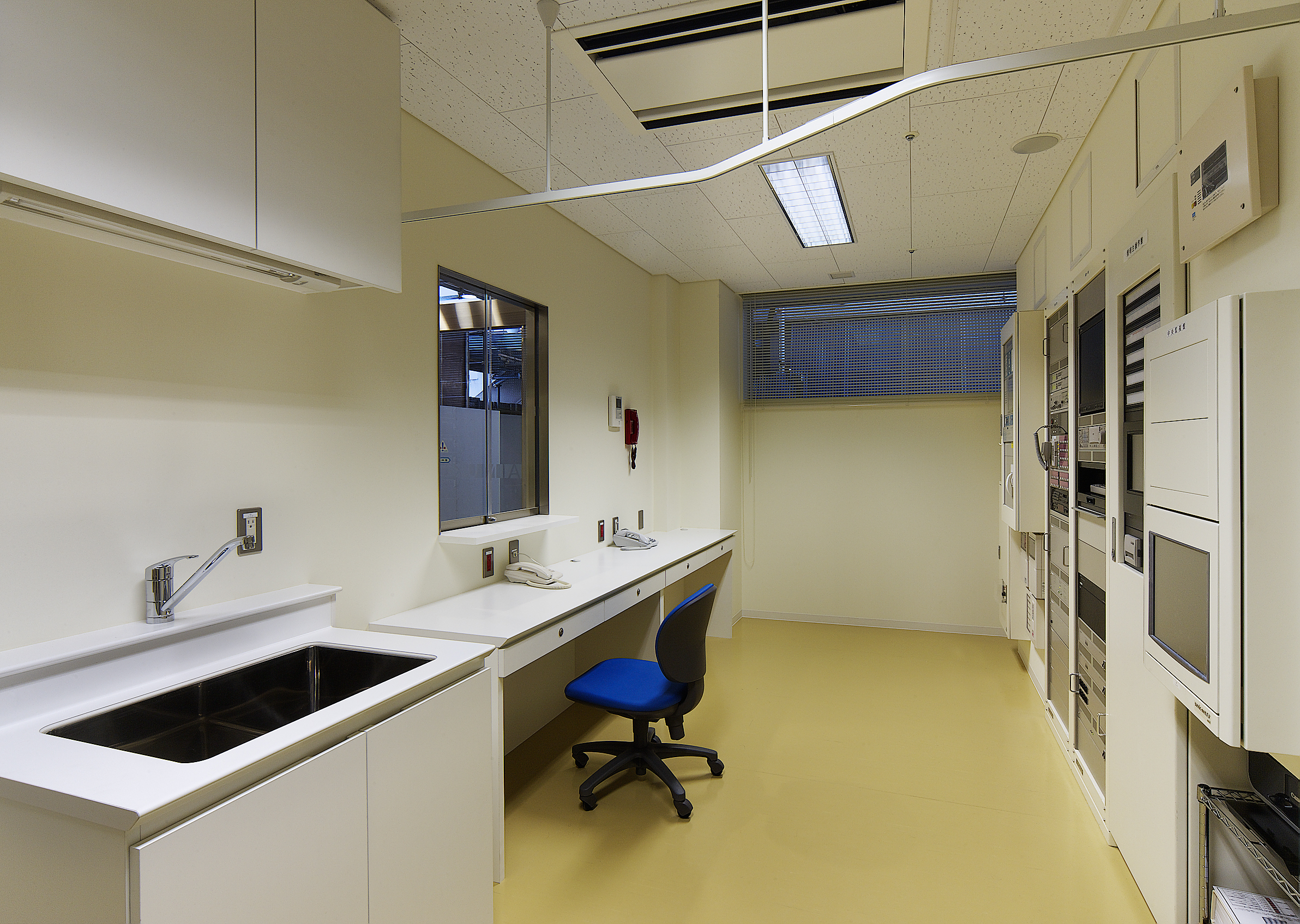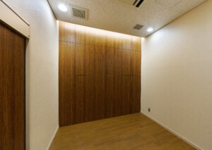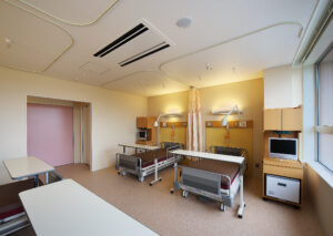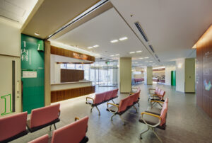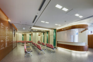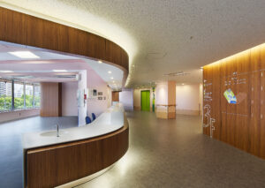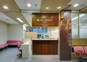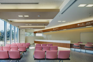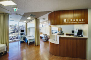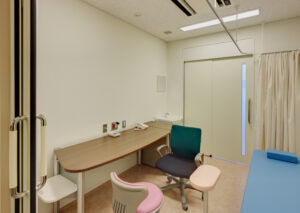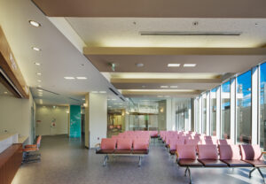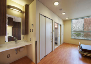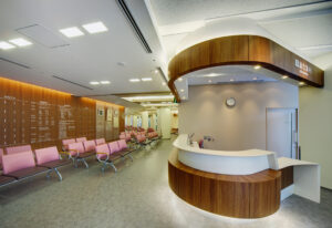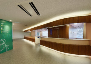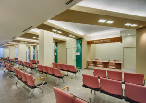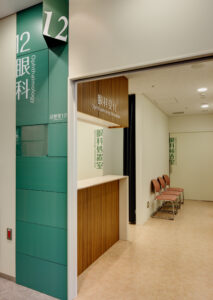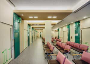 診療部門の内部空間は、医療施設に求められる機能性を確保しながら、利用者が過度な緊張を感じることなく滞在できる環境づくりを重視して計画している。受付や検査スペースは、見通しのよい構成とし、動線が直感的に理解できるよう整理した。待合空間には大きな開口を設け、外部からの自然光を積極的に取り込むことで、時間を過ごす場としての明るさと開放感を確保している。内装には木調の仕上げを随所に用い、無機質になりがちな医療空間にやわらかな表情を与えた。曲線的なカウンターや天井の構成は、人の動きに寄り添いながら空間全体に連続性をもたらしている。診療、待機、移動といった異なる行為が無理なく重なり合うことで、医療の場としての秩序と、日常に近い落ち着きを併せ持つ内部空間を実現している。
