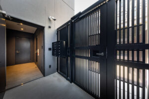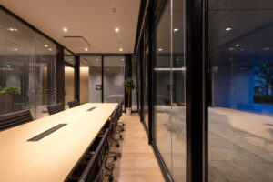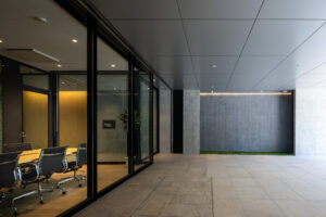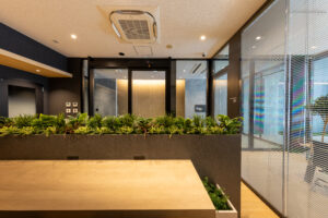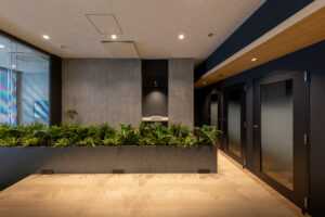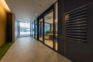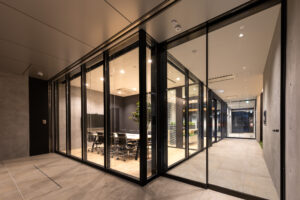 写真の空間は、明るい木目フローリングと木質天井があたたかさを与え、中央のカウンターテーブルと植栽がくつろぎと視線の抜けをつくっている。ガラス間仕切りで明るさと広がりを確保し、黒フレームが空間を引き締め洗練された印象。開放的なガラス面を広く儲け、オープンでありながら落ち着いた雰囲気があり、入居者や来訪者を迎えるエントランスラウンジとしても心地よく機能する造りとなっている。
