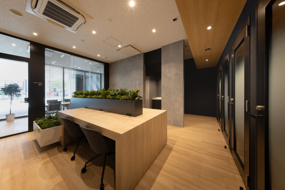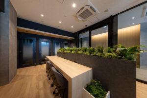 エントランス横に設けられたシェアラウンジは、ちょっとしたミーティングや気分転換、来客対応などに活用できる共用スペース。固定席から離れてリラックスしながら作業ができ、カフェのような心地よさを加えている。アイデア出しや社内コミュニケーションの場としても機能し、働く人同士の自然な交流を生む。さらに共用会議室とテレカンブースを設けることで、専有スペースでけでなく、共用スペースも効率的に使える。必要なときに予約して利用できるため、執務スペースを広く確保しながら打合せ環境もしっかり整えられる。