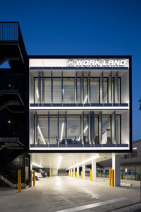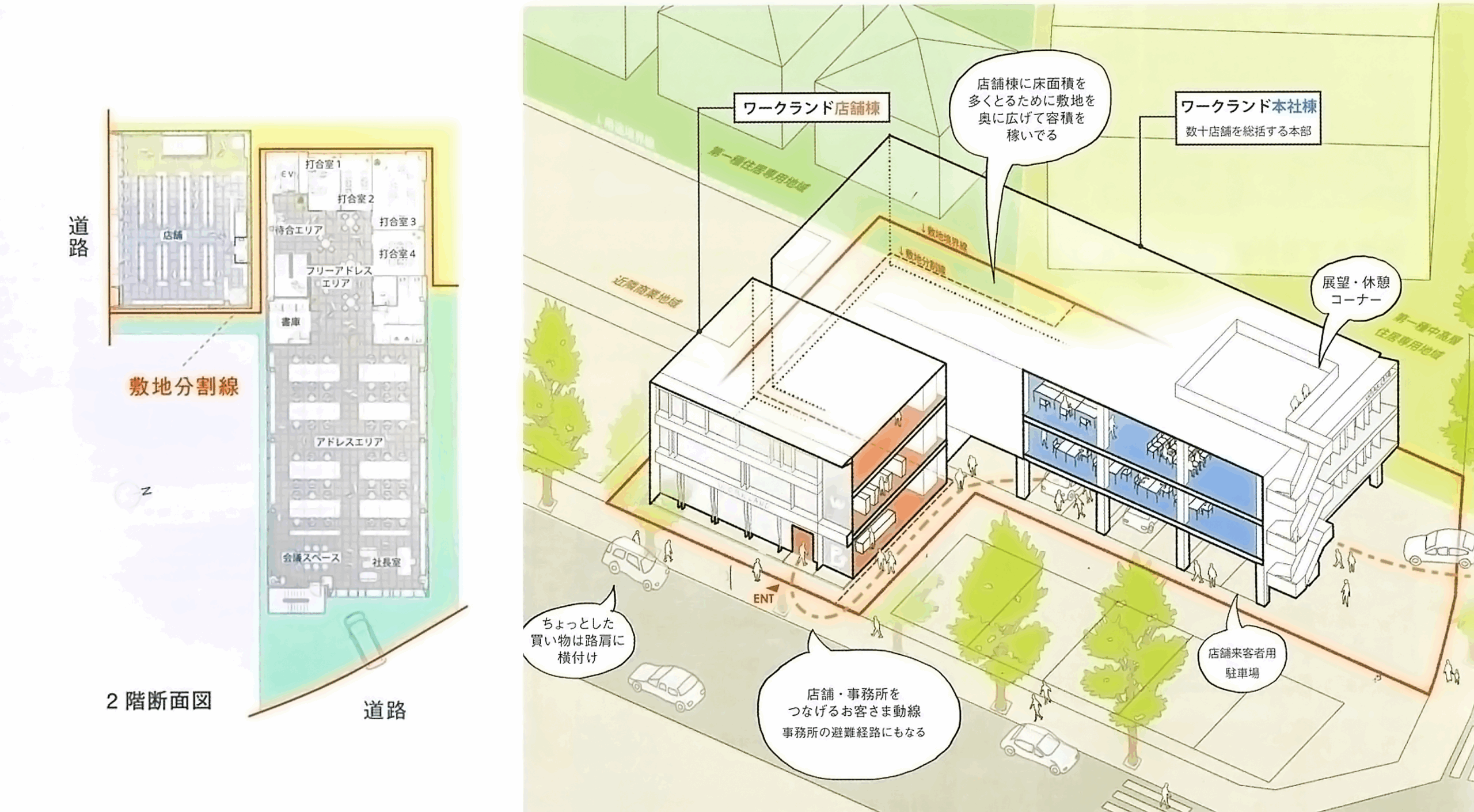 ワークランドの本社ビル+店舗の計画。経済性を重視するクライアントコンセプトに応えるため、