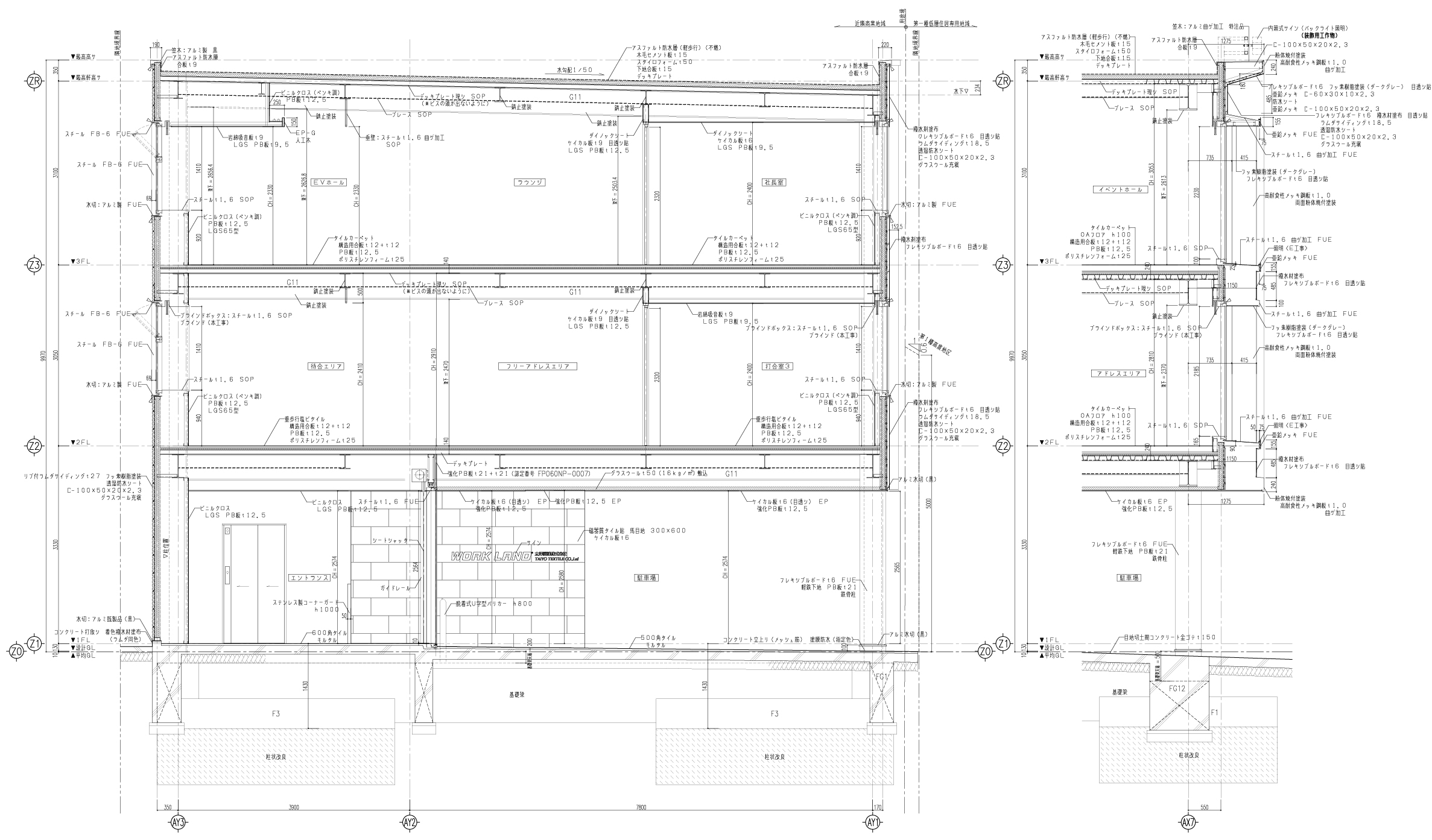 また鉄骨造床はRC合成床板ではなく告示の例示仕様による乾式床を採用し、