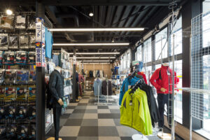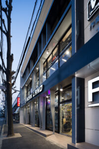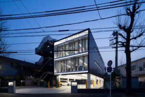 ロードサイドに対して全面ガラスと水平の庇サインを突き出し、走行中の視線を捉える構成としている。黒いフレームで3層を一体に束ね、上階のストックまで含めて商品の量感と活気がそのまま街並みに現れるよう計画した。内部のライン照明は棚と通路を強調し、夜間には建物全体を光るショーケースへと変化させる。周辺の低層店舗街のスケールを保ちながら、ブランド拠点としての存在感を際立たせている。大きく描いた店舗名と駐車場サインは車利用客に分かりやすく、通りからそのまま引き込むゲートとなる。開放的な1階は街路との視線を遮らず、日常の風景の中で働く人と来客の姿が重なり合う、開かれたワークウェアの専門店を目指している。