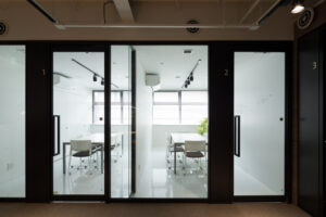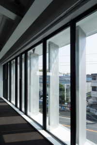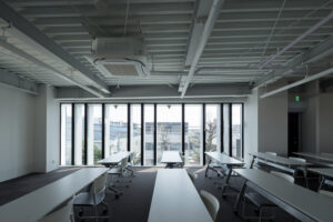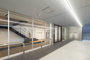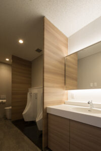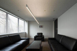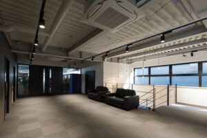 一方仕上げについては質を落とさずアメニティを確保し、内装では事務所でありながら