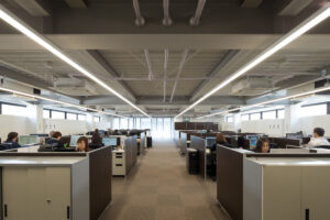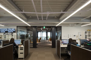 一方、床のカーペットや木目の壁仕上げ、木製チェアの素材感によって温かみを添え、硬質になりがちな職場に“居心地のよさ”を生み出している。