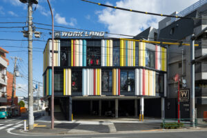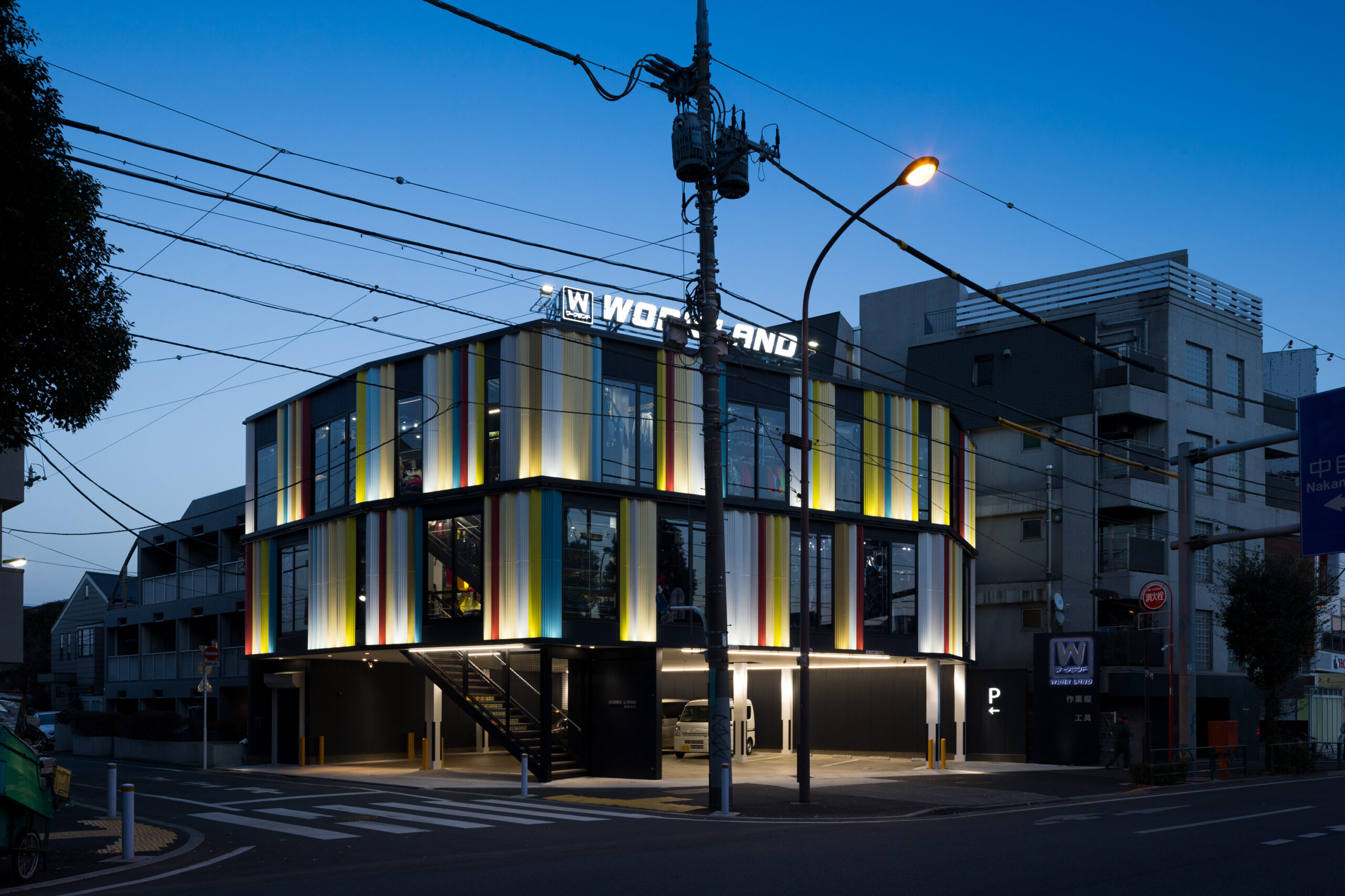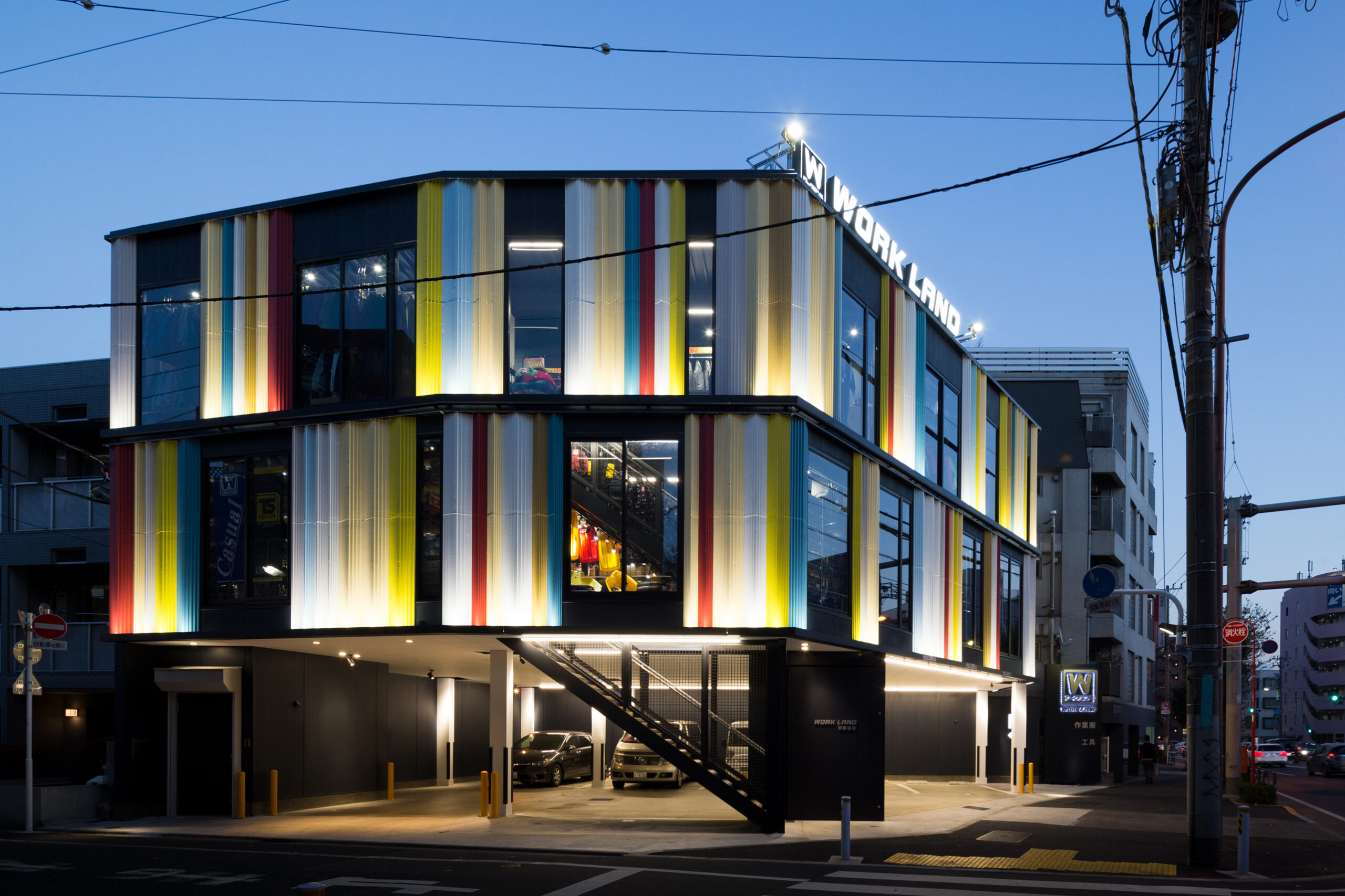 東京都世田谷区の角地に位置するワークランド世田谷店。1階はピロティ形状の駐車場とし、2・3階に店舗を計画。