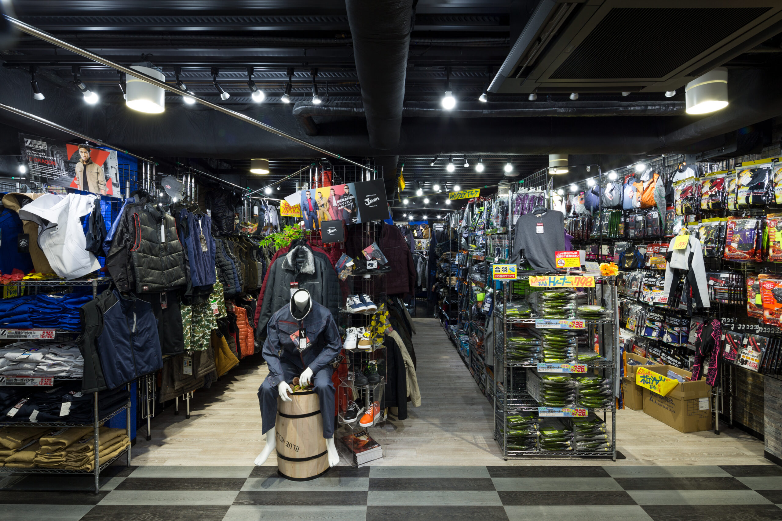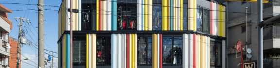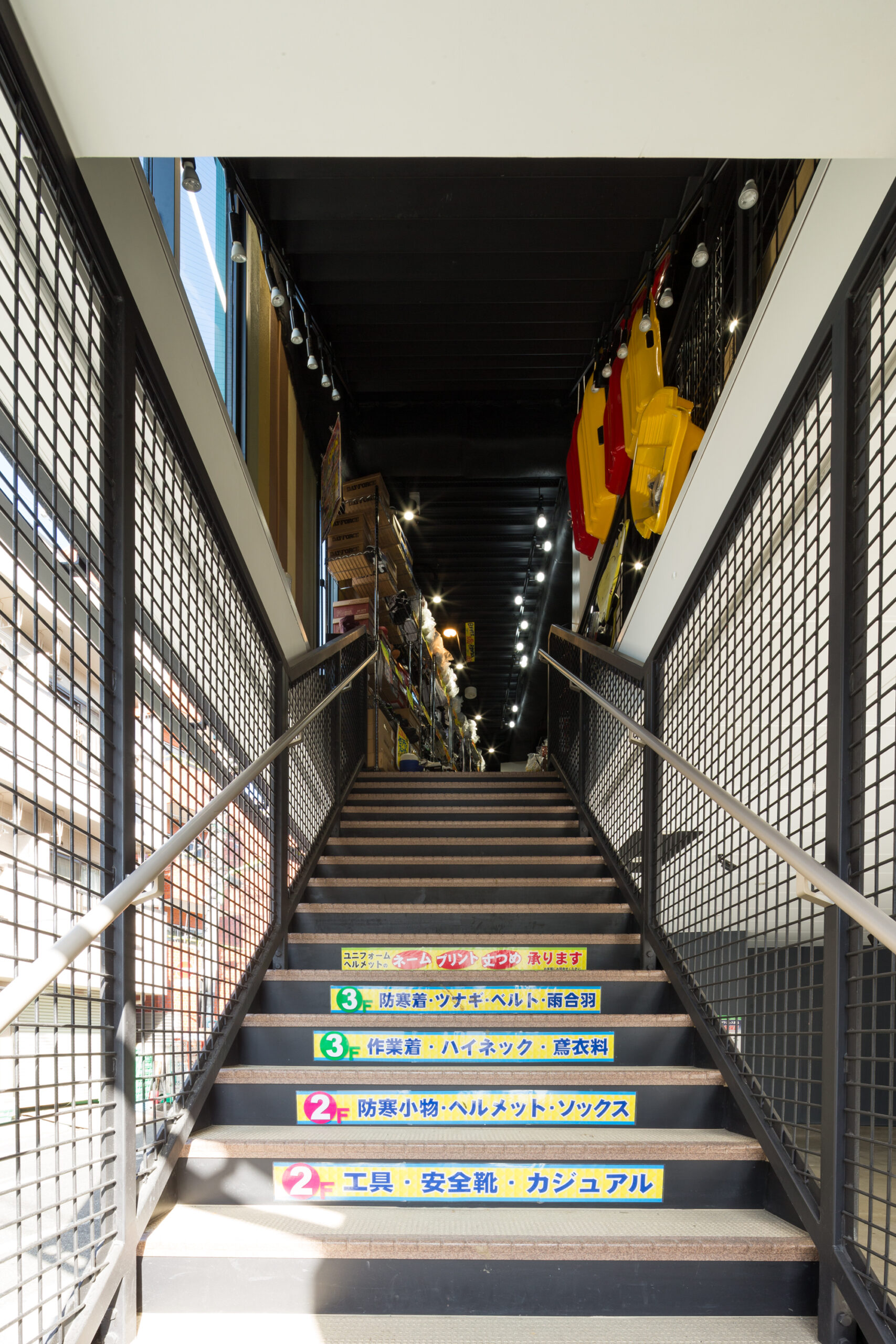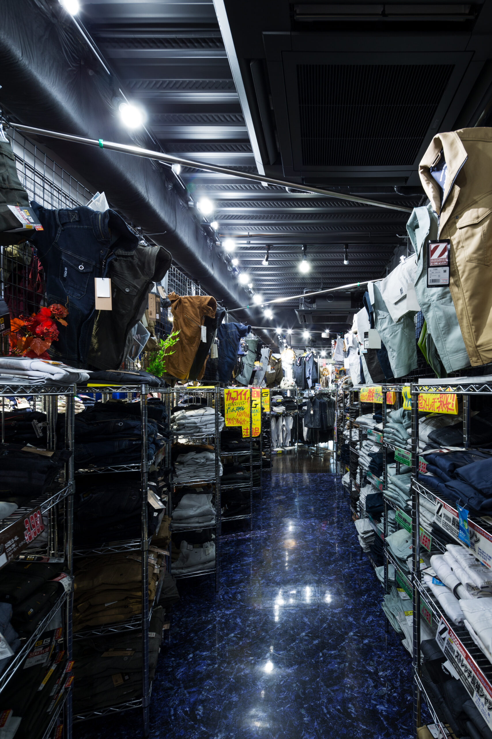 単なる「作業服店」という枠組みを超え、多様な職種や個性が集まる様子を、色彩豊かな縦のライン(アルデコ)で表現。